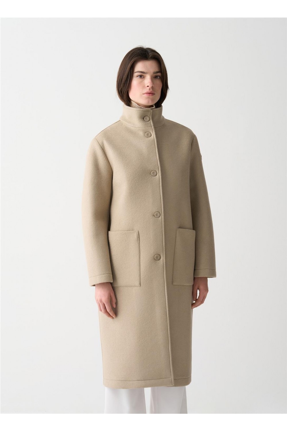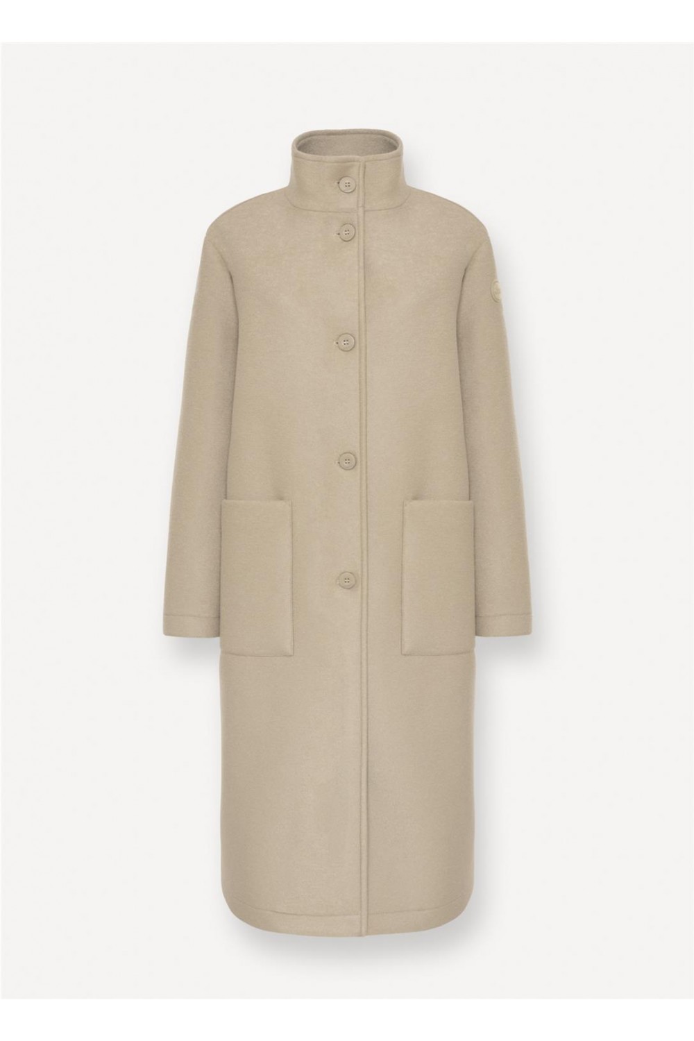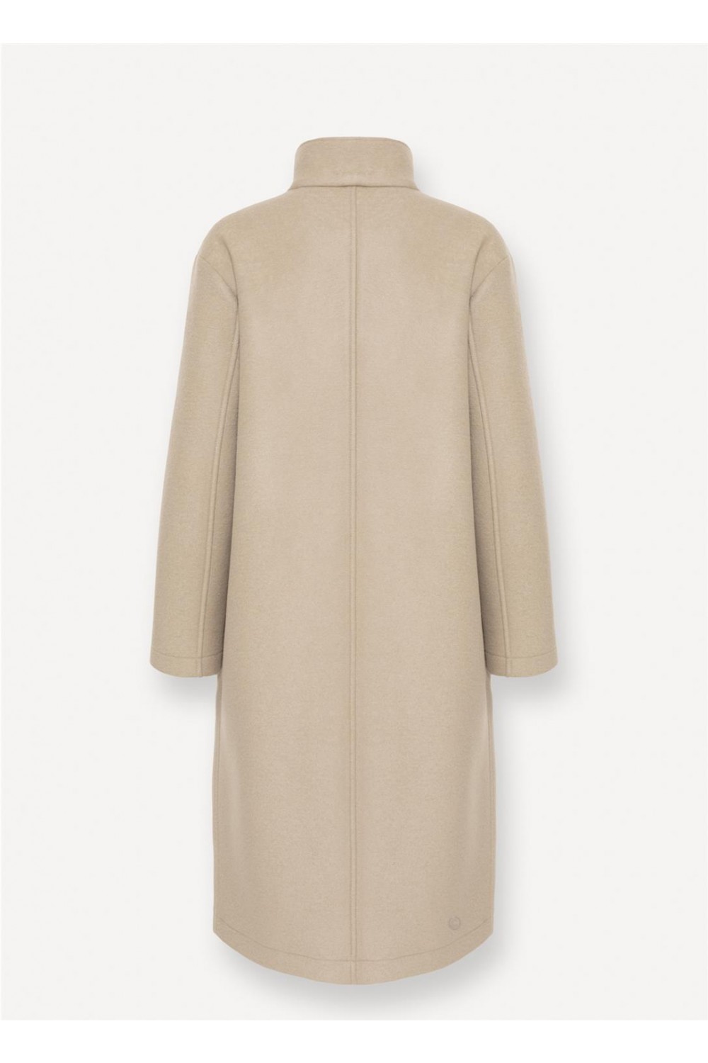 Abrigo largo en un suave camel, manga ligeramente caída, con abotonadura sencilla y cuello alto. Bolsos plastón. Composición: 60 % poliéster + 25 % acrílico + 12 % lana virgen + 3 % elastano.