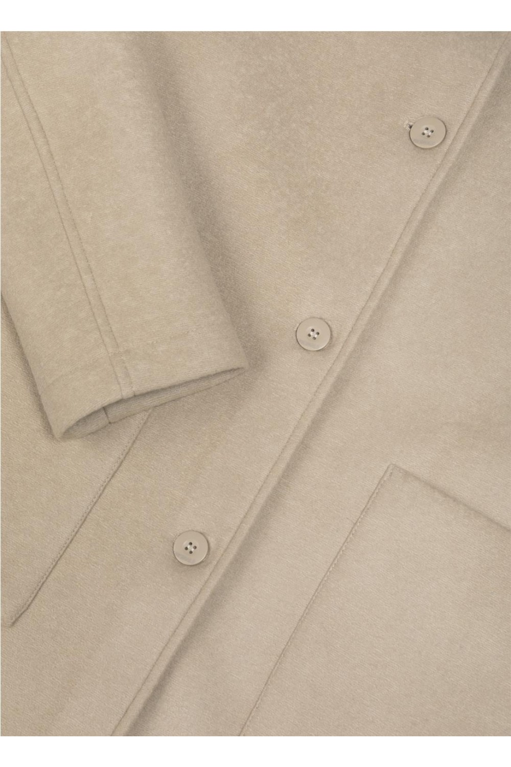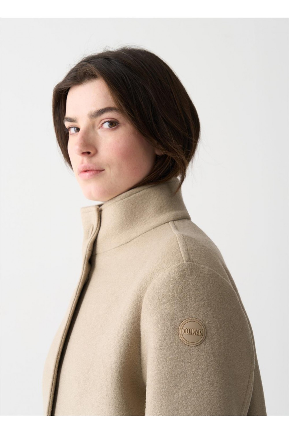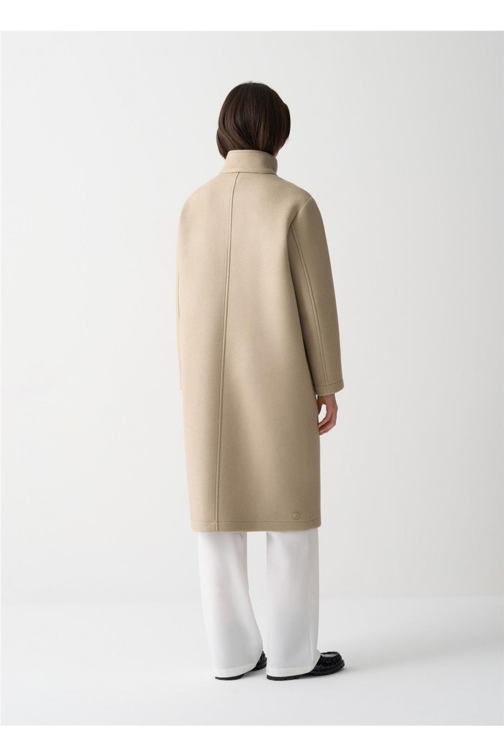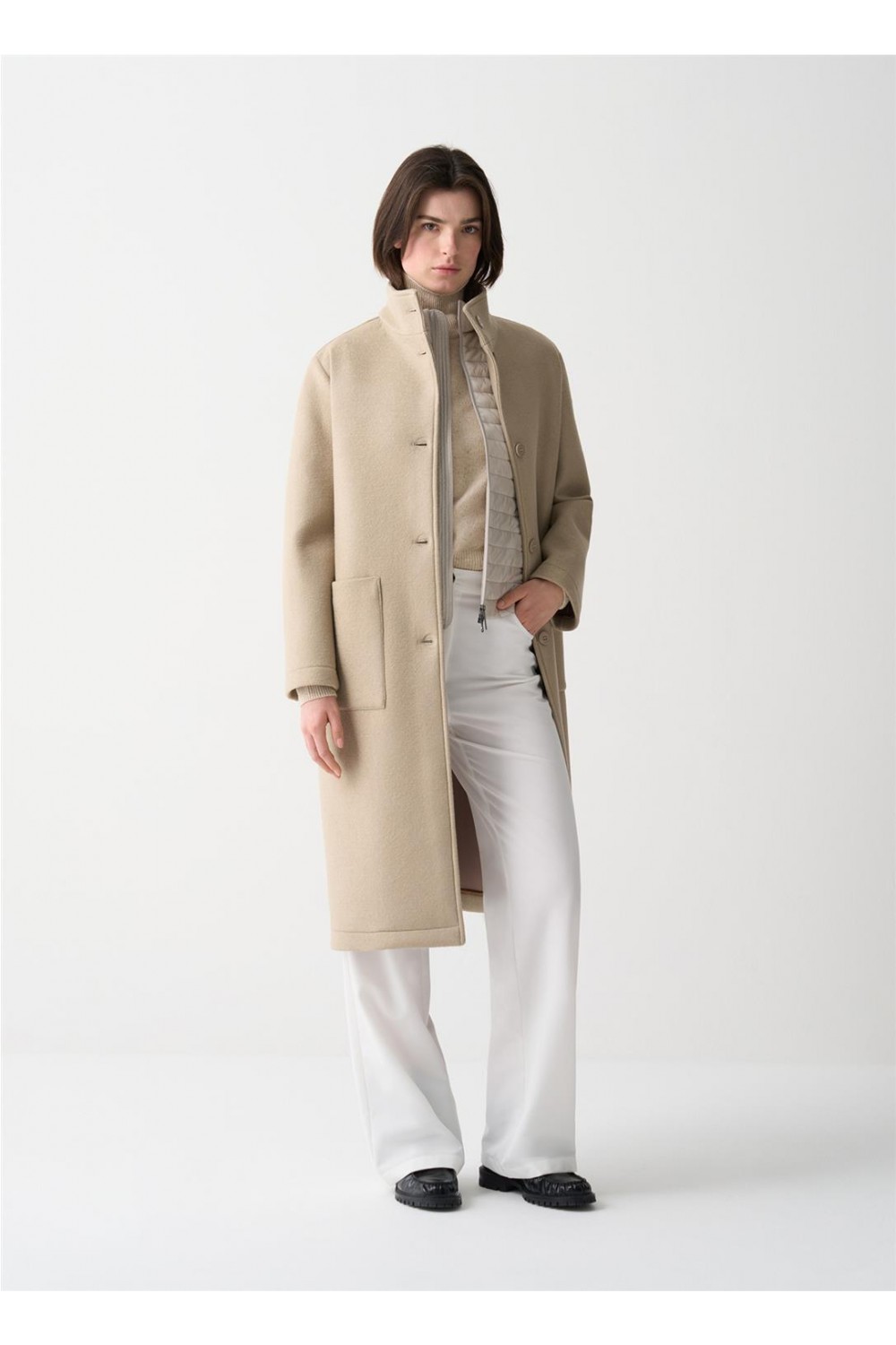 Abrigo largo en un suave camel, manga ligeramente caída, con abotonadura sencilla y cuello alto. Bolsos plastón. Composición: 60 % poliéster + 25 % acrílico + 12 % lana virgen + 3 % elastano.