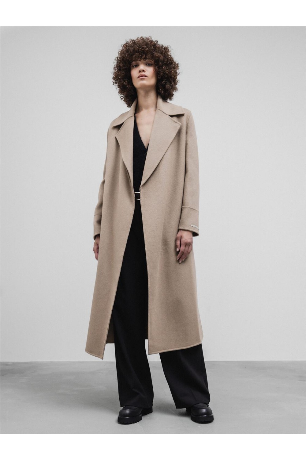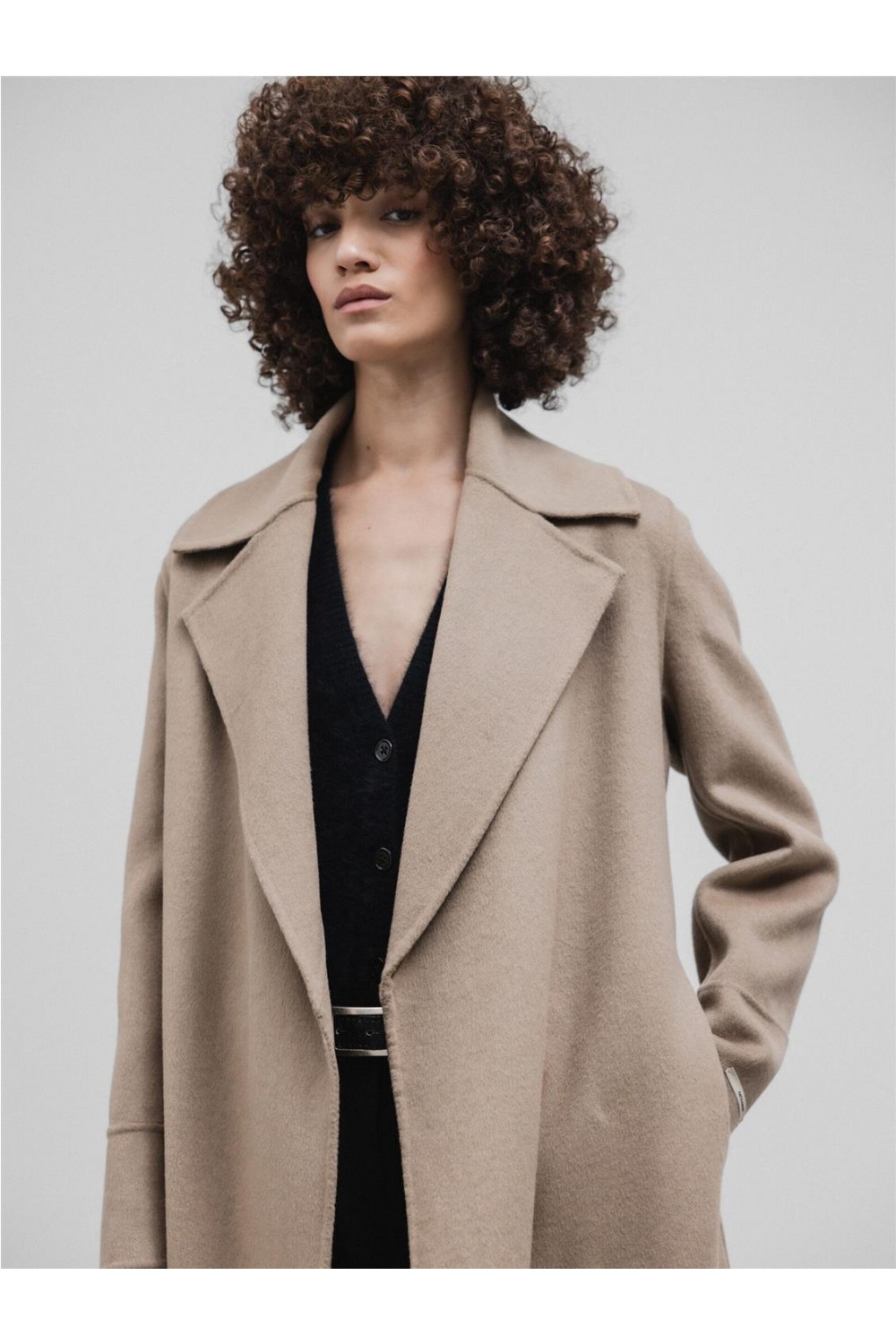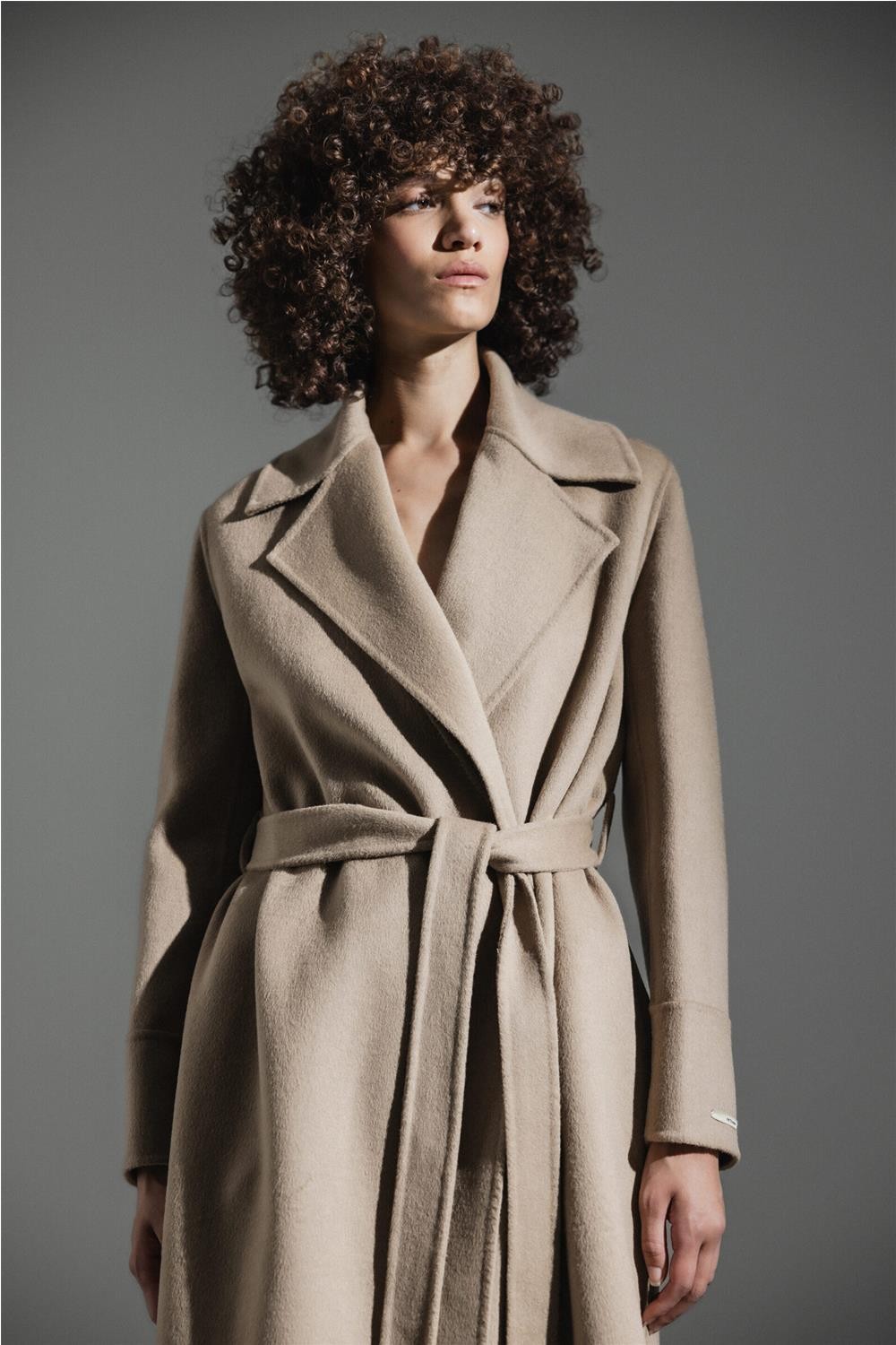 Abrigo de paño de doble faz, largo y con una línea ligeramente fluida que combina un estilo clásico y contemporáneo. Presenta amplias solapas y un diseño elegante sin botones. Incluye un cinturón a juego para anudar a la cintura y cuenta con bolsillos laterales ocultos en la costura. Es una prenda sin forrar que proporciona termoregulación natural, ideal para el frío y transpirable en interiores calefactados. Composición: 100% lana.