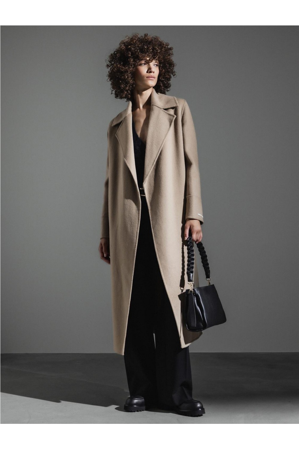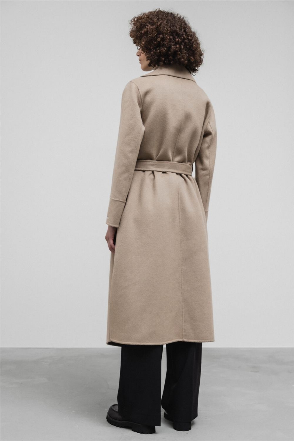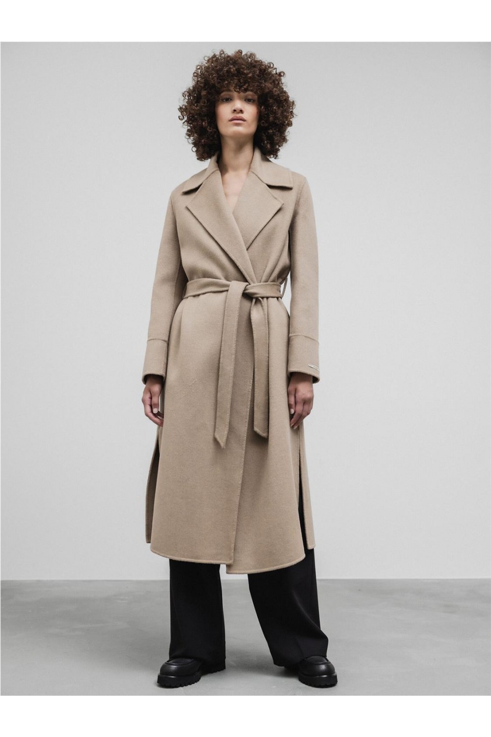 Abrigo de paño de doble faz, largo y con una línea ligeramente fluida que combina un estilo clásico y contemporáneo. Presenta amplias solapas y un diseño elegante sin botones. Incluye un cinturón a juego para anudar a la cintura y cuenta con bolsillos laterales ocultos en la costura. Es una prenda sin forrar que proporciona termoregulación natural, ideal para el frío y transpirable en interiores calefactados. Composición: 100% lana.
