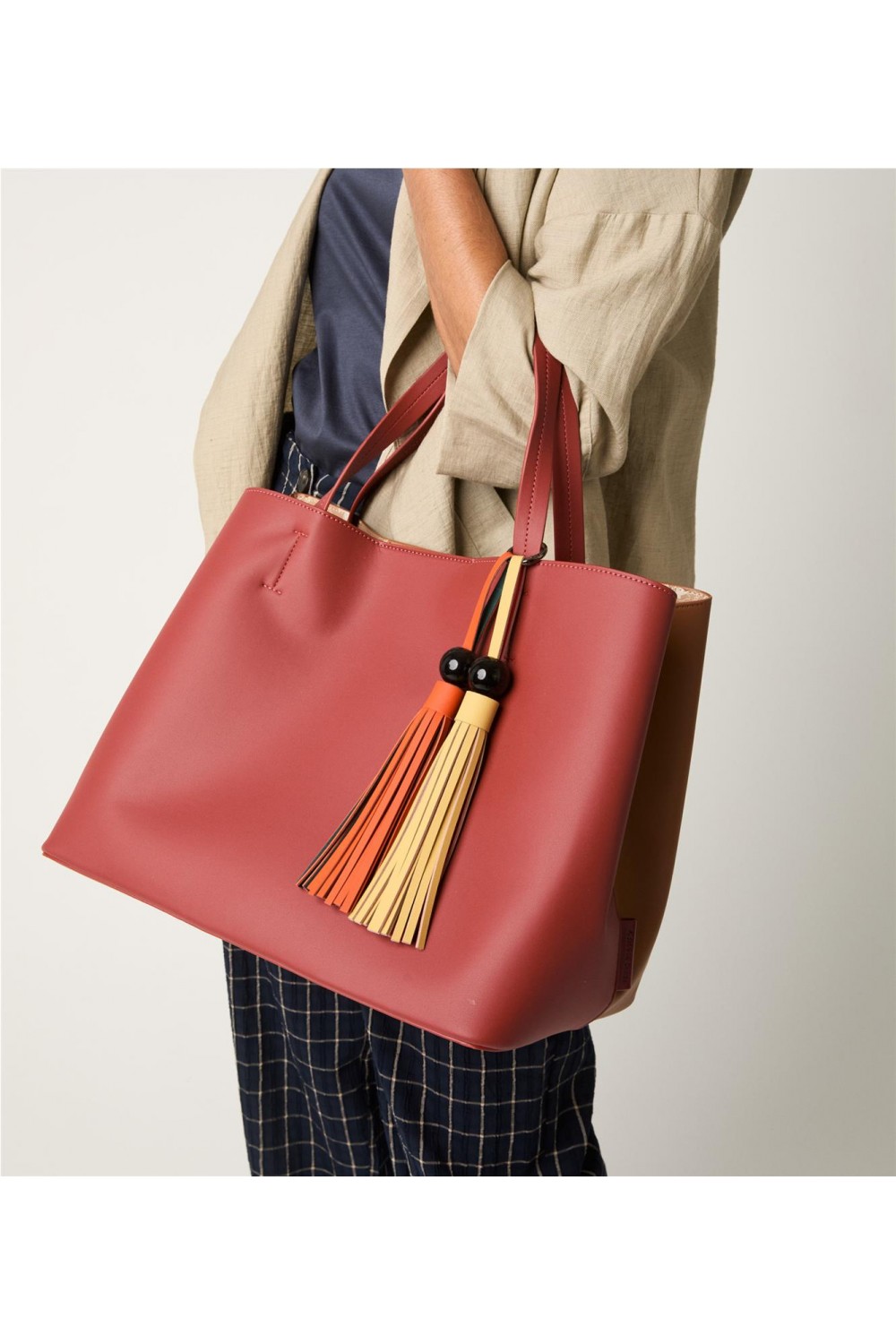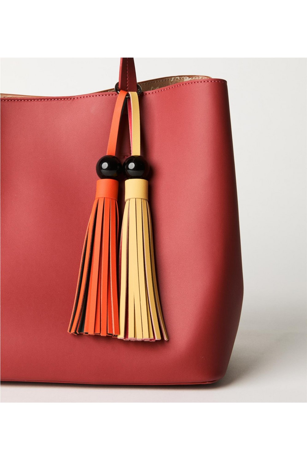 Esta bolso shopping destaca por su diseño capiente y versátil, confeccionado en suave piel sintética. Presenta un elegante motivo bicolor y está realzada con divertidos charms en forma de borlas que aportan un aire dinámico a la pieza. Sus manici lunghi permiten llevarla con total comodidad, convirtiéndola en un accesorio ideal para añadir un toque glamour a cualquier conjunto, ya sea combinándola con prendas estampadas o abrigos ligeros de temporada. Composición: 100% Piel sintética.