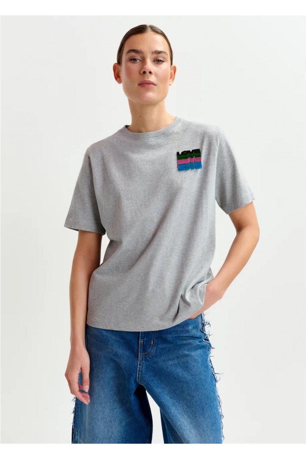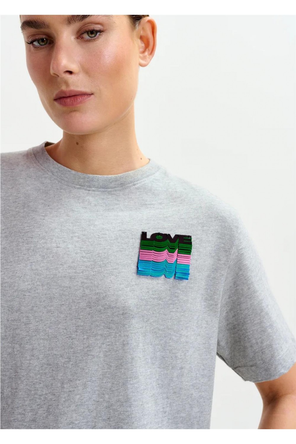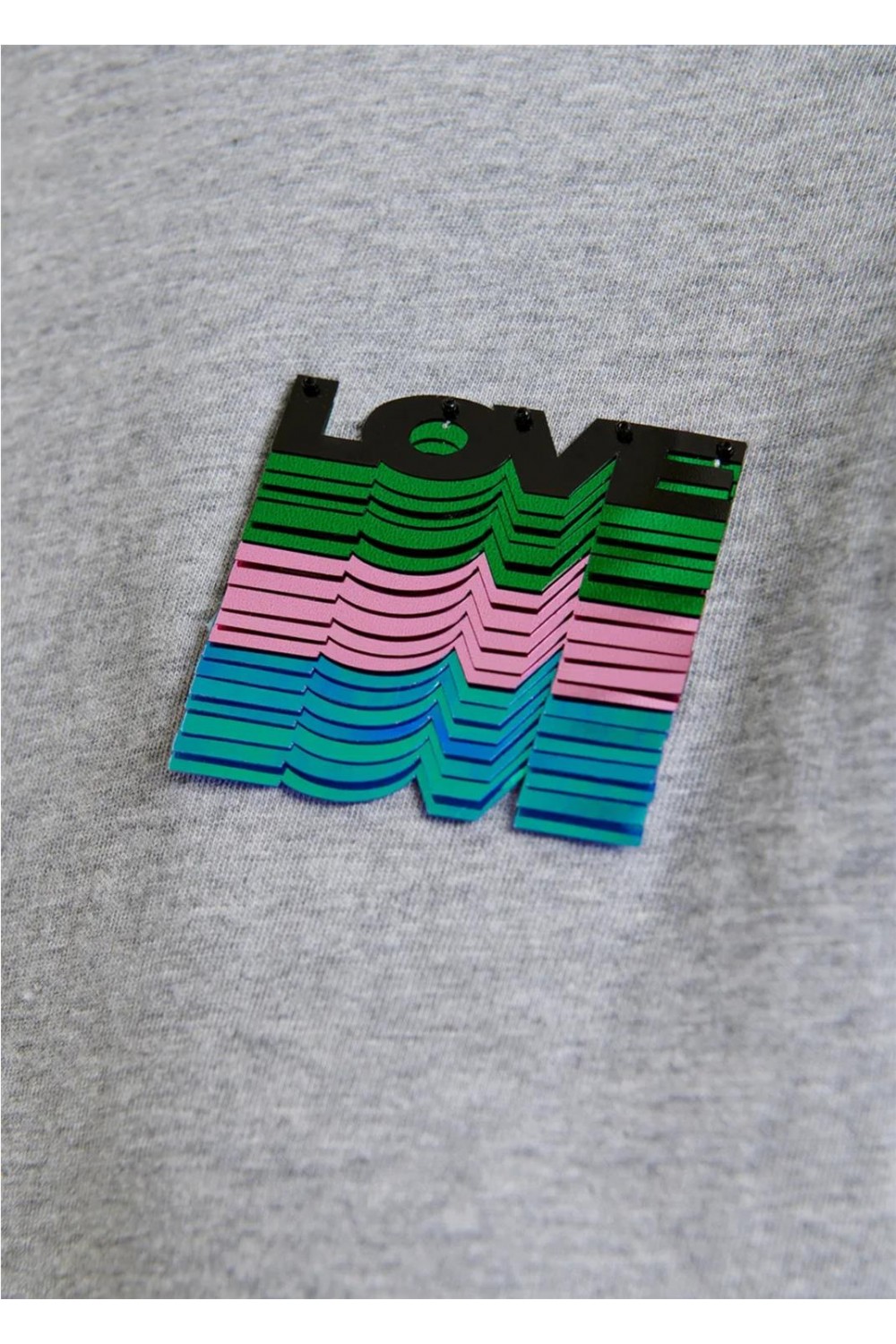 Camiseta de suave punto de algodón, con cuello redondo clásico y un ajuste relajado que garantiza comodidad para el día a día. Está adornada en el pecho con un vibrante bordado de lentejuelas que forma la palabra 'love', cuyo texto se difumina gradualmente hacia abajo. La prenda presenta un tejido de peso medio y no elástico. Composición: 100% algodón. Lentejuelas: 100% cloruro de polivinilo.