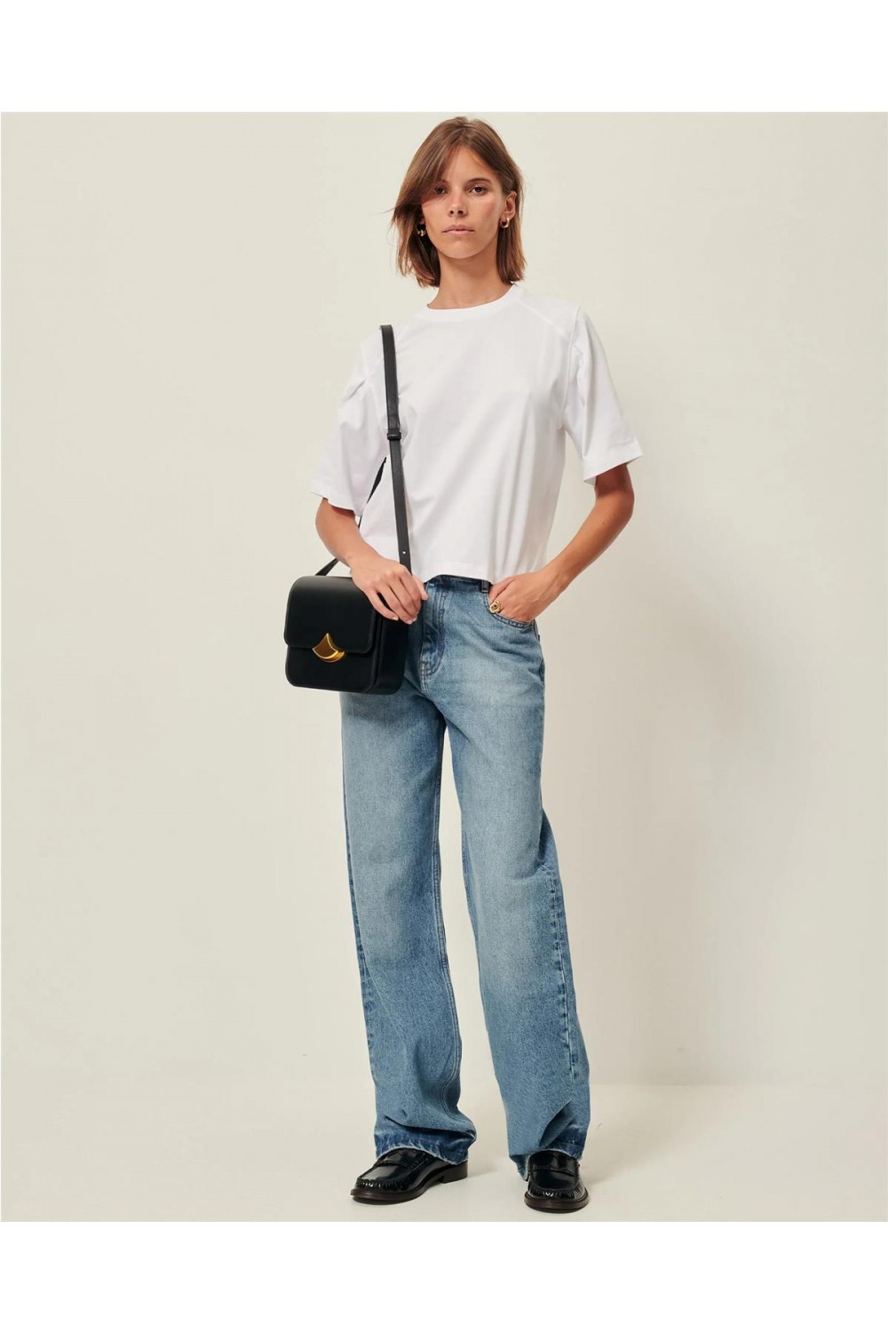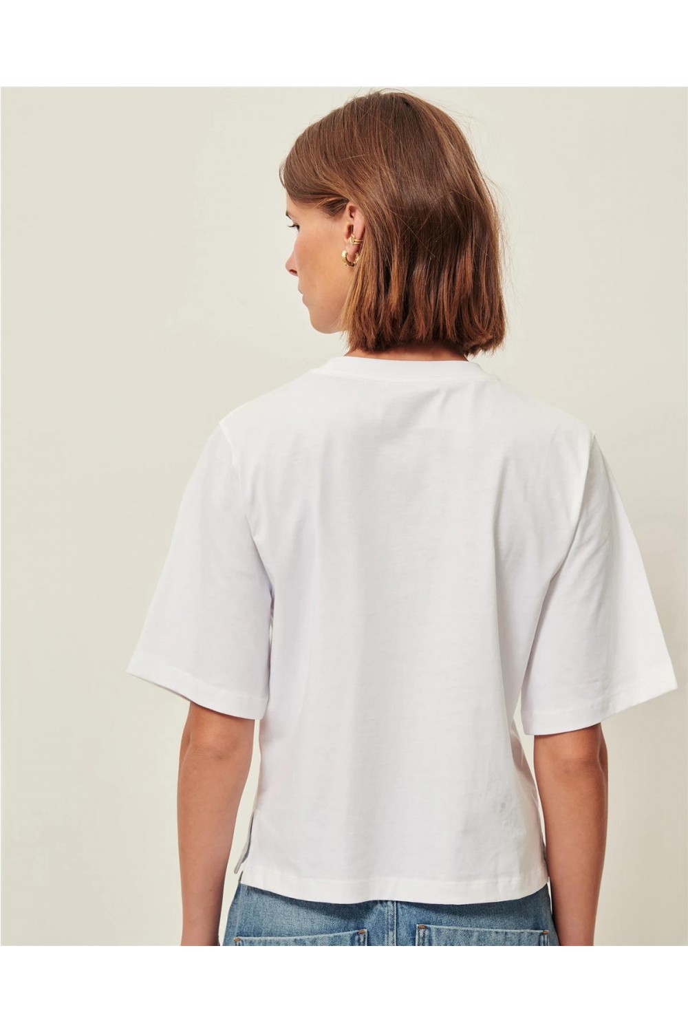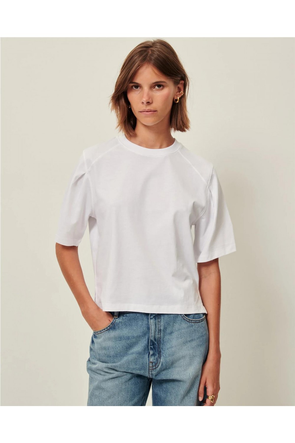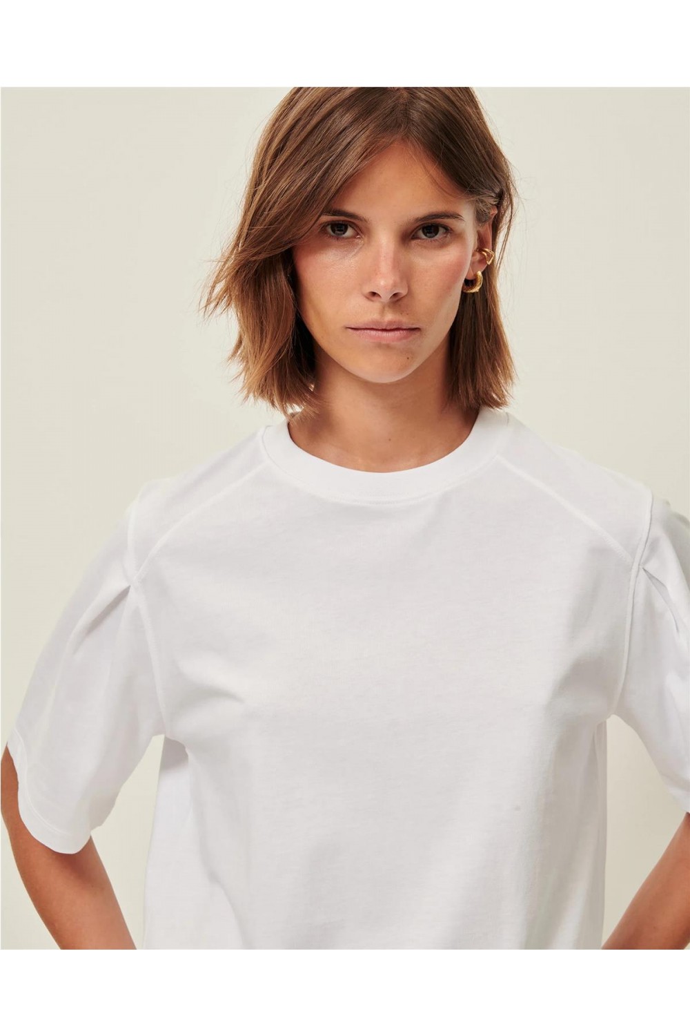 Esta camiseta de manga corta está confeccionada en punto interlock de algodón orgánico con certificado OCS. Su diseño destaca por el cuello redondo, las sisas caídas y unos originales pliegues cóncavos en los hombros que le confieren una estructura única. Además, incorpora detalles de aberturas laterales en el bajo, aportando fluidez al corte. Es una prenda básica pero con detalles sofisticados, tejida y fabricada en Portugal. Composición: 100% Algodón orgánico.