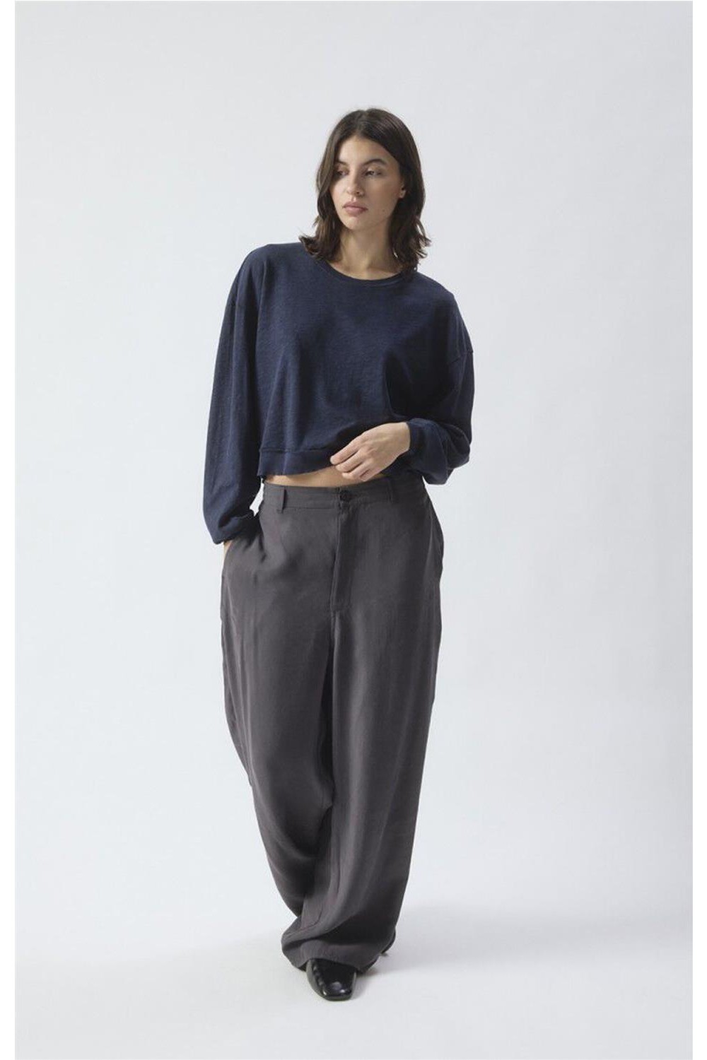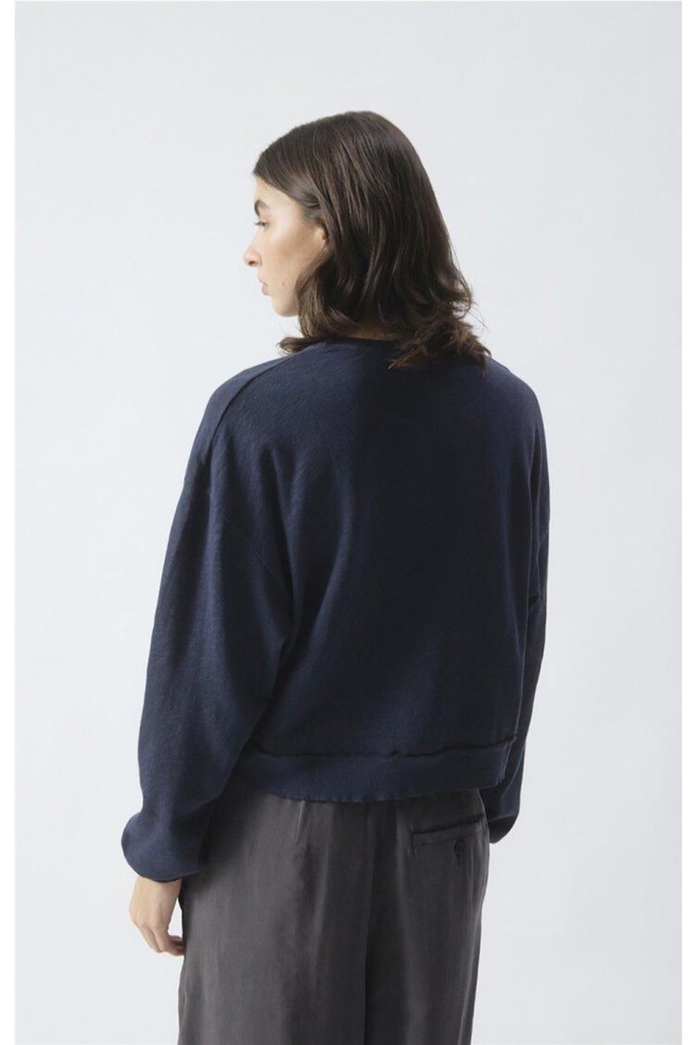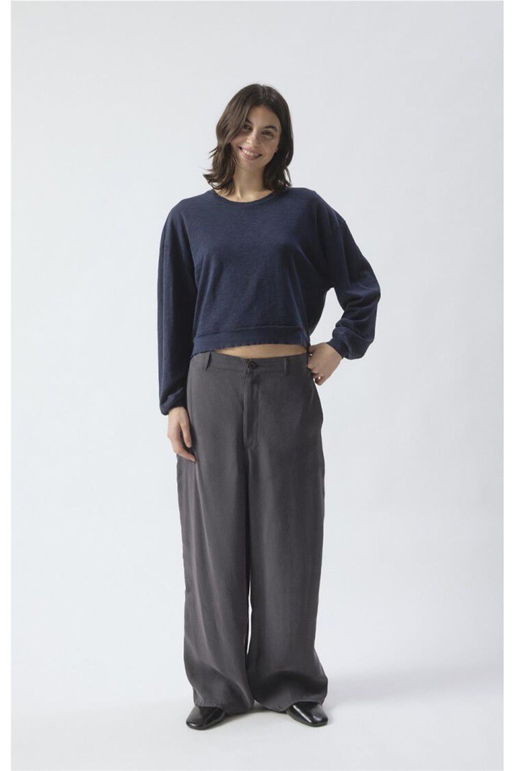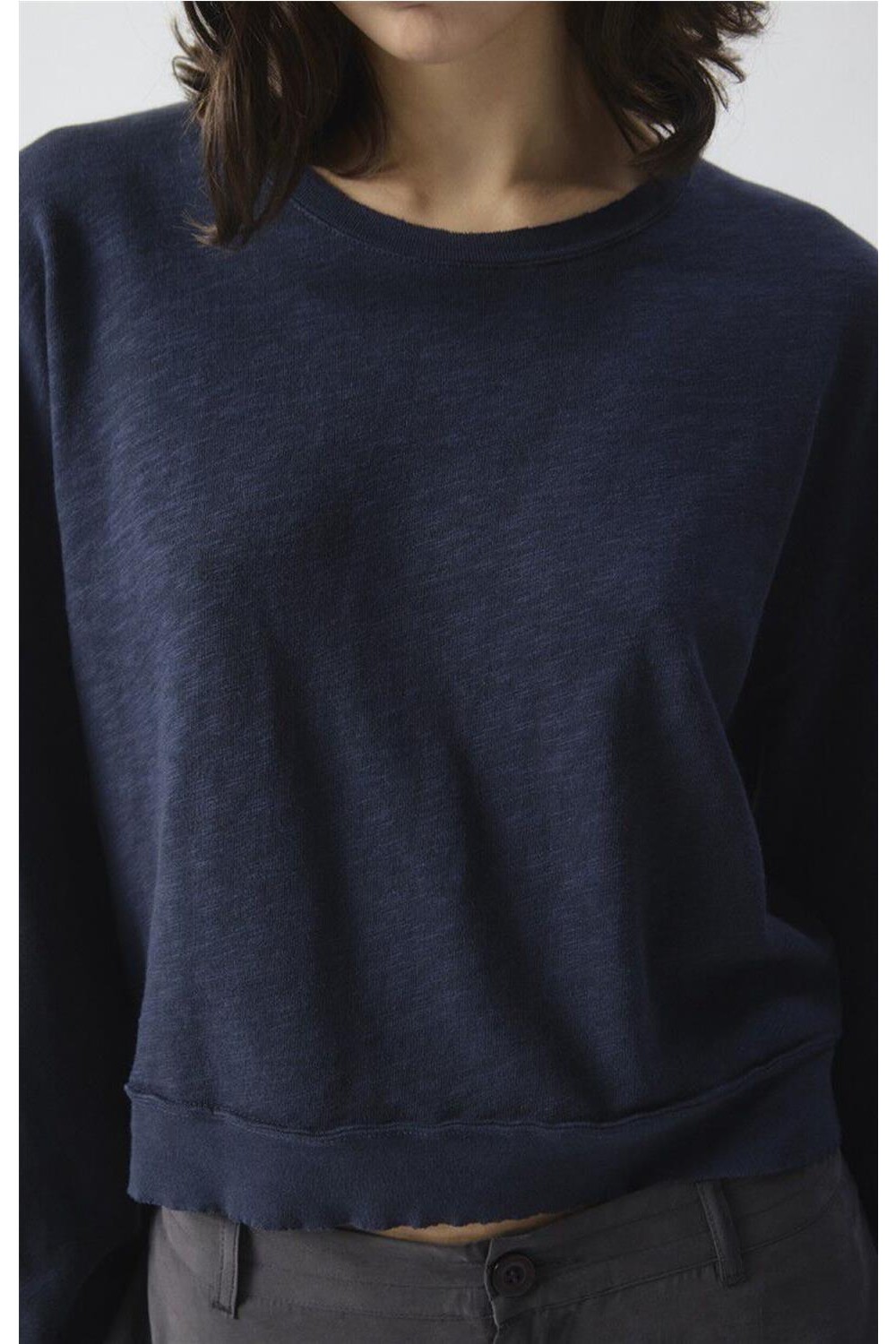 Camiseta de manga larga de tejido grueso y flameado mediante un diseño inspirado en la estructura de una sudadera. Destaca por su corte amplio y bordes acanalados que le confieren un aire moderno y desenfadado. Textura exterior robusta, mientras que el interior cepillado ofrece una suavidad excepcional y un confort superior. Con cuello redondo y un estilo atemporal, es una pieza clave para un vestuario informal que busca combinar durabilidad y bienestar diario. Composición: 100% Algodón.
