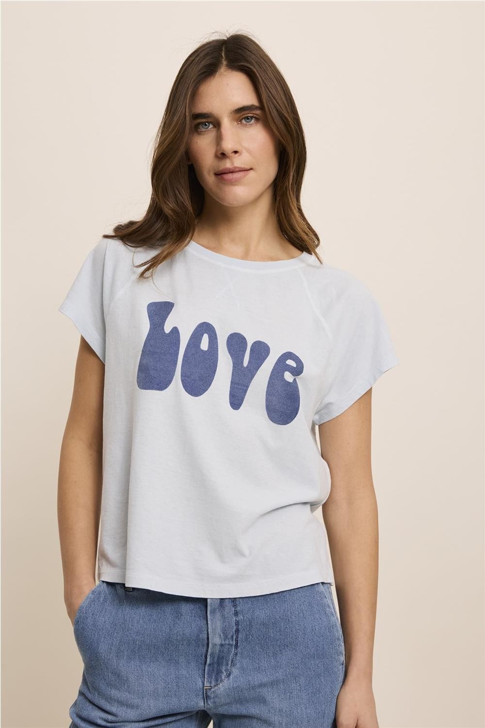 Esta camiseta de corte recto es una pieza versátil y alegre, perfecta para dar un toque de color a tus conjuntos veraniegos. Confeccionada en una mezcla de algodón y lino, garantiza una gran comodidad y frescura durante todo el día. Presenta un diseño clásico con cuello redondo, manga corta y un original estampado frontal "Love". Su estilo desenfadado la hace ideal para combinar con tus vaqueros favoritos o una falda fluida. Composición: 70% algodón, 30% lino.