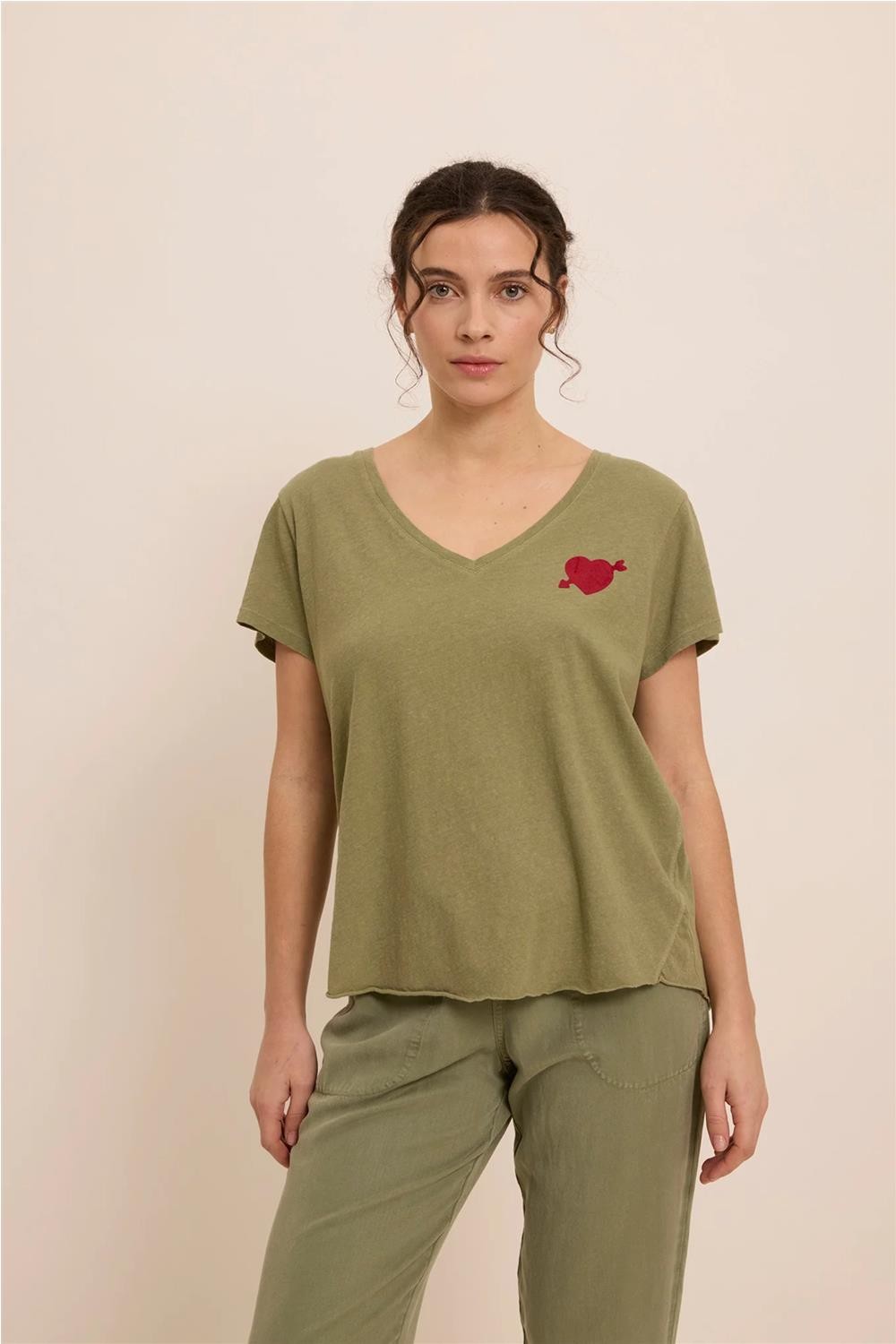 Camiseta de mujer corazón Five algodón lino recto caqui rosa claro TSE2609
