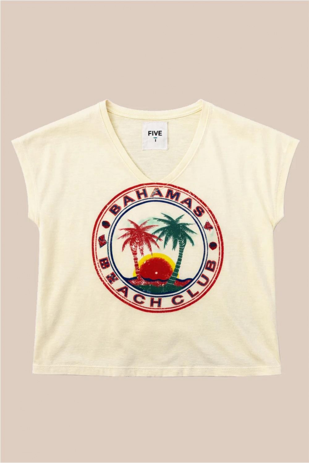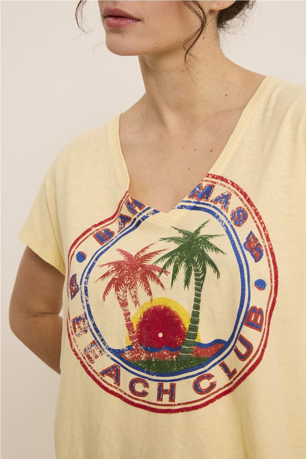 Camiseta de mujer Bahamas Five detalles bordados decorativos banana blanco roto TSE2625