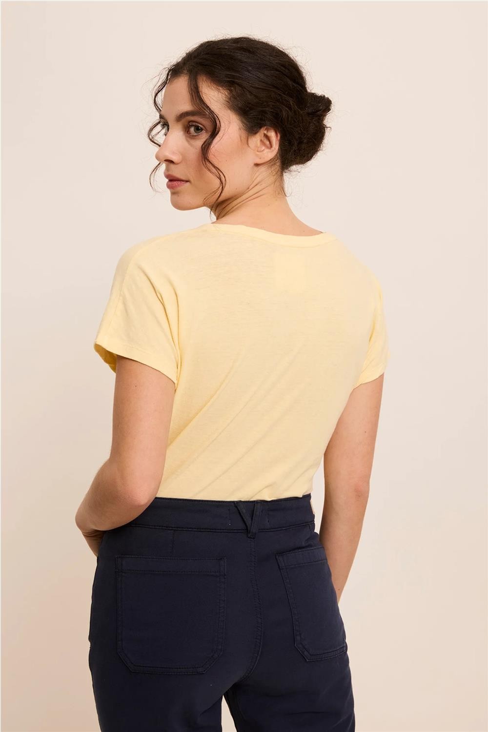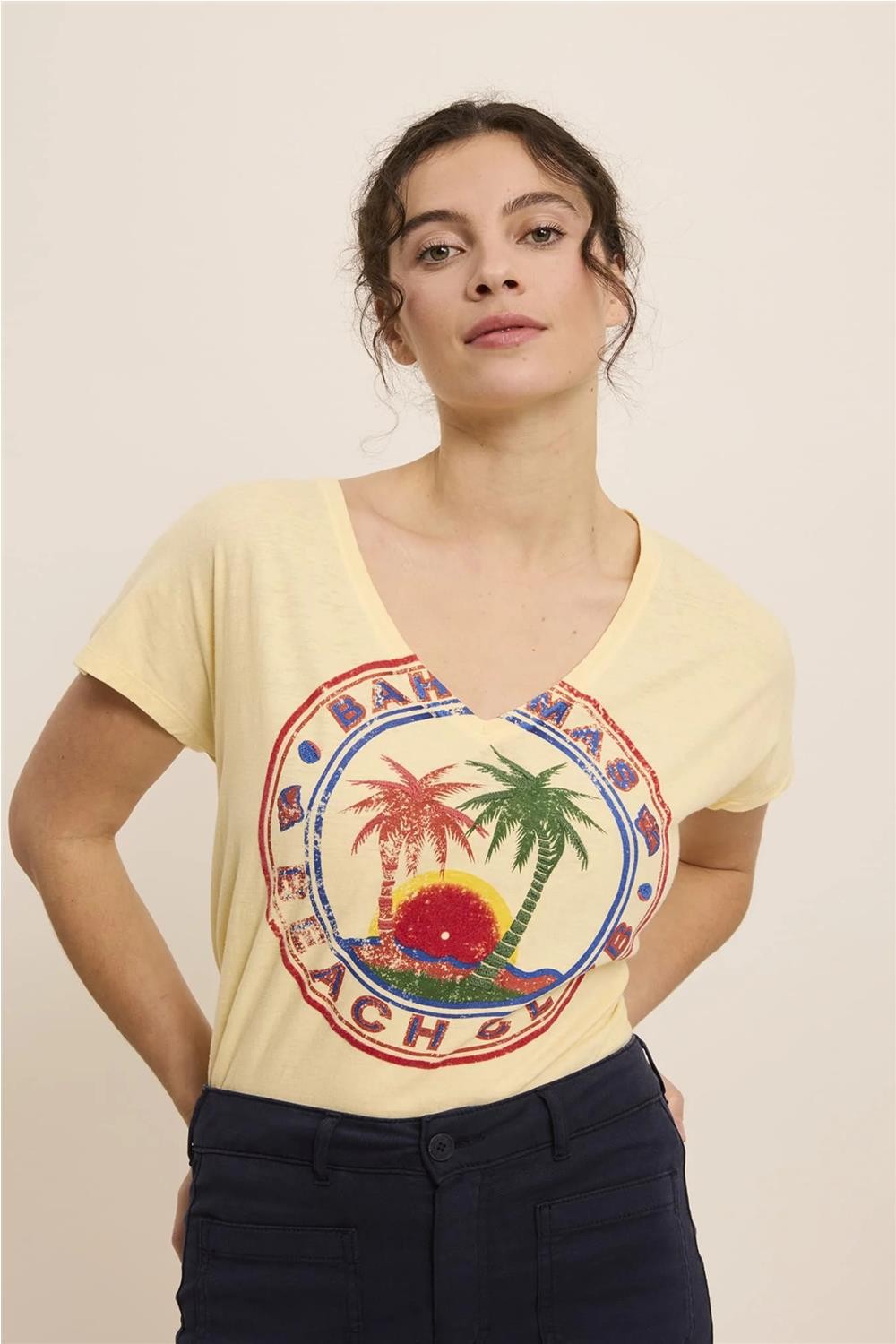 Esta camiseta, confeccionada en una mezcla natural de algodón y lino, destaca por su corte recto y su agradable frescura. Presenta un favorecedor escote en pico y mangas cortas, realzados por un original estampado inspirado en las Bahamas con detallados bordados decorativos. Es una prenda cómoda y con personalidad, ideal para aportar un toque exótico y sofisticado a cualquier estilismo relajado de diario. Composición: 70% Algodón, 30% Lino.