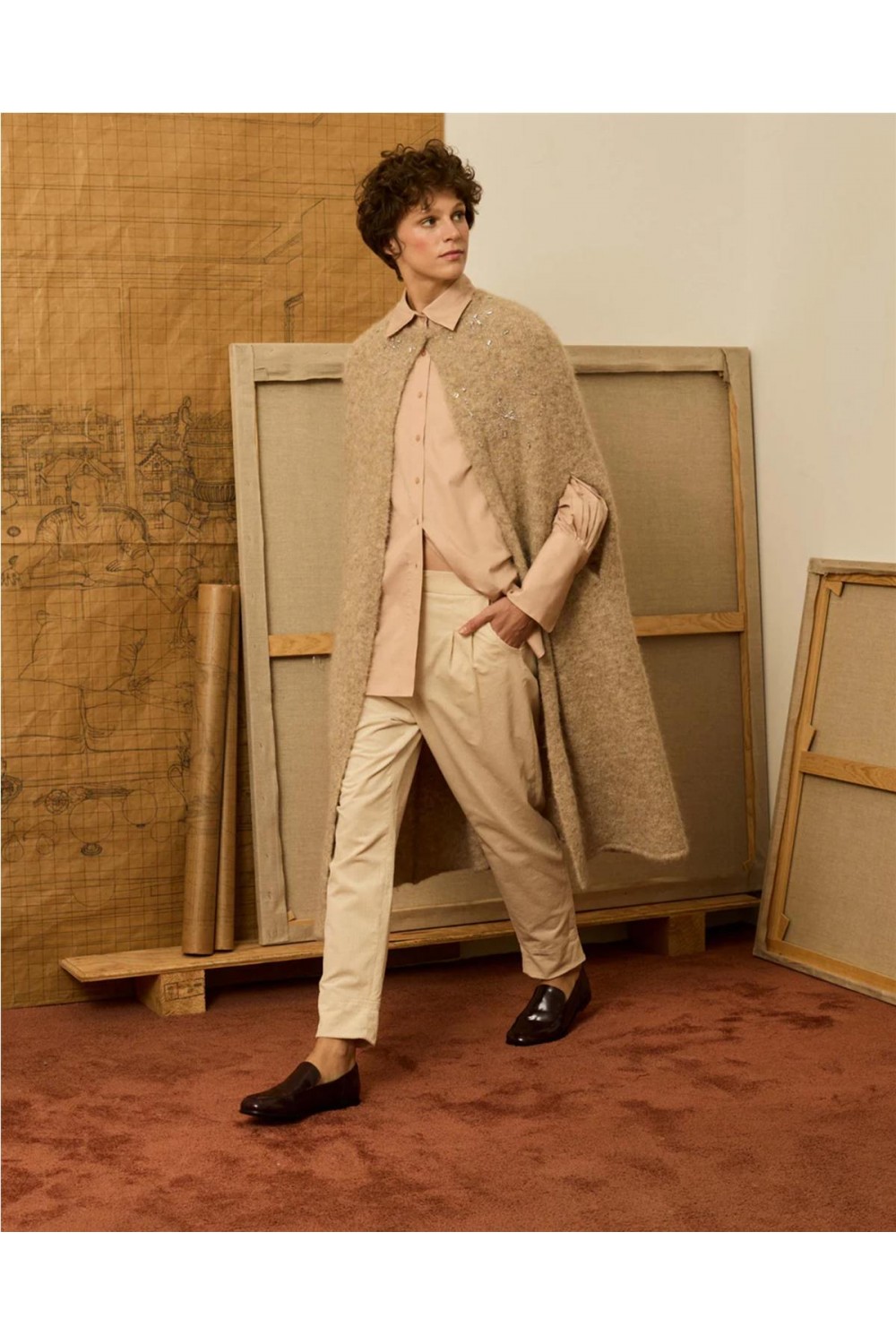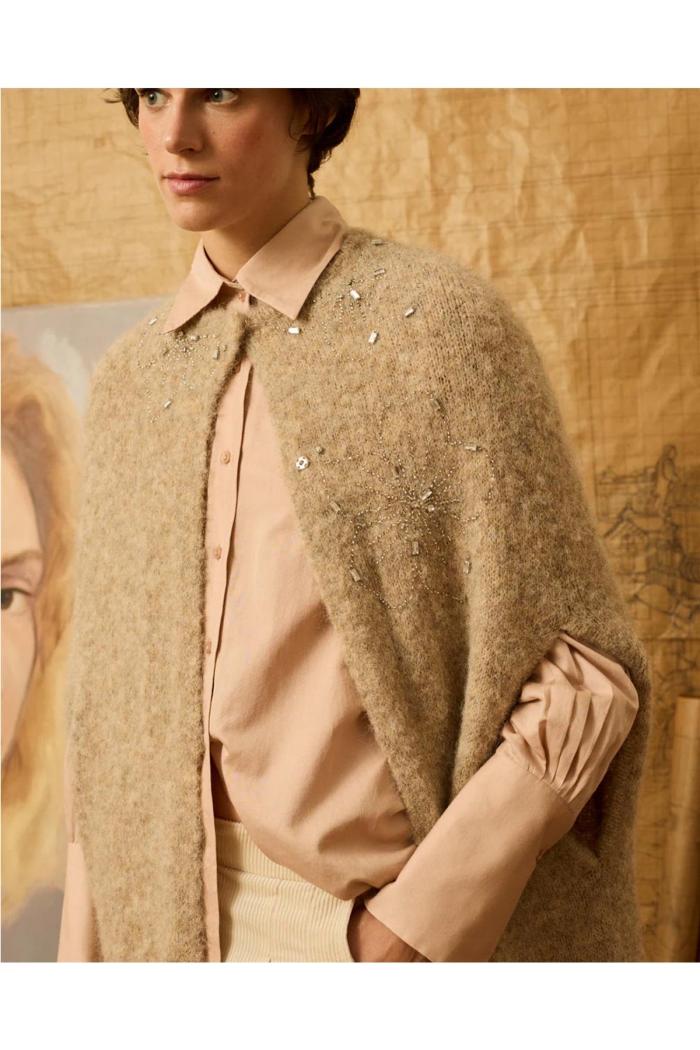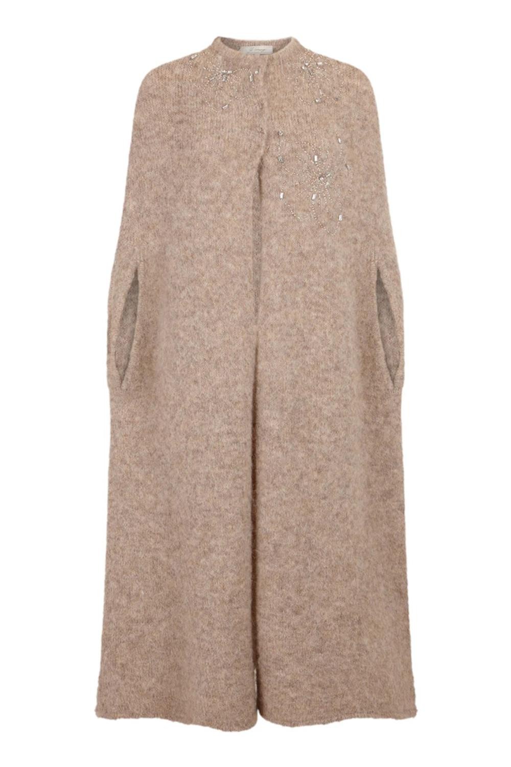 Capa chaqueta en punto vigoré con aberturas para las manos, cierre con corchete y flores bordadas con pedrería. Composición: 35% Nailon, 26% Poliéster reciclado, 22% Lana, 16% Mohair, 1% Elastano.