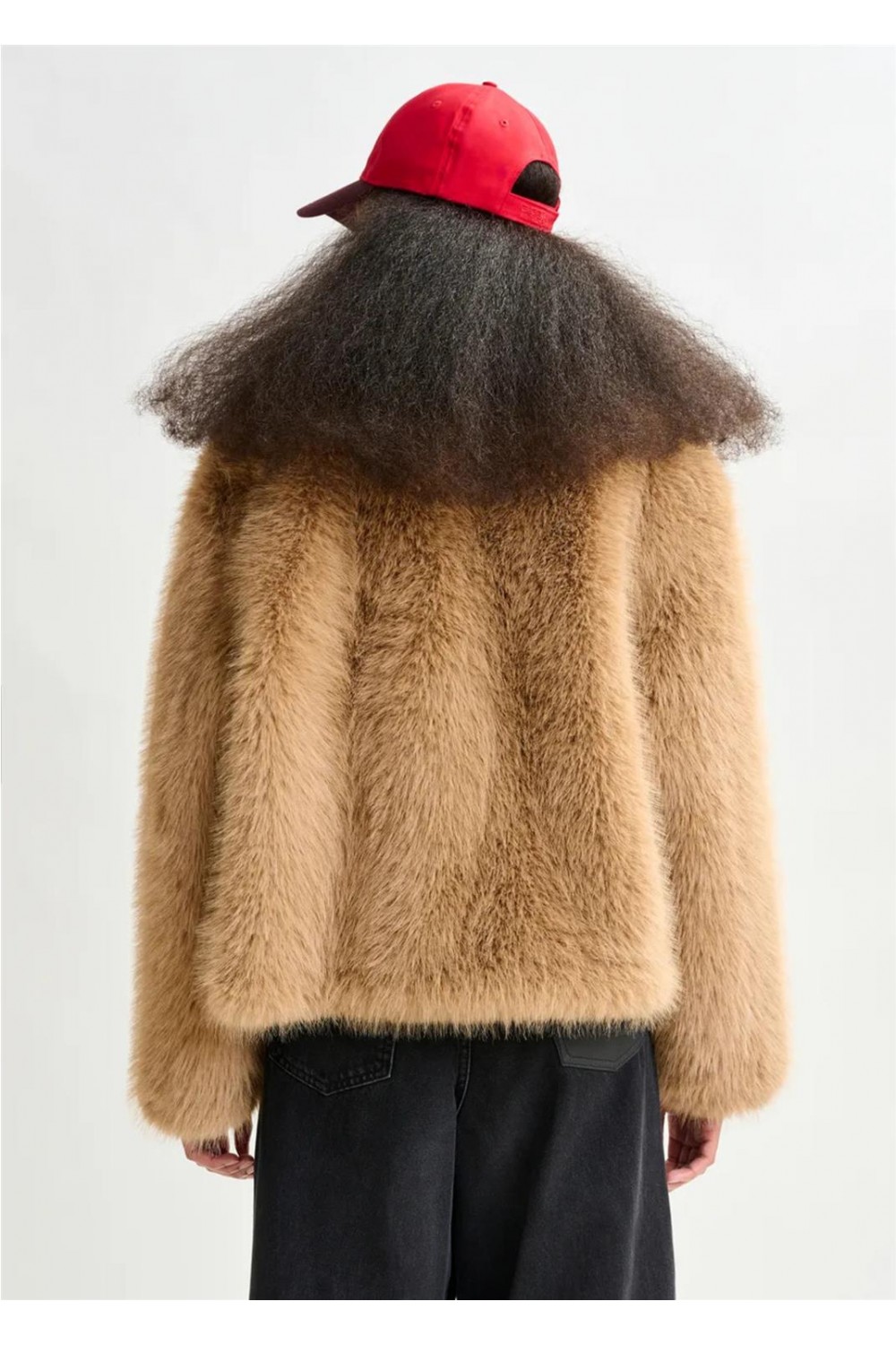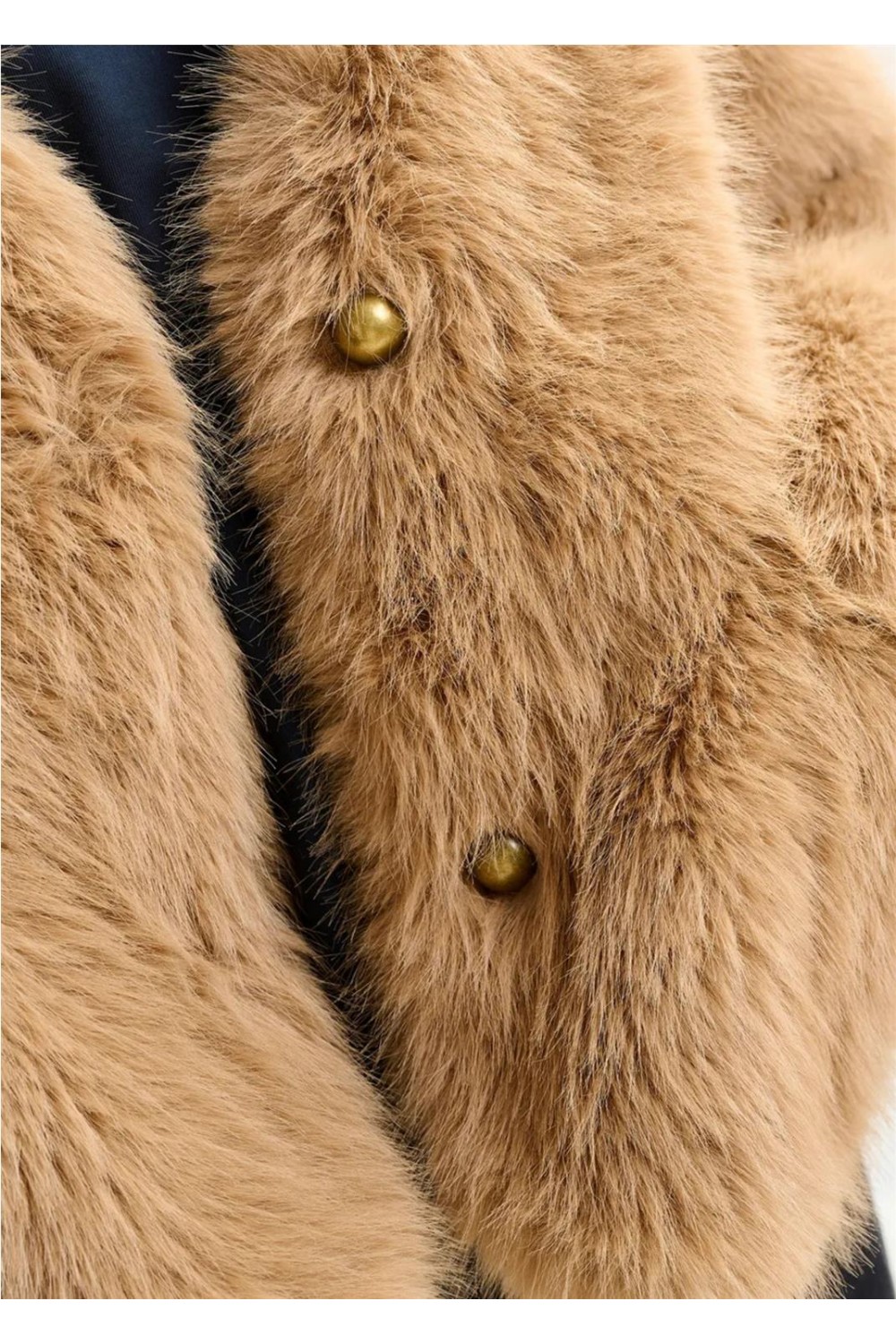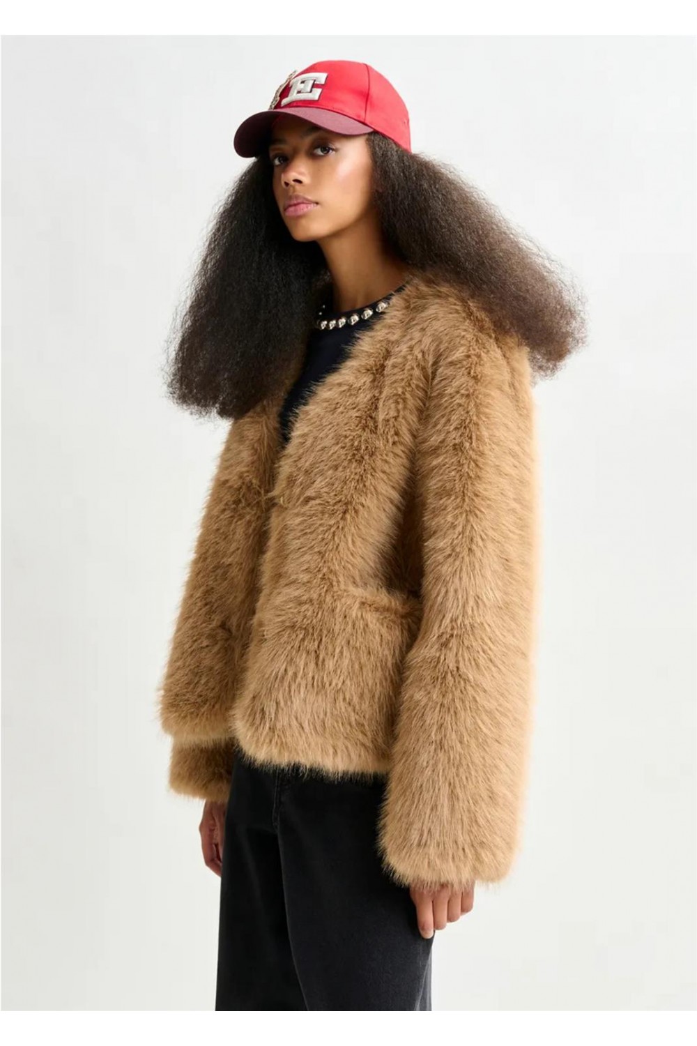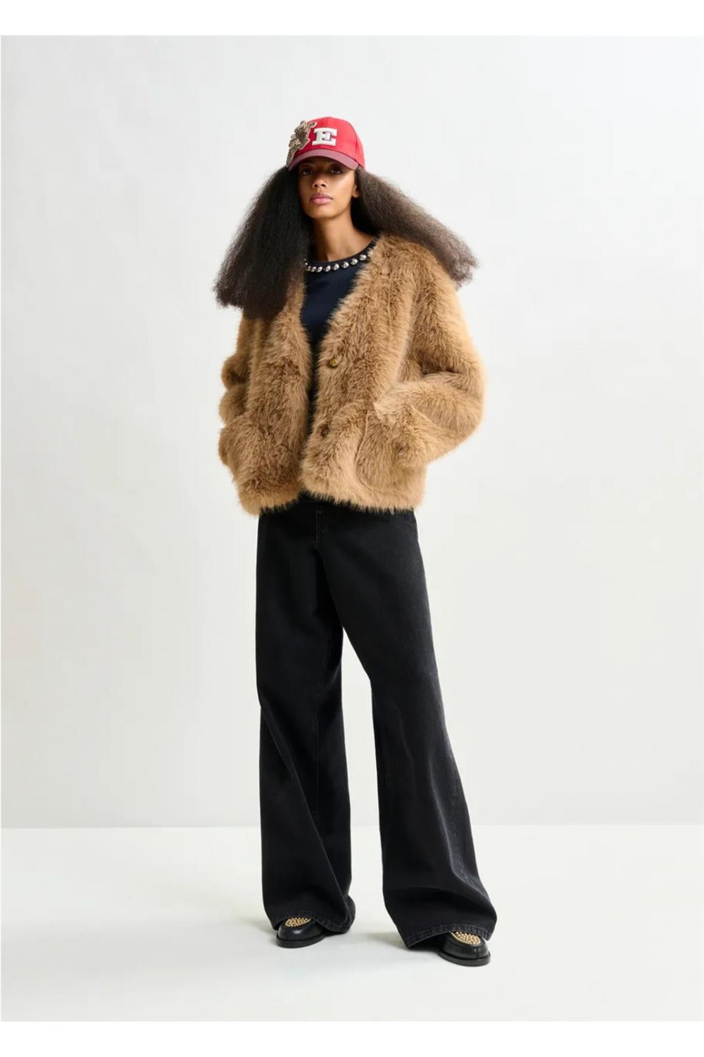 Cazadora confeccionada en suave pelo sintético (faux fur) de acabado brillante, que aporta una sofisticación natural para los días más fríos. Diseñada con una silueta relajada y hombros caídos (dropped shoulders) para un look desenfadado y cómodo. Cuenta con un cierre de botones que mantiene un aspecto minimalista y bolsillos laterales discretos de ojal que aseguran una línea limpia. La prenda contiene poliéster reciclado en su composición. Composición: 100% Poliéster (reciclado).