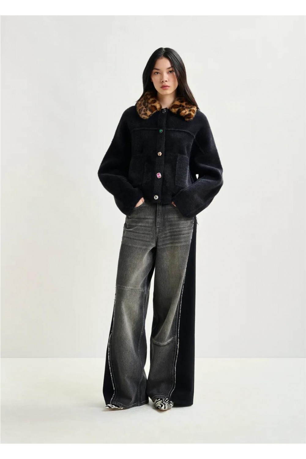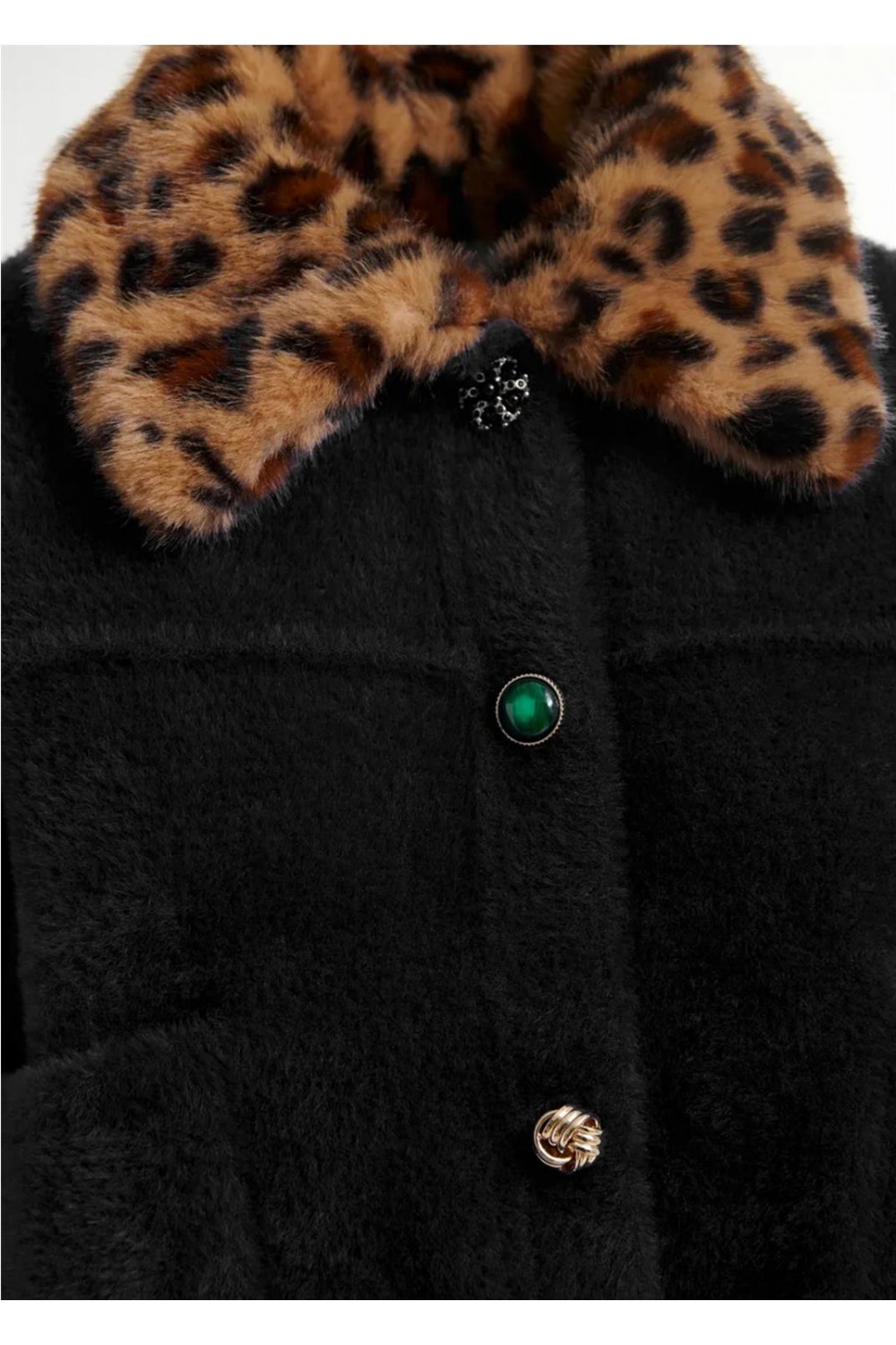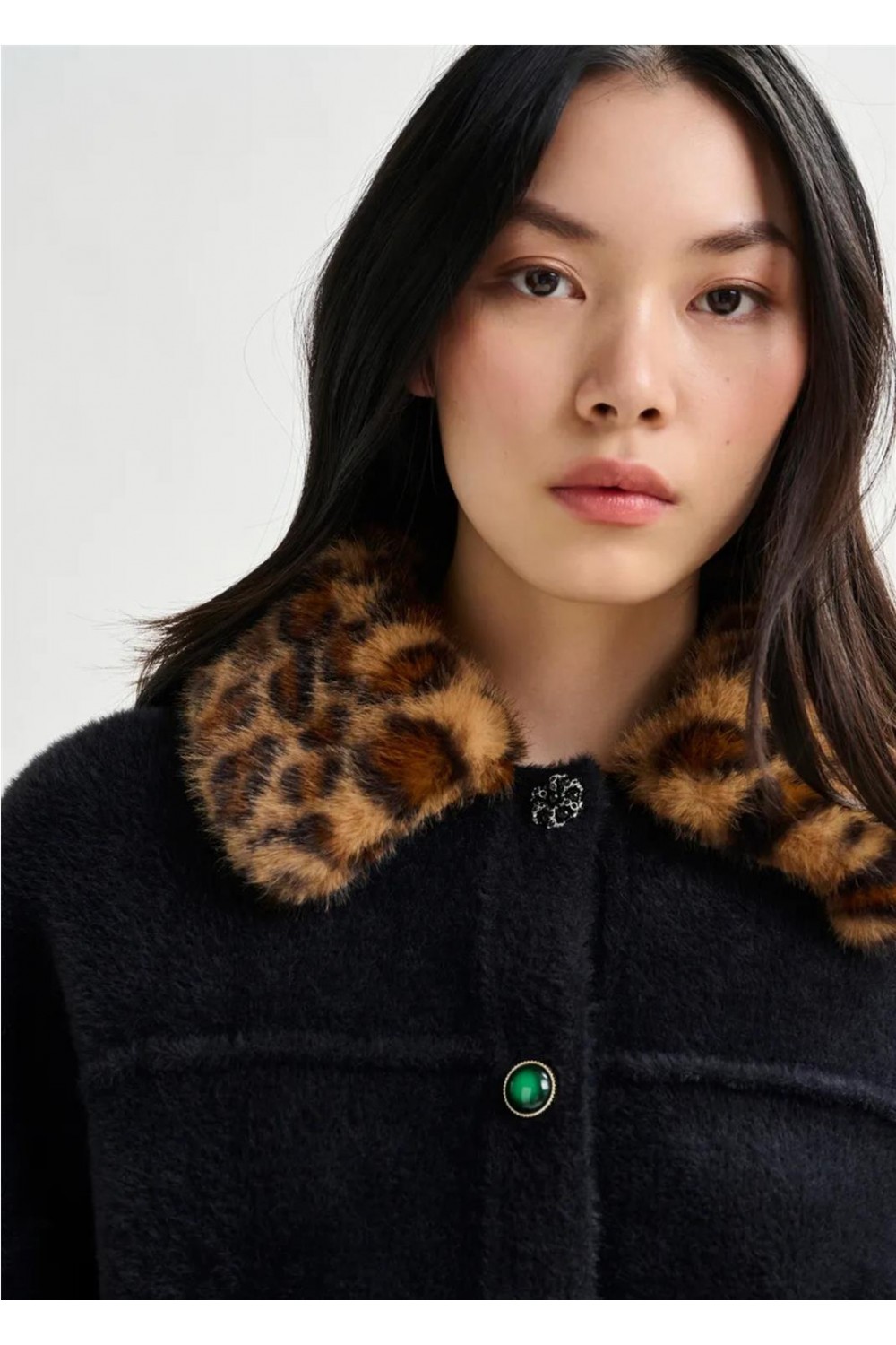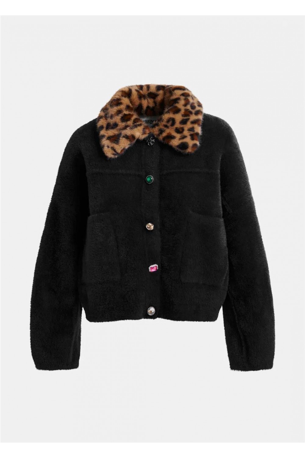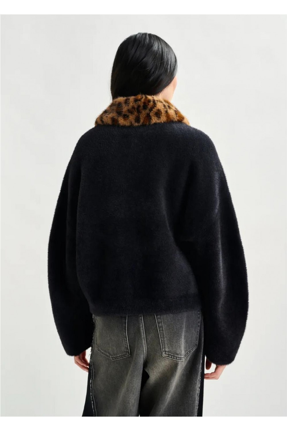Cazadora de punto de mujer INTENTION Essentiel cuello sintético leopardo azul negro INTENTION
