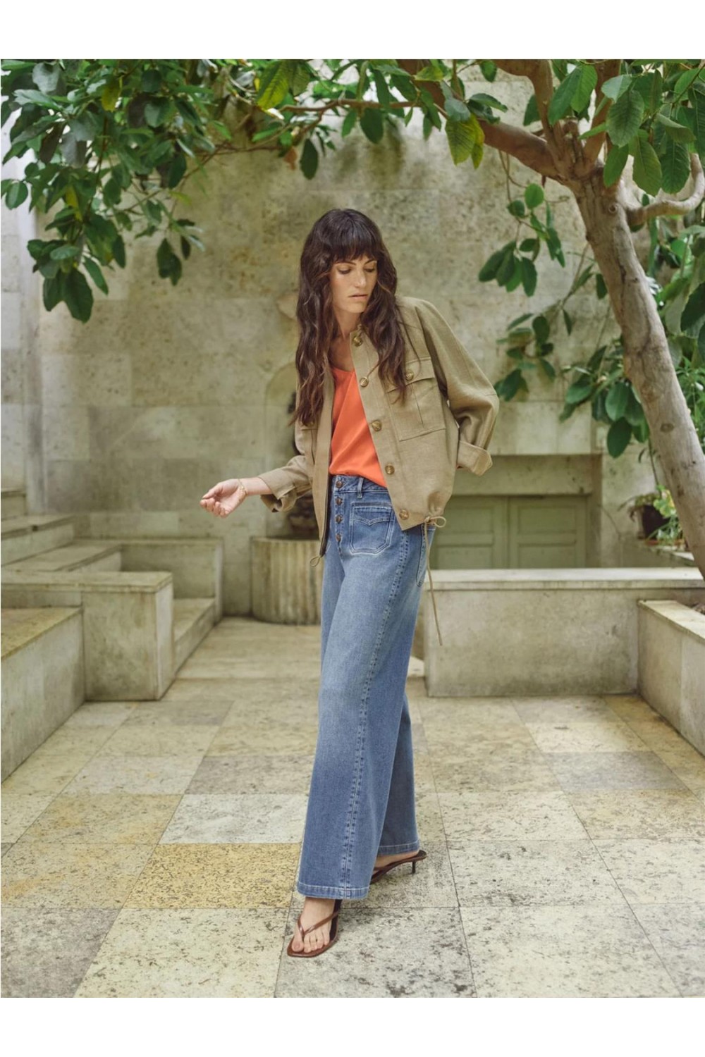 Esta cazadora, de estilo relajado y casual, está confeccionada en una ligera mezcla de ramio y algodón, ideal para combinar en capas sin esfuerzo. Presenta un cuello clásico, cierre de botones y un bajo con cordón ajustable que permite definir la silueta al gusto. Destaca por un precioso bordado artístico en la espalda, que añade un toque único y divertido a su diseño minimalista. Una prenda versátil para lograr un look chic y desenfadado. Composición: 65% Ramio, 35% Algodón.