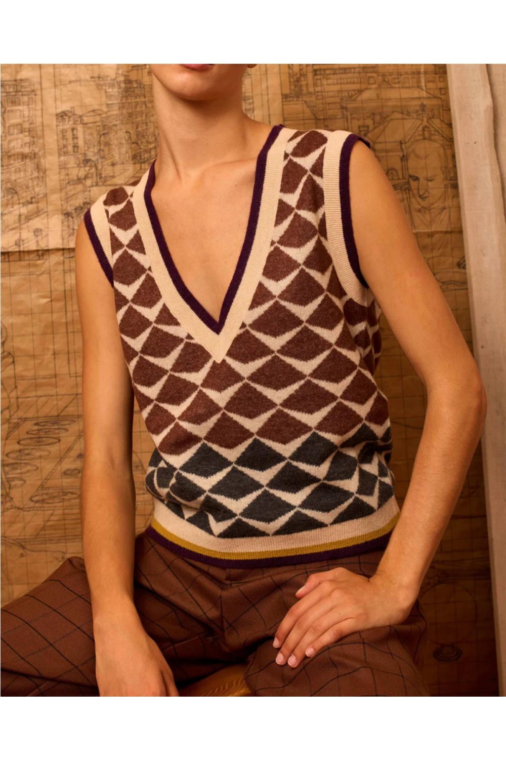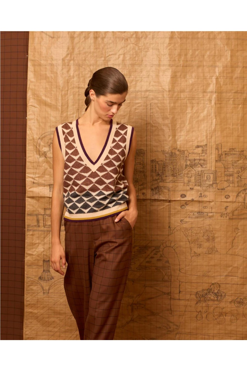 Chaleco en punto de cuello pico y detalle de grecas. Ideal para llevar con camiseta o blusa. Composición: 40% Lana, 33% Nylon, 17% Tencel, 10% Alpaca.