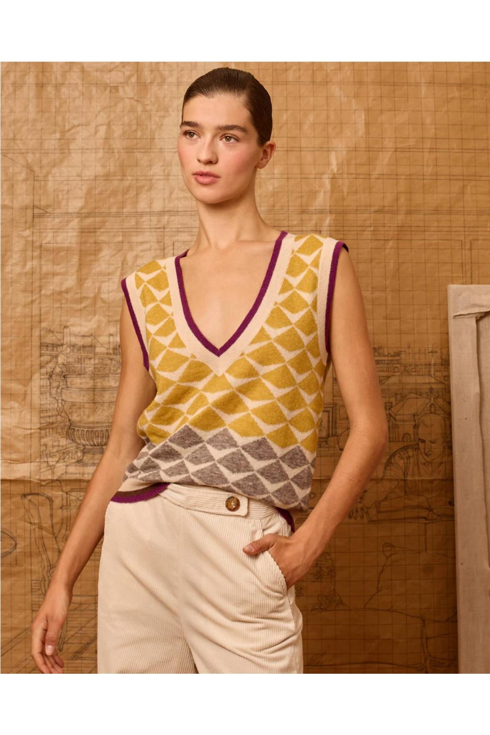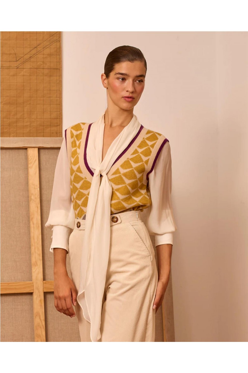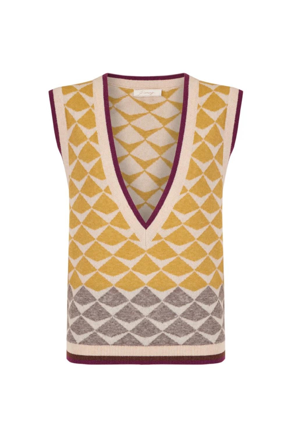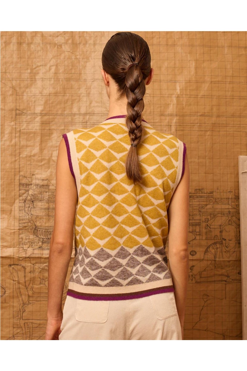 Chaleco de punto de mujer greca Is Coming cuello pico amarillo marrón 717.CHL.7172