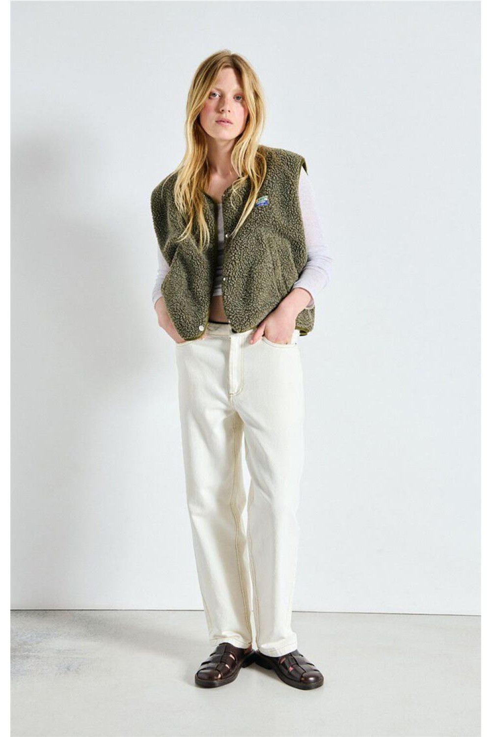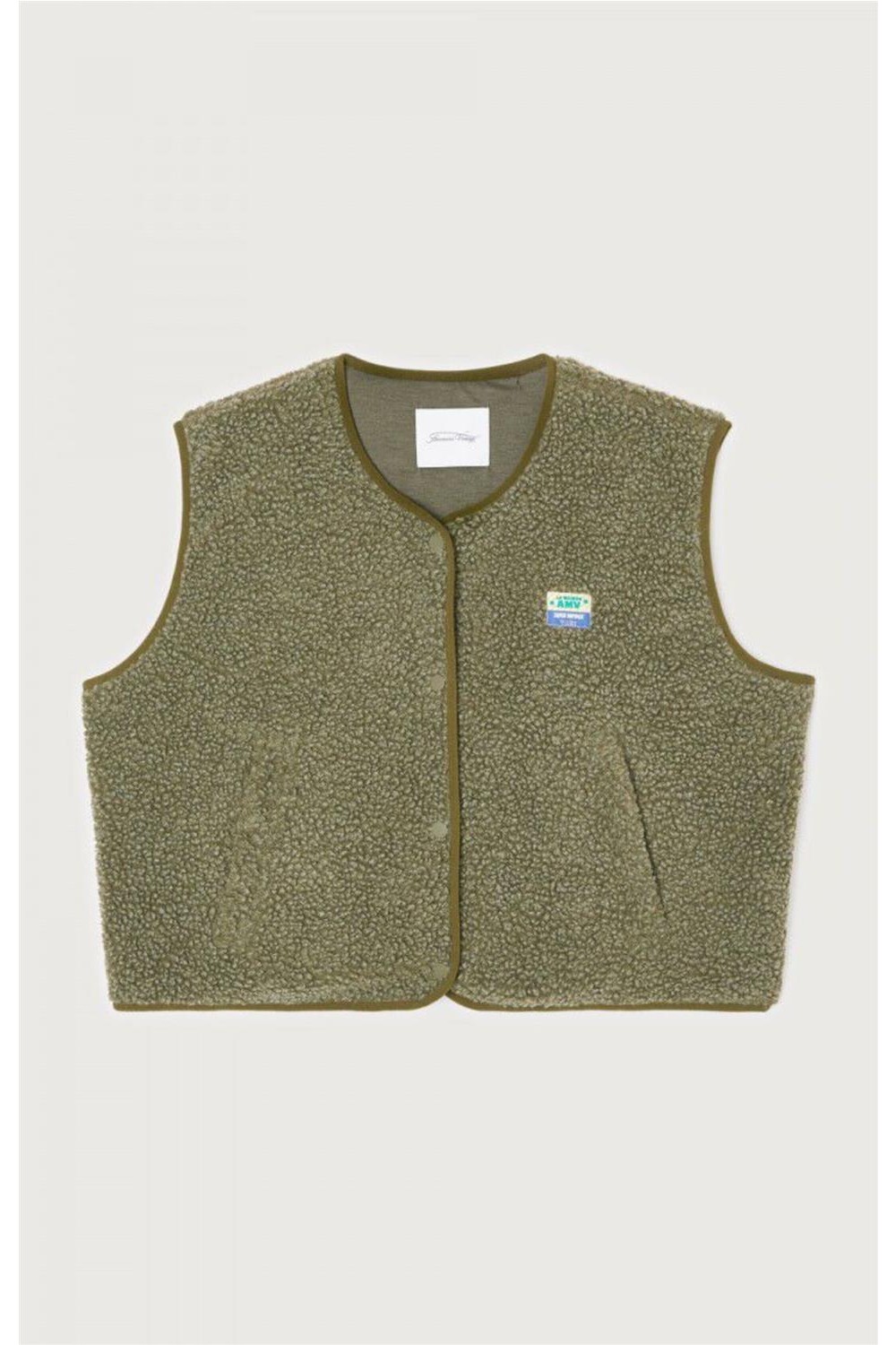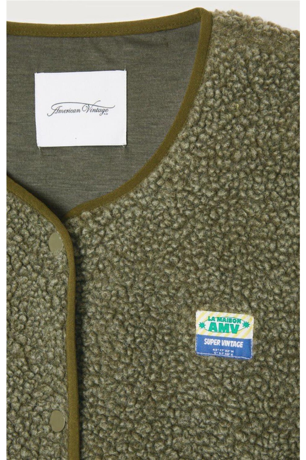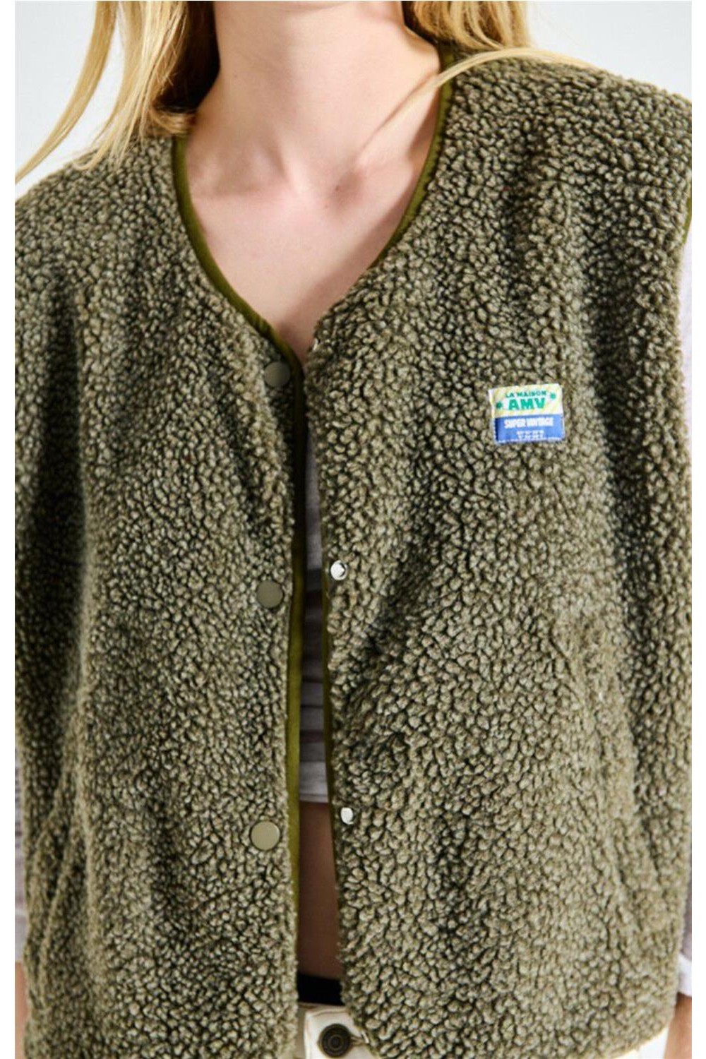 Chaleco de corte amplio y textura efecto borreguito que aporta calidez y un estilo actual. Incluye dos bolsillos frontales con cremallera para mayor funcionalidad y un parche «La maison AMV» que firma la prenda con identidad propia. Ideal para superponer y crear looks cómodos y modernos en cualquier temporada. Composición: 100% poliéster (fibras recicladas).