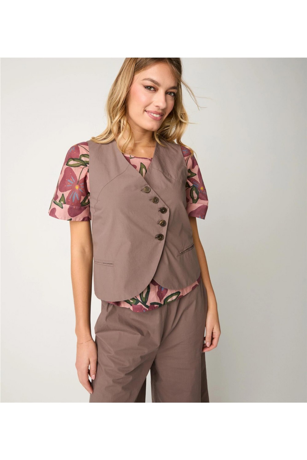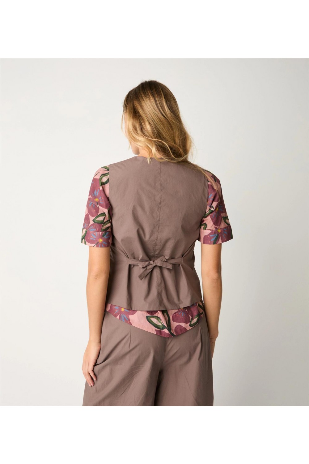 Este chaleco de vestir, confeccionado en algodón de textura ligera y suave, destaca por un diseño asimétrico con cierre cruzado y escote en V. Un detalle distintivo de esta pieza es el lazo ajustable en la espalda, que permite entallar la silueta de forma femenina y elegante. Además, incorpora prácticos bolsillos de ojal laterales, combinando funcionalidad y estilo en una prenda sofisticada y versátil, perfecta para completar looks contemporáneos y distinguidos. Composición: Tejido 100% Algodón.