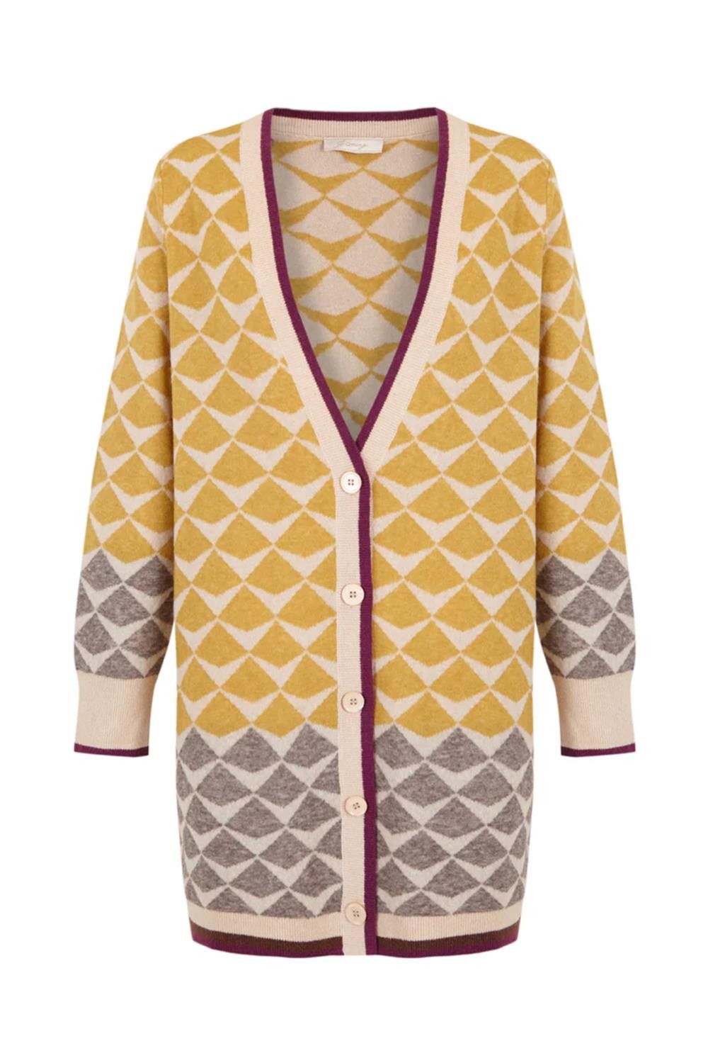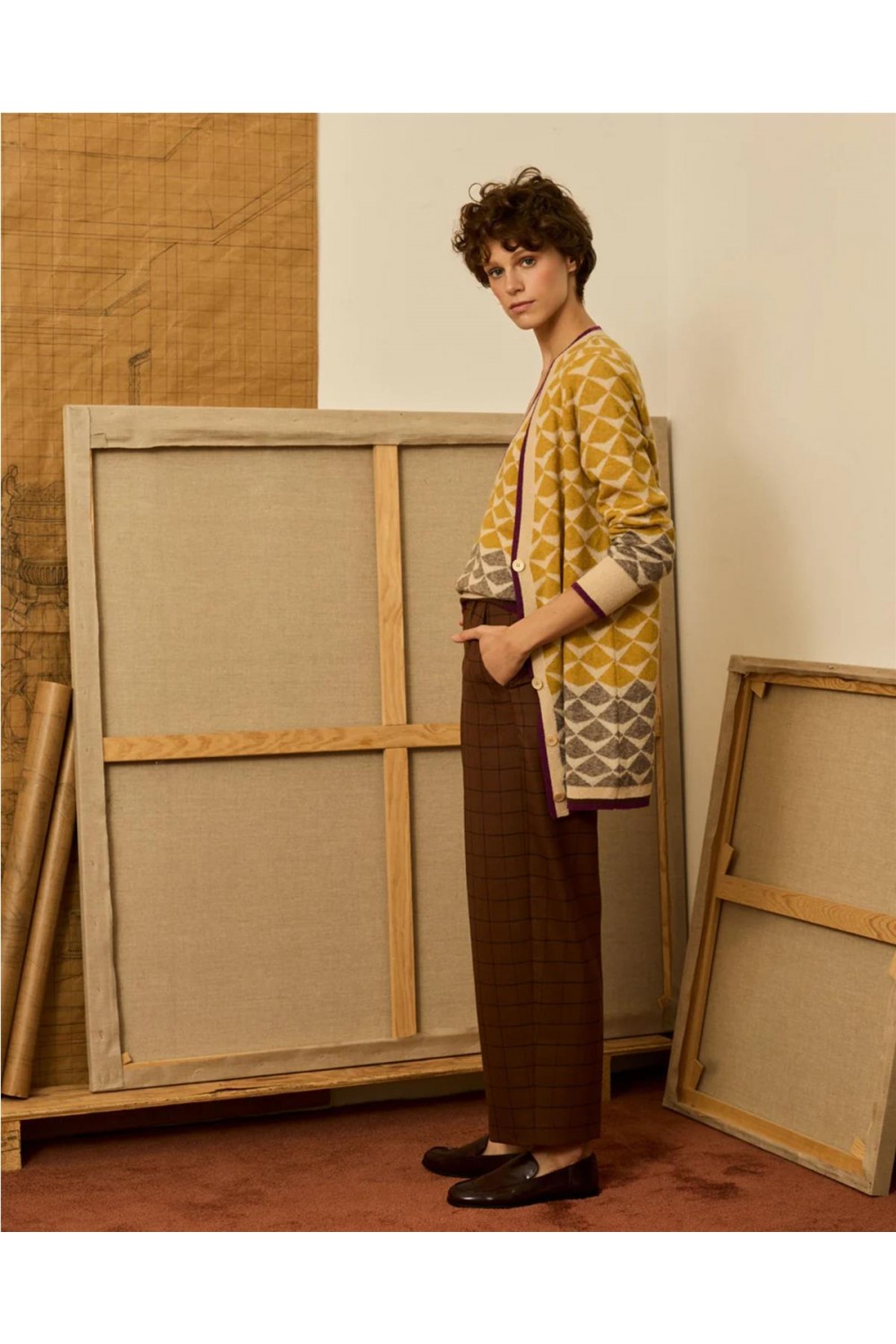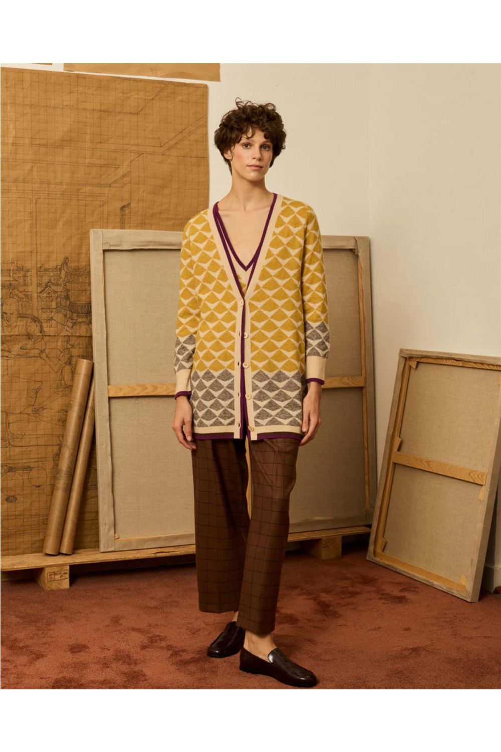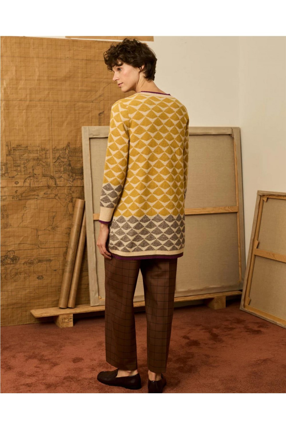Chaqueta larga de punto de mujer greca Is Coming bicolor ideal combinar amarillo marrón 717.CHA.7171