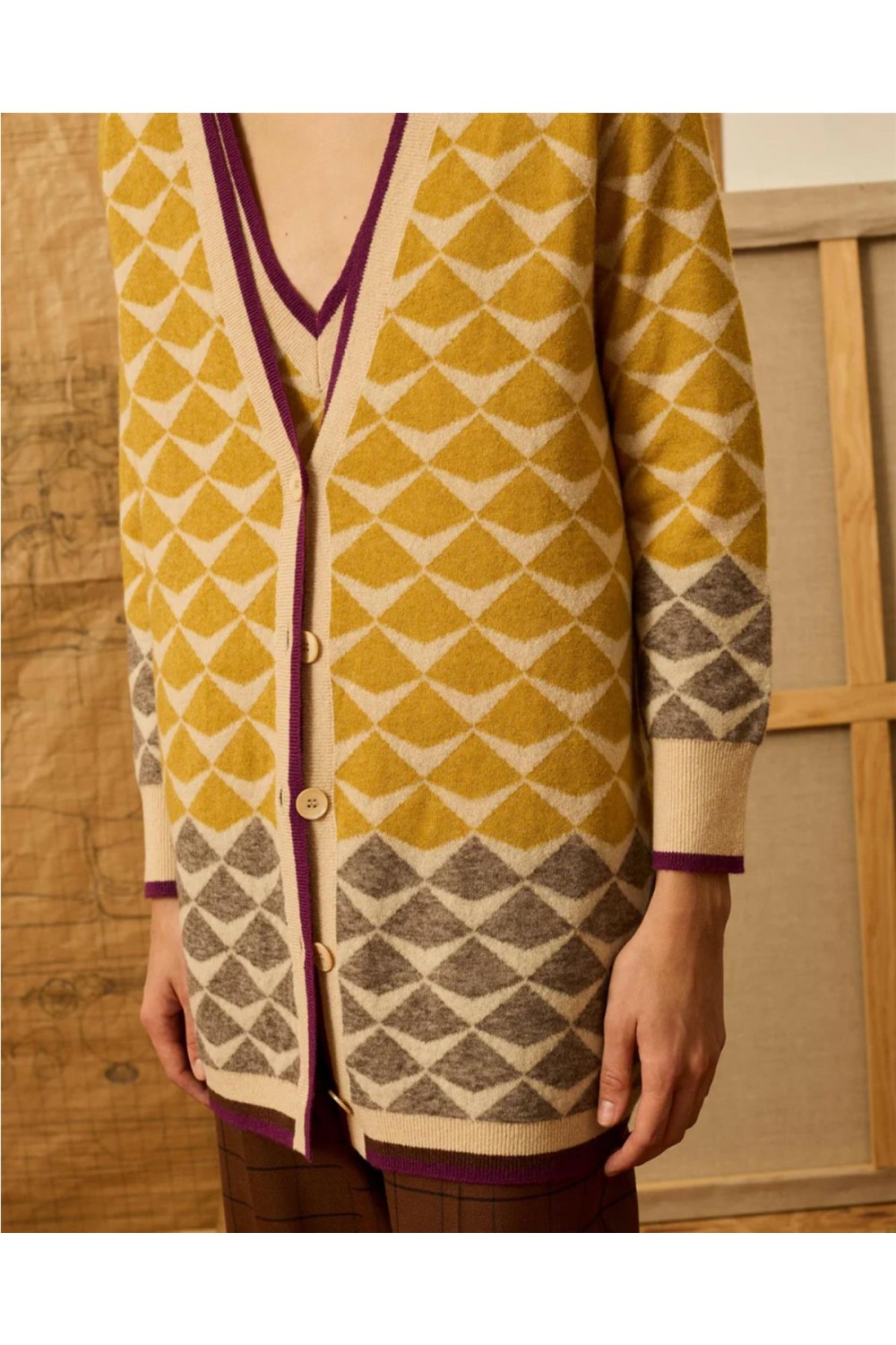 Chaqueta larga de punto con detalle grecas bicolor. Ideal para combinar con jersey y chaleco a juego. Composición: 40% Lana, 33% Nylon, 17% Tencel, 10% Alpaca.