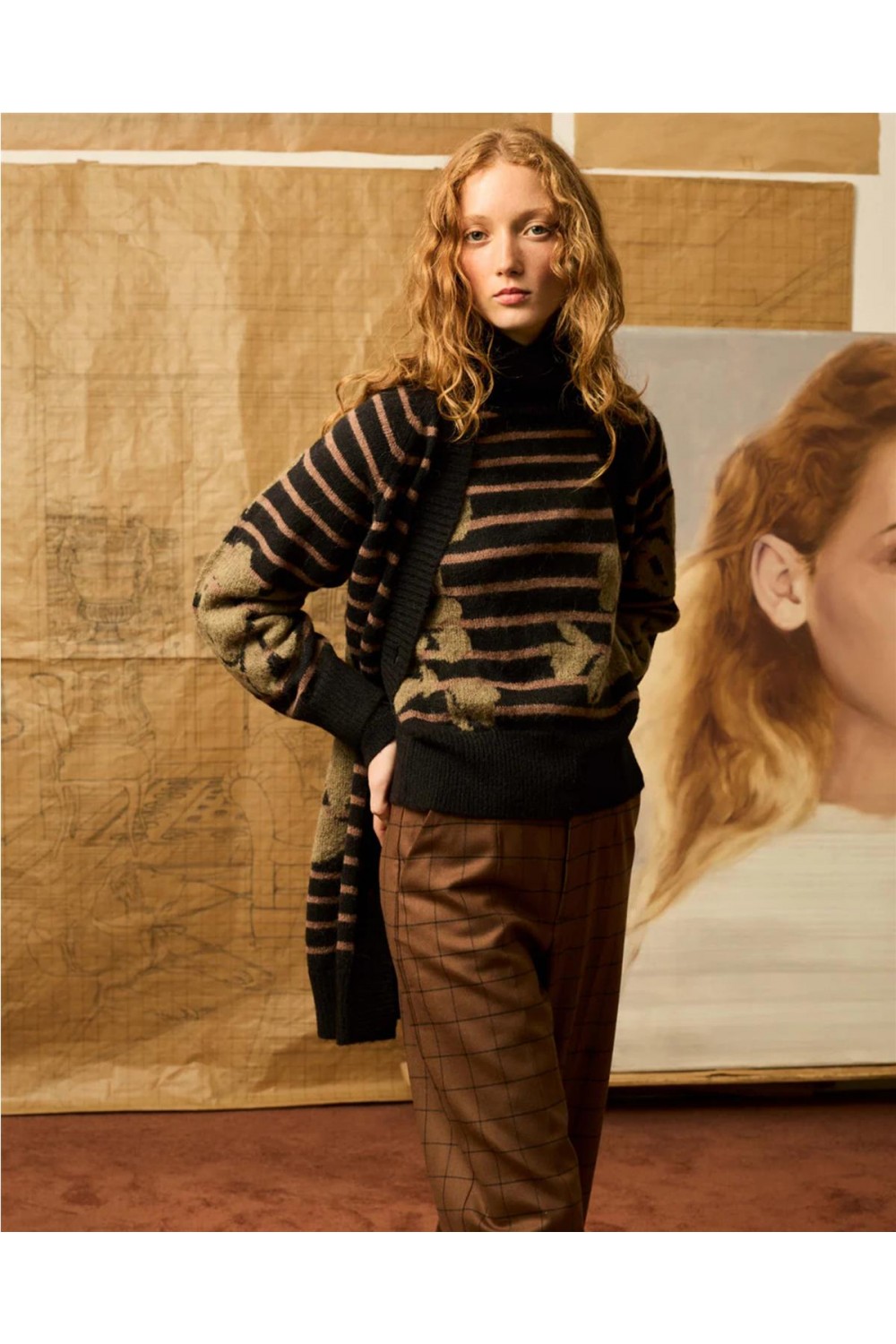 Chaqueta larga de punto de mujer flores Is Coming jacquard pico botones caqui negro 737.CHA.7371