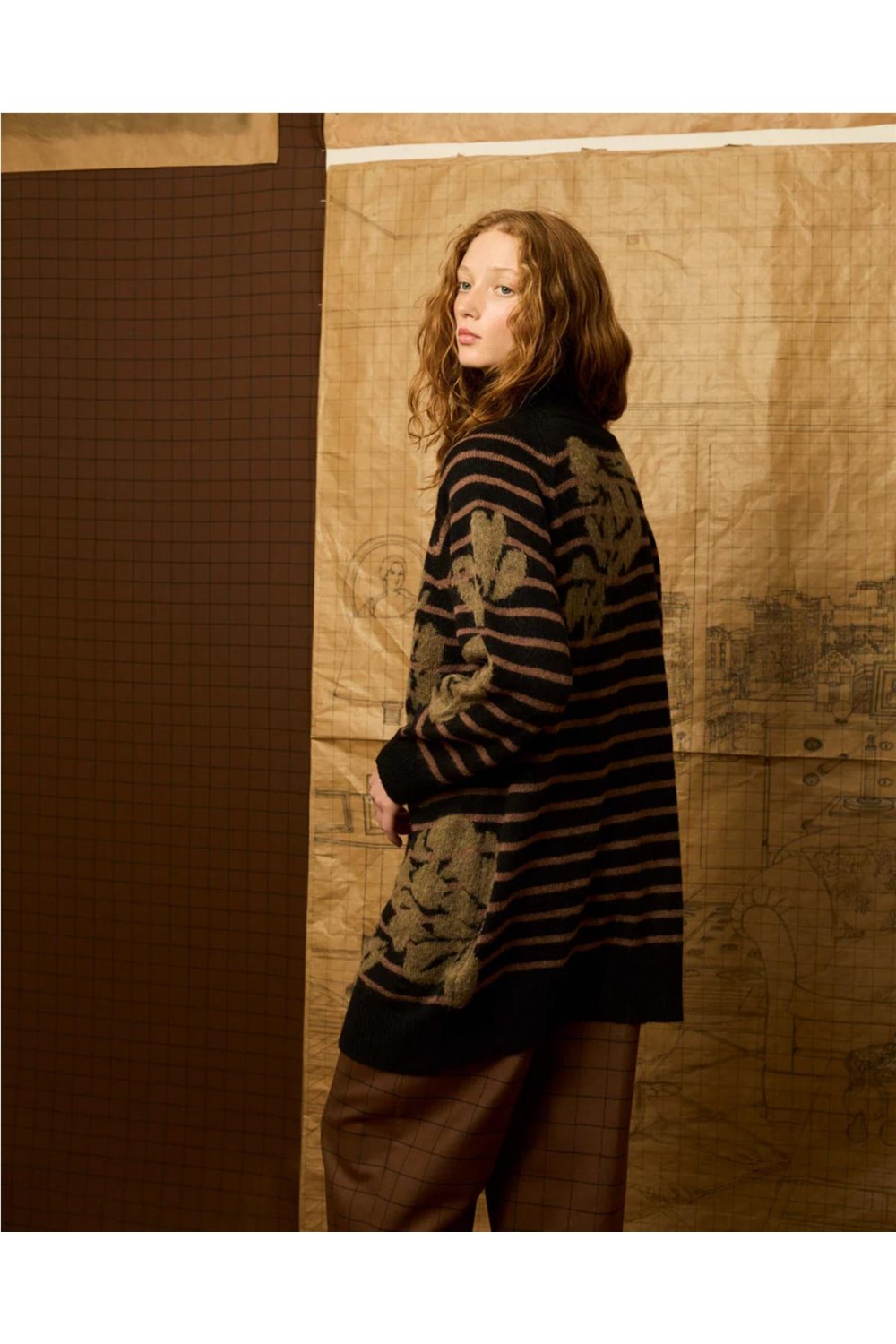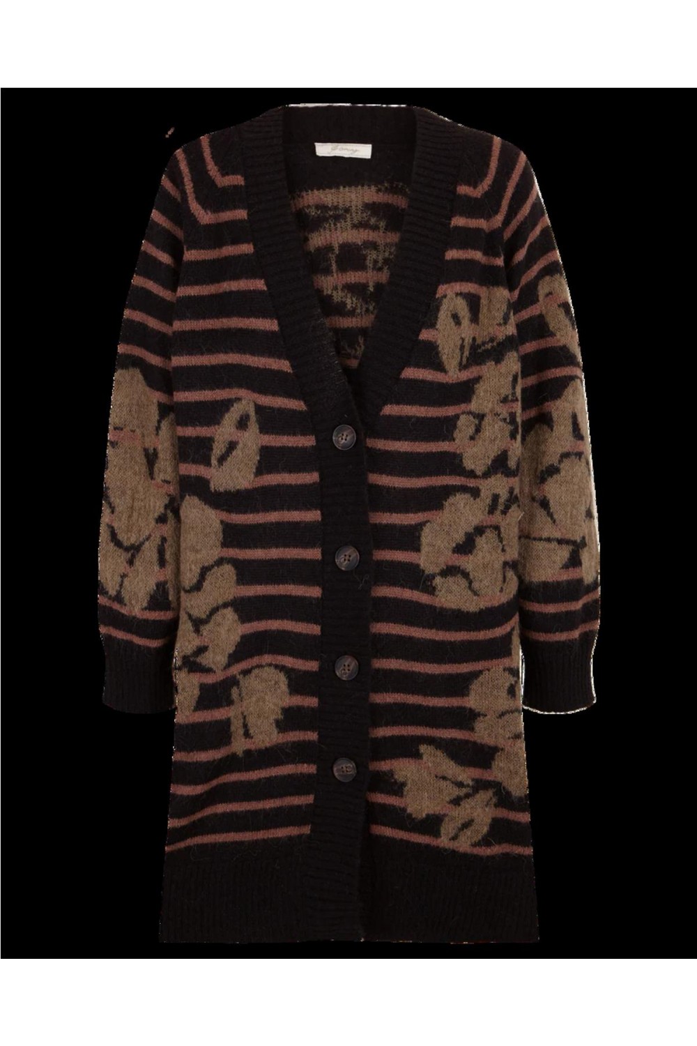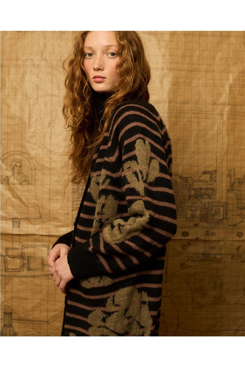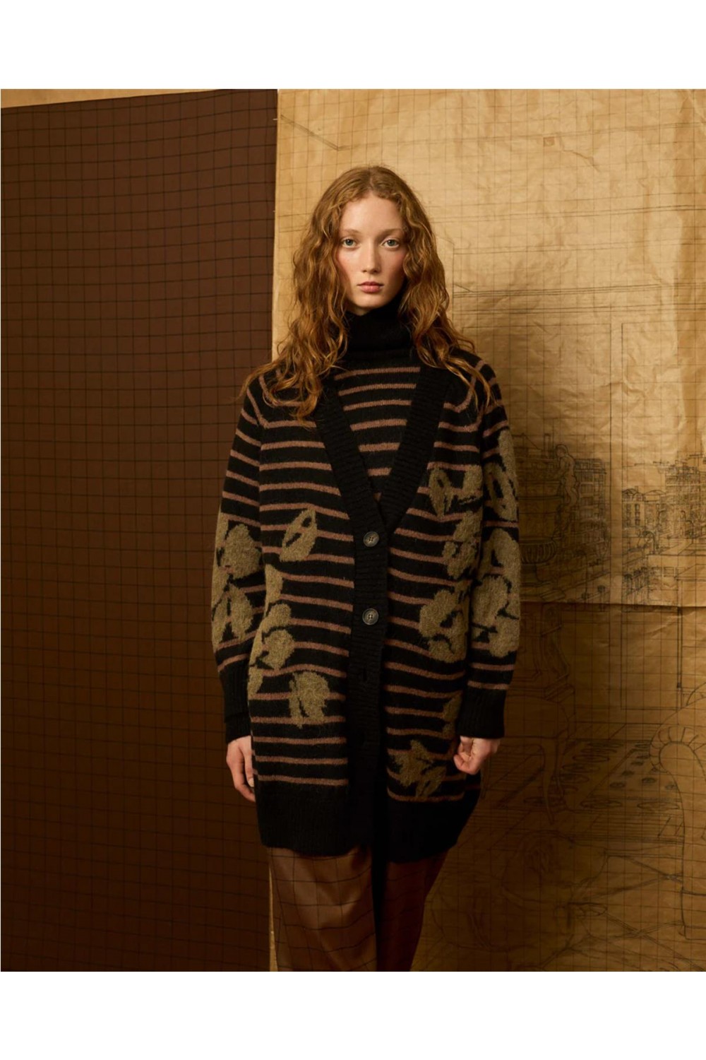 Chaqueta larga de punto, escote a pico y botones. Acabado en jacquard con flores y rayas. Composición: 40% Poliamida, 24% Acrílico, 18% Lana, 18% Alpaca