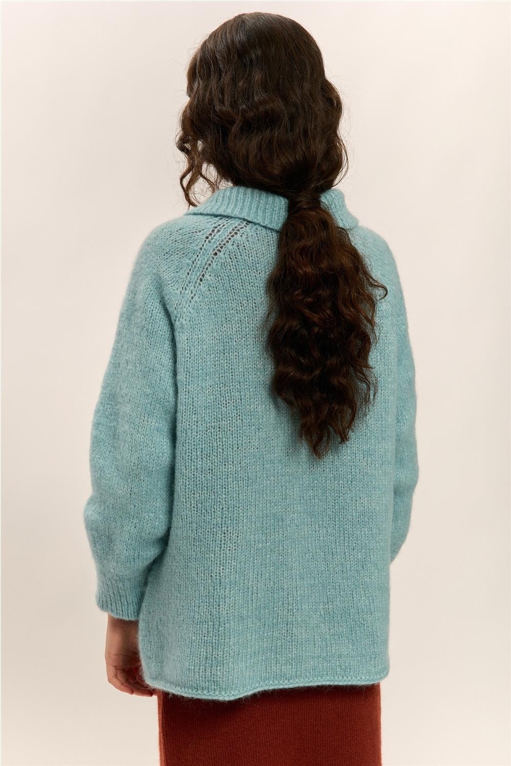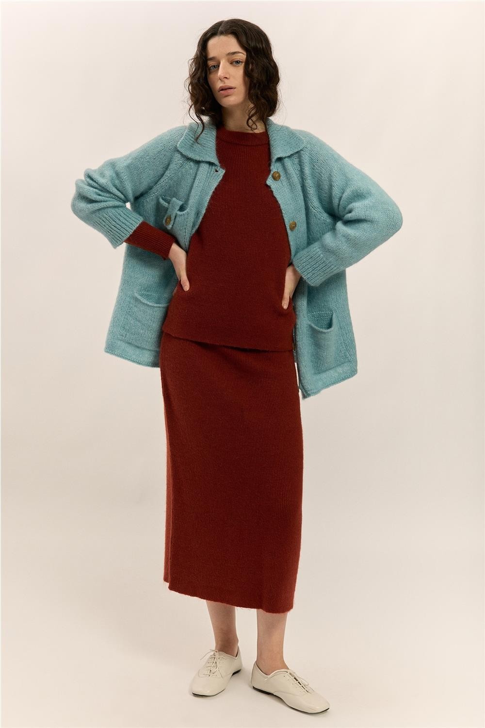 Chaqueta de punto larga y elegante, confeccionada en tejido suave de Alpaca. Presenta un sofisticado cuello solapa y manga ranglán que proporciona un ajuste cómodo. Destaca por sus tres bolsillos de plastrón con solapas: dos inferiores y uno a la altura del pecho con detalle de trabilla. Se completa con puños acanalados y un bajo de caída sutil. Composición: 56% WP Alpaca Superfine, 34% PA Poliamida, 10% WO Lana Merino.