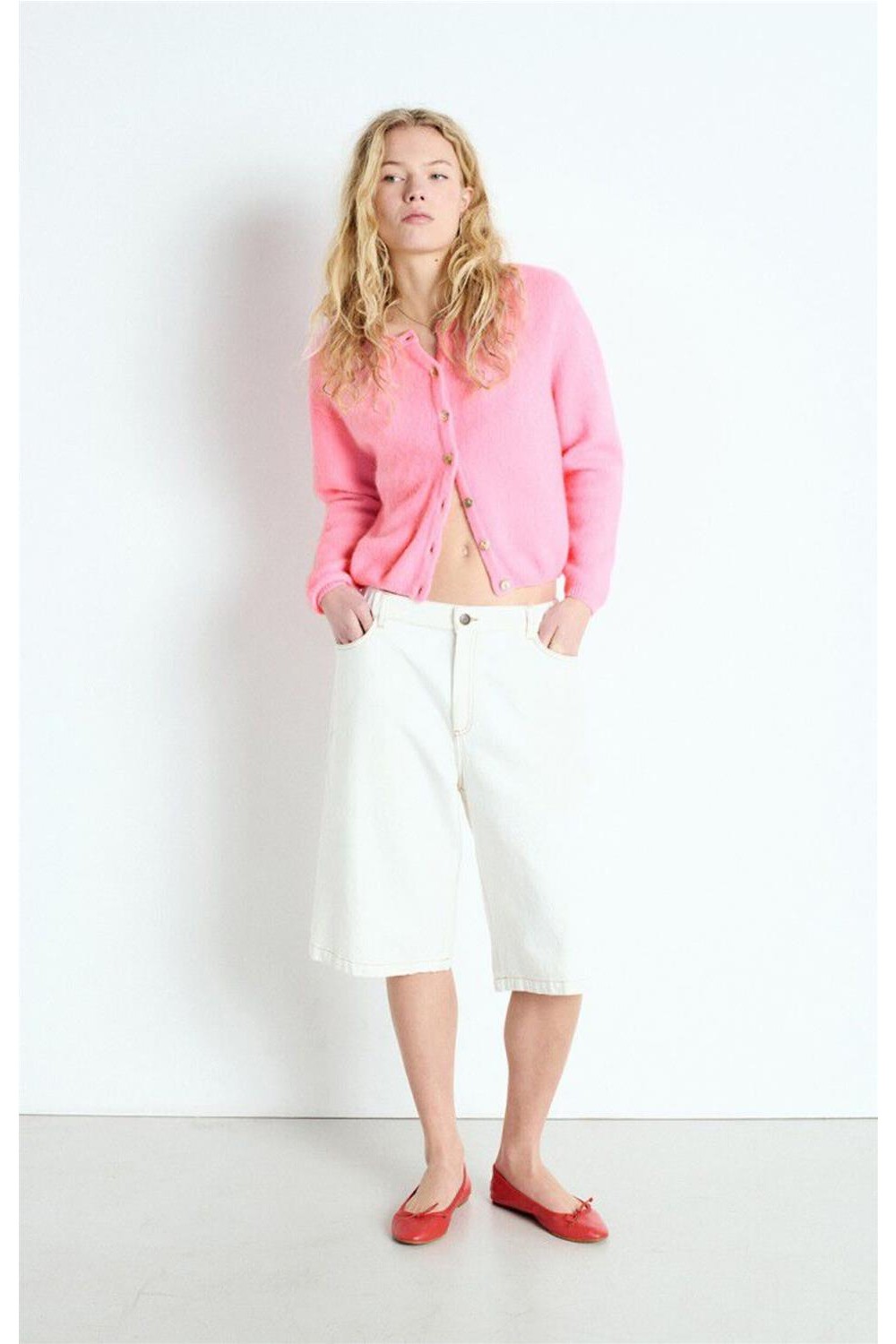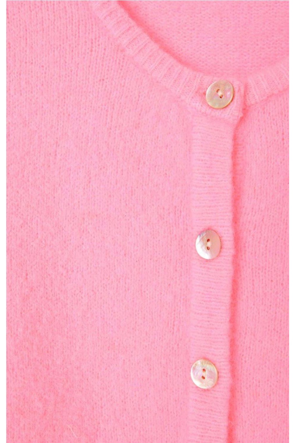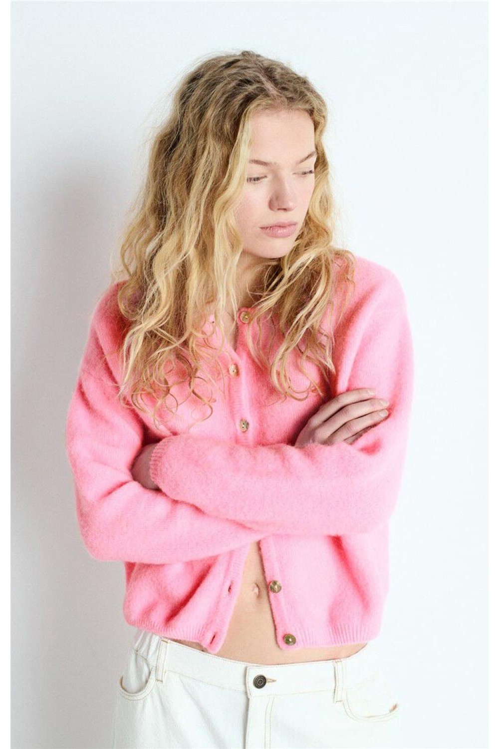 Chaqueta de punto de corte corto y abullonado, tejida con hilo italiano esponjoso que aporta calidez, suavidad y un volumen envolvente. Incluye cuello redondo, cierre con botones nacarados y bordes acanalados que realzan su acabado premium. Su punto compacto y cálido la convierte en un básico icónico, fácil de combinar y perfecto para el día a día. Composición: 34% alpaca, 34% lana, 29% poliamida, 3% elastano.