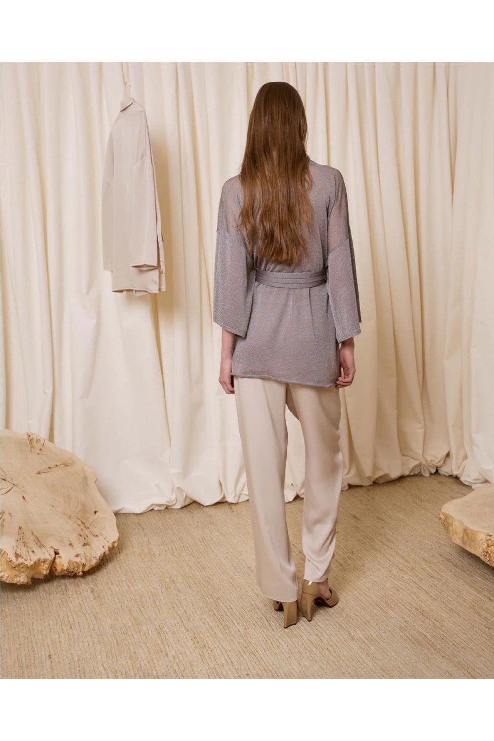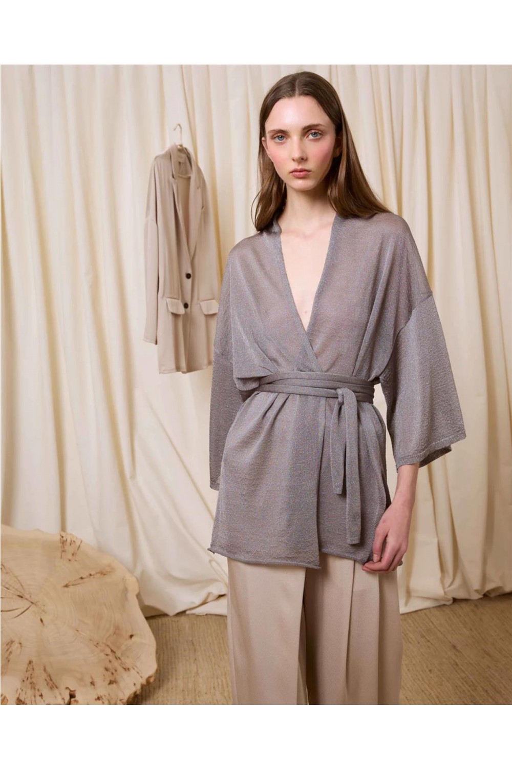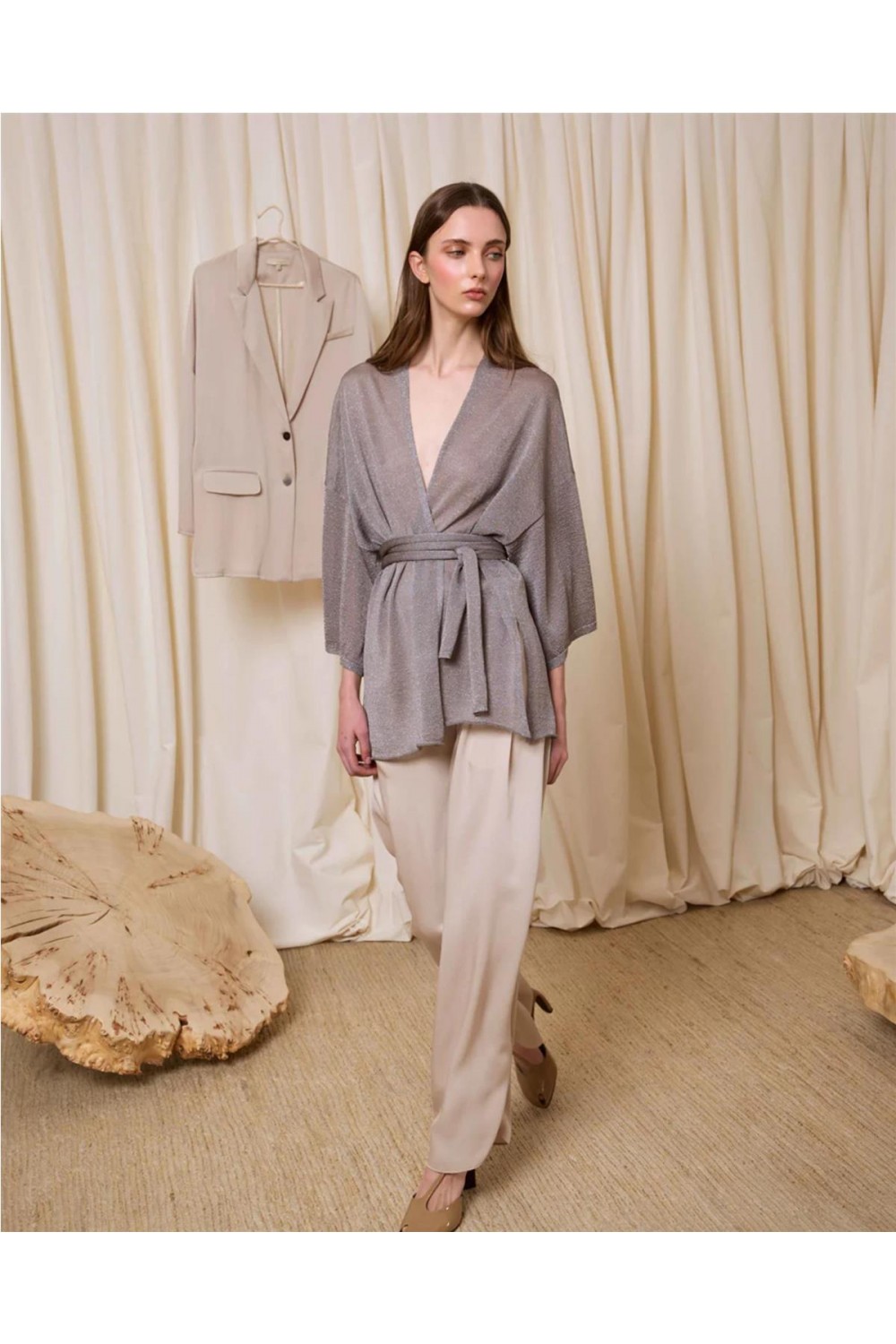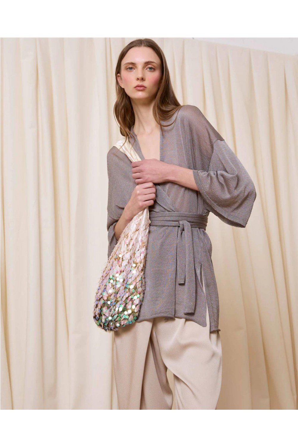 Chaqueta de punto confeccionada con fibra metalizada que aporta un brillo sofisticado. Destaca por sus mangas amplias de diseño contemporáneo y un versátil cinturón a juego que permite múltiples estilos: puede atarse a la cintura para marcar la silueta o al cuello mediante un botón con presilla. Una prenda de caída fluida y elegante, ideal para elevar cualquier look con su acabado luminoso y festivo. Composición: 87% Viscosa, 13% Hilo Metalizado.