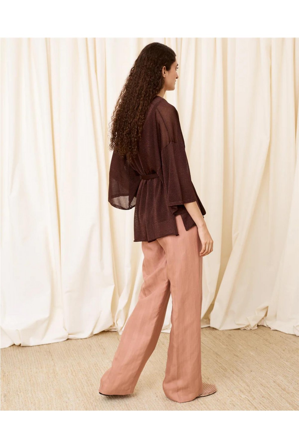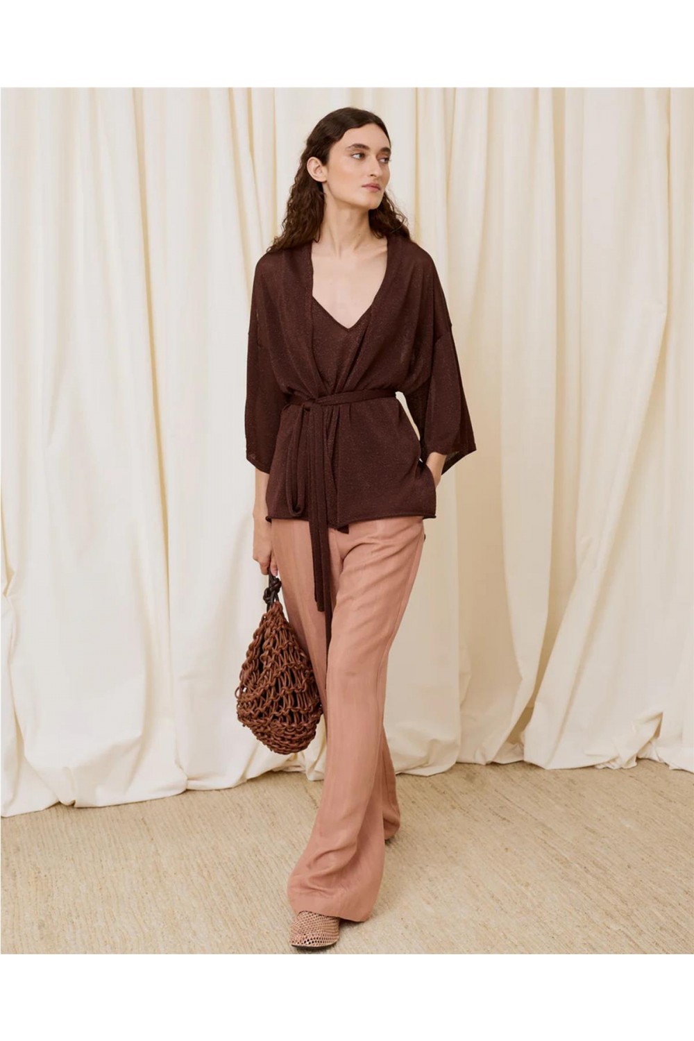 Chaqueta de punto confeccionada con fibra metalizada que aporta un brillo sofisticado. Destaca por sus mangas amplias de diseño contemporáneo y un versátil cinturón a juego que permite múltiples estilos: puede atarse a la cintura para marcar la silueta o al cuello mediante un botón con presilla. Una prenda de caída fluida y elegante, ideal para elevar cualquier look con su acabado luminoso y festivo. Composición: 87% Viscosa, 13% Hilo Metalizado.