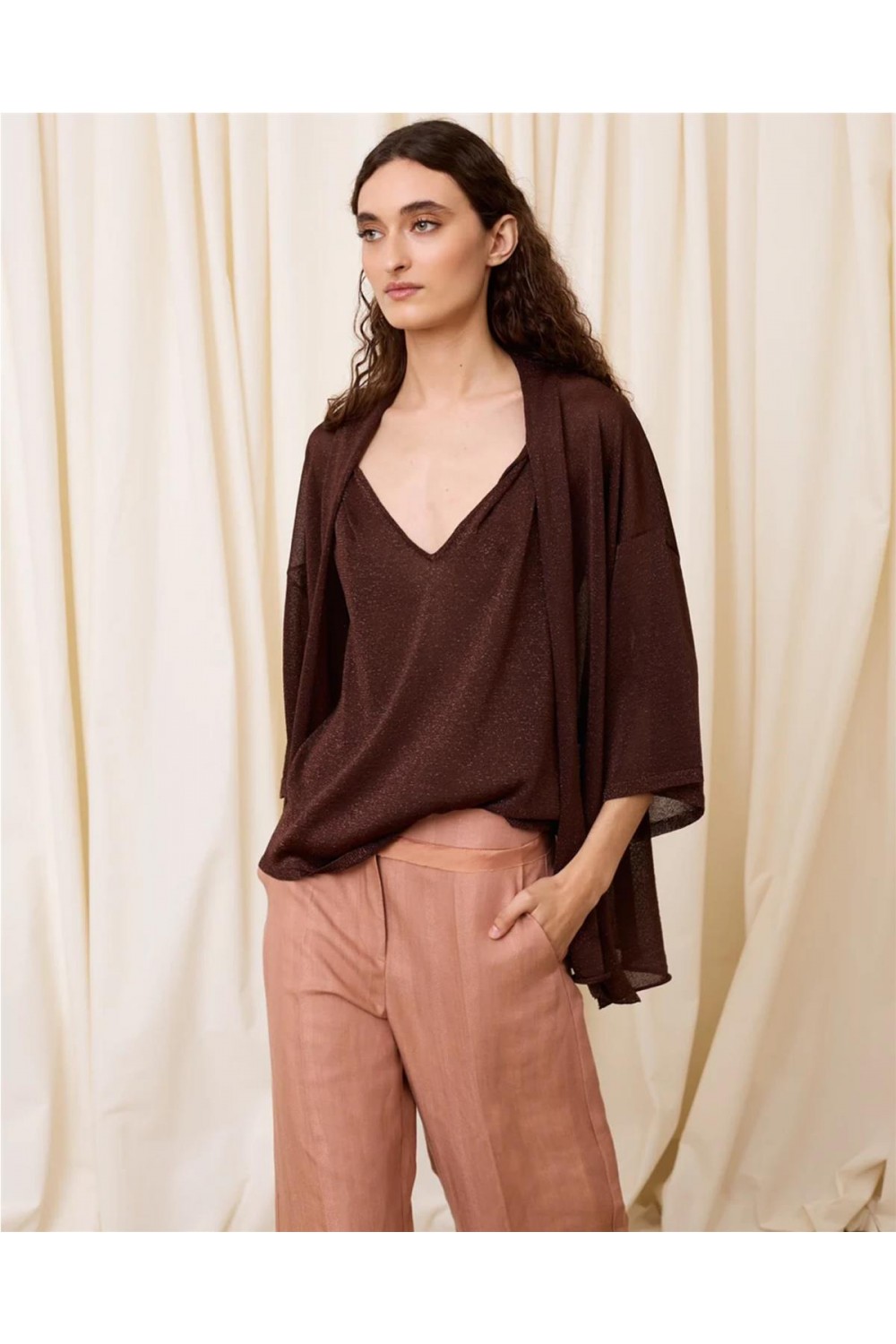Chaqueta de punto de mujer Lurex Is Coming contemporáneo versátil festivo chocolate dorada plata 666.CHA.6663