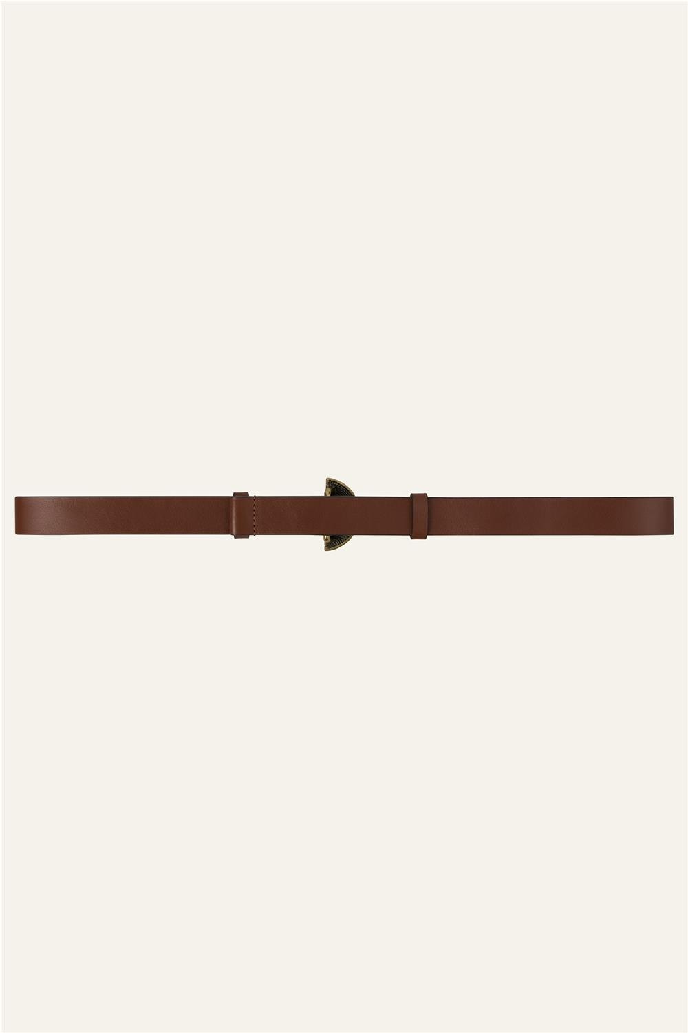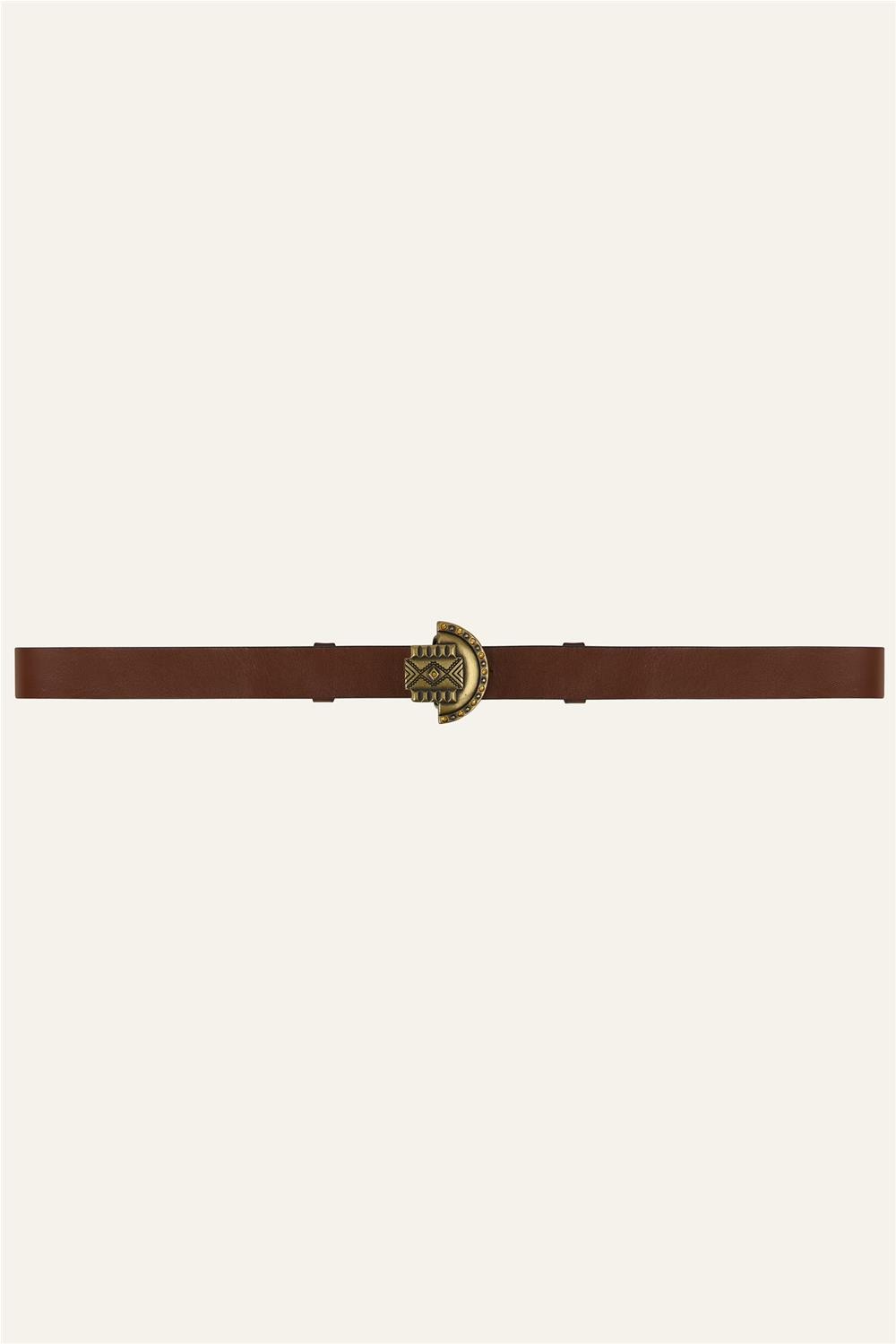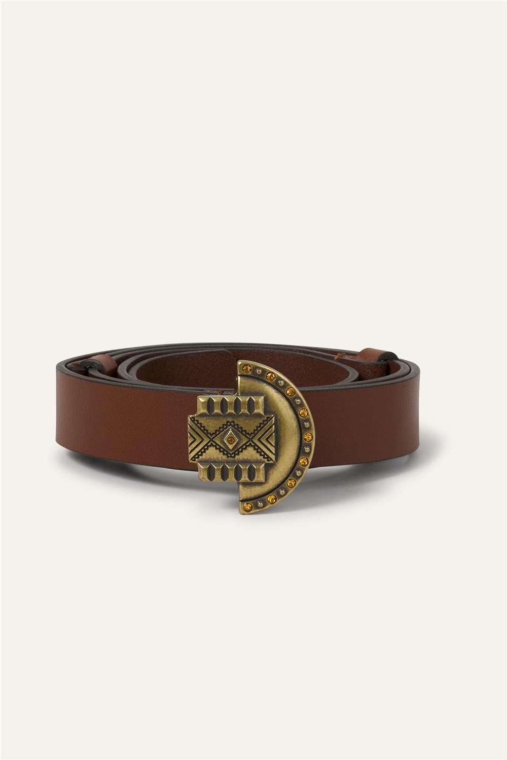 Cinturón estrecho en piel marrón o negro con hebilla metálica con piedras y dibujos étnicos. Composición: 100% CUERO DE CABRA. Ancho 2,5cm.