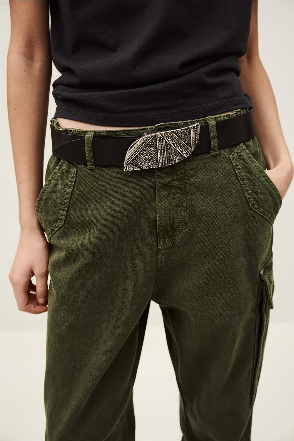 Este cinturón, fabricado en Francia con piel de vacuno de alta calidad, destaca por su acabado vintage y su diseño pensado para estructurar la silueta. Presenta una hebilla plateada elaborada con un original grabado de escamas de serpiente, que aporta un toque de carácter y sofisticación. Es una pieza artesanal y duradera, ideal para realzar la cintura en cualquier conjunto, combinando a la perfección elegancia clásica y detalles modernos. Composición: 100% Piel bovina.