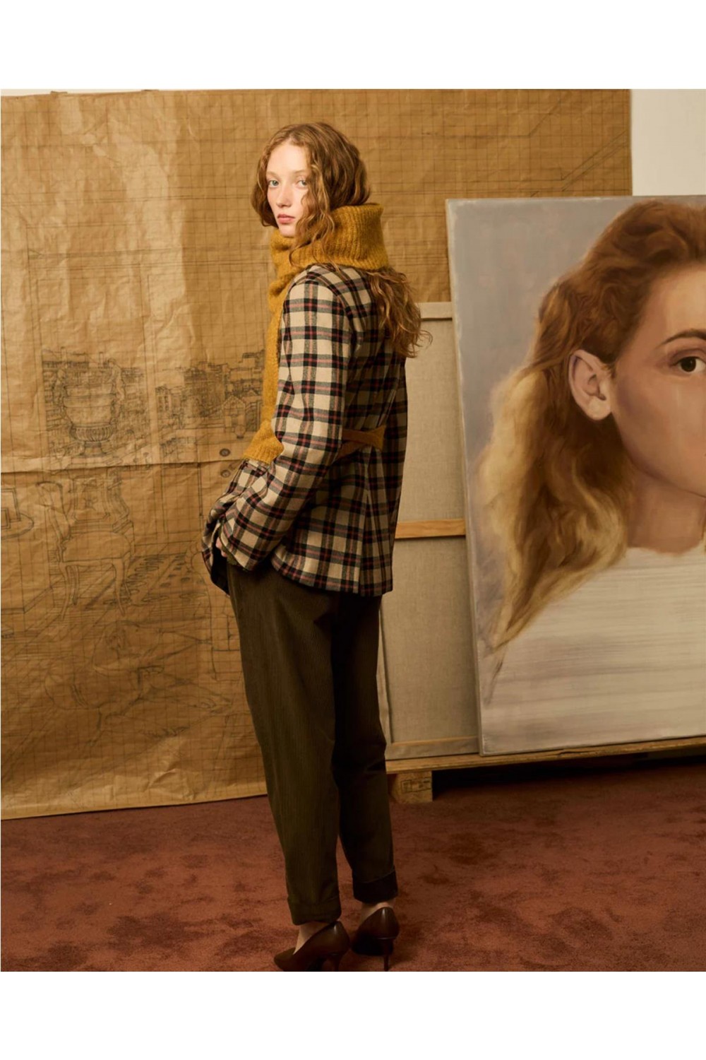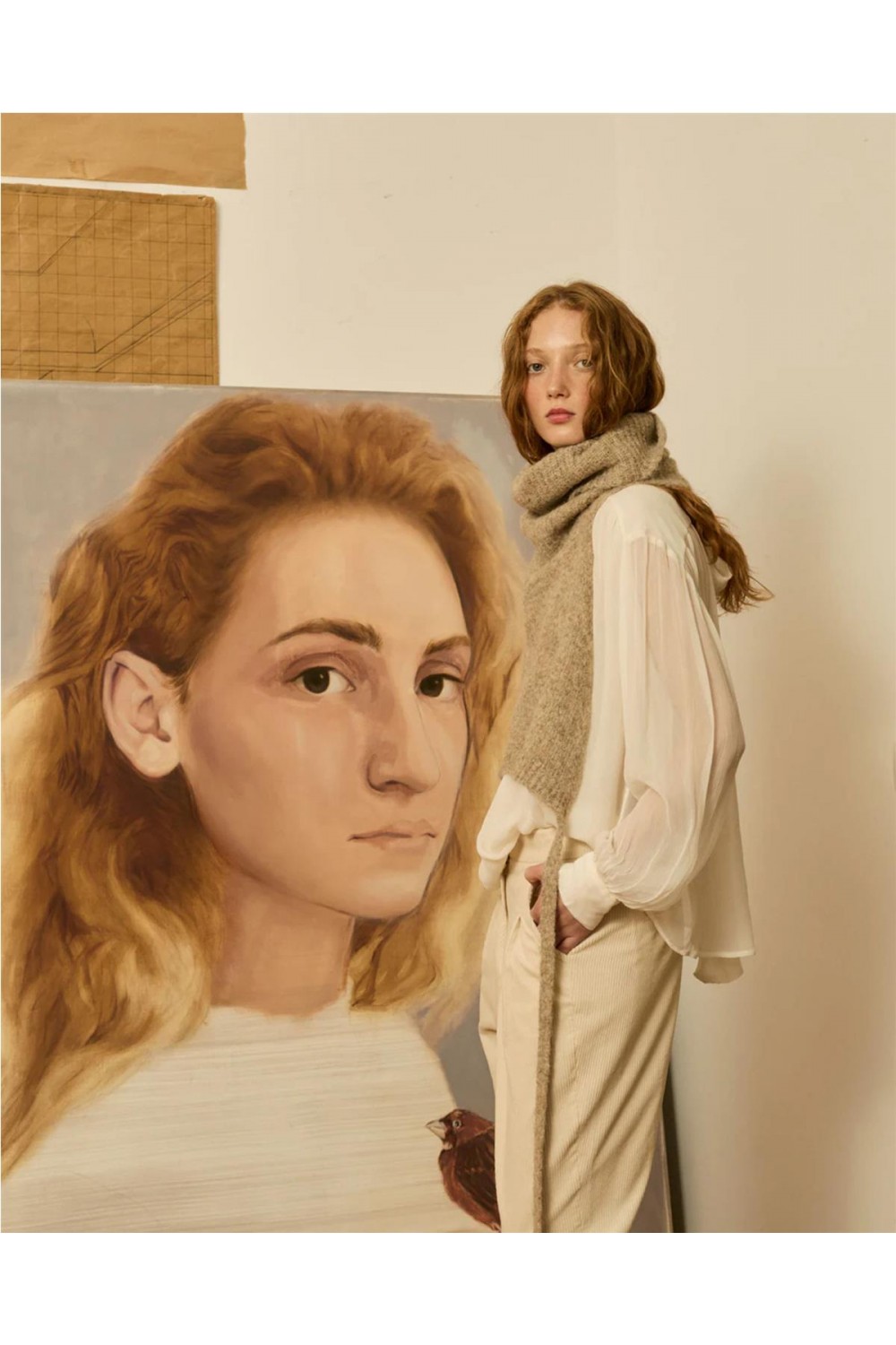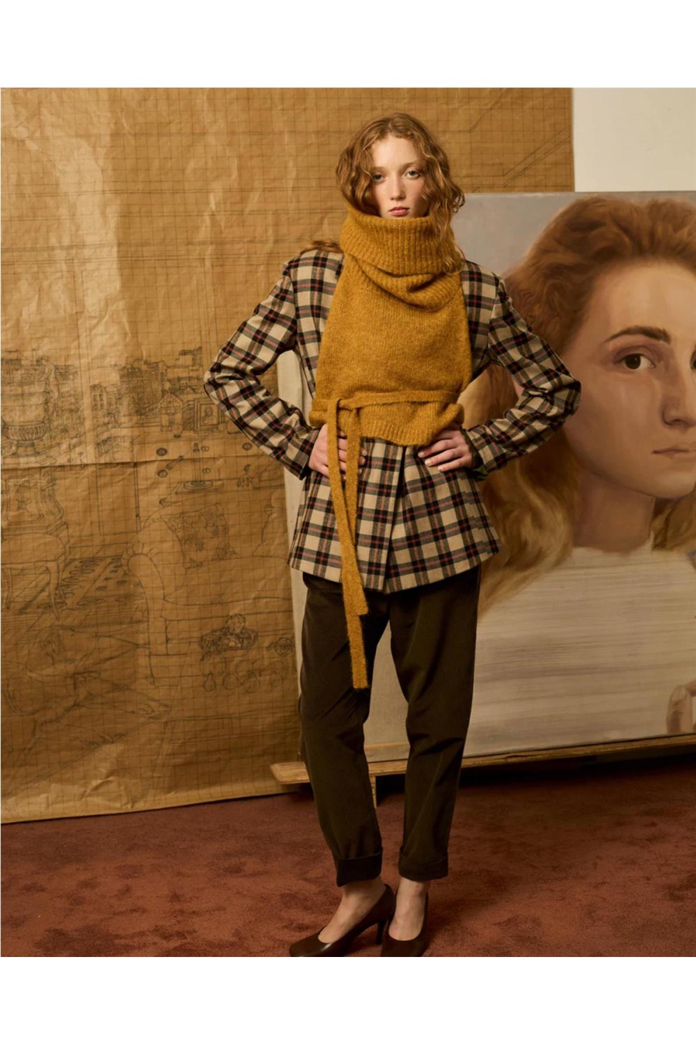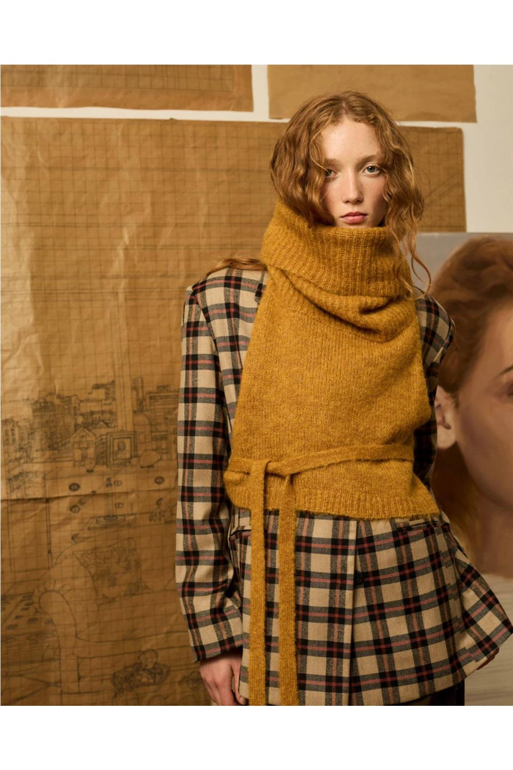 Cuello de lana efecto jersey con espalda descubierta. Cuello alto y pechera. Cinturón para cruzar en la parte delantera. Ideal para combinar con camisa. Composición: 35% Nailon, 26% Poliéster reciclado, 22% Lana, 16% Mohair, 1% Elastano.