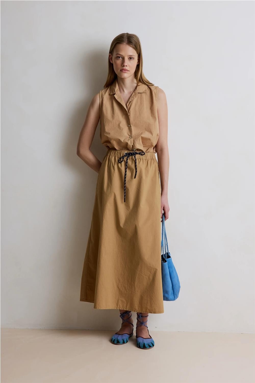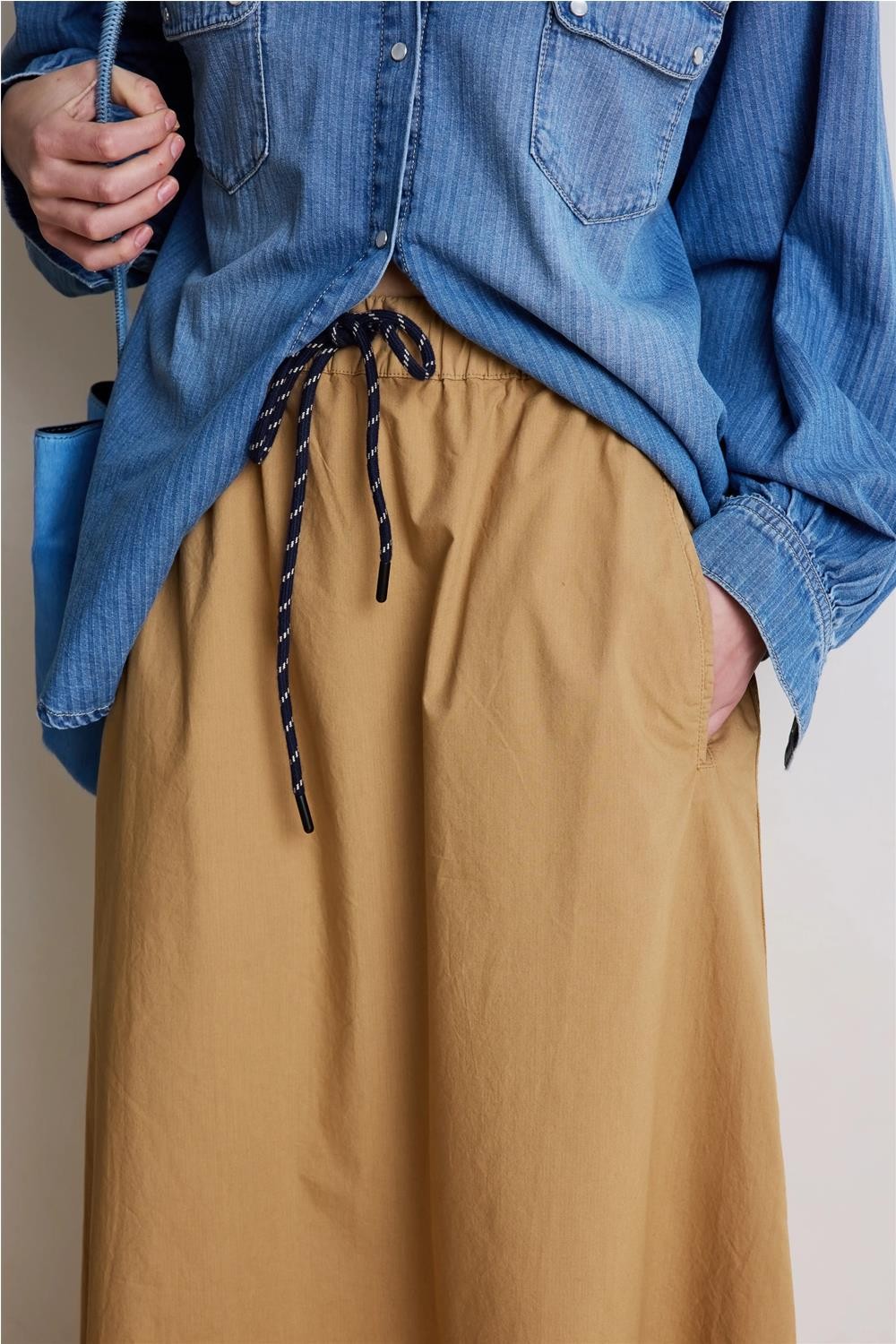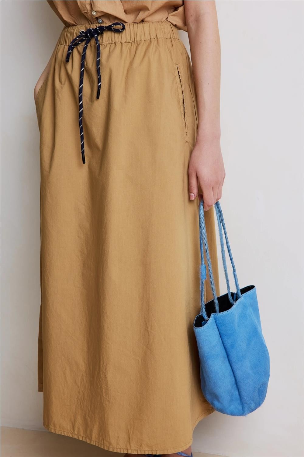 Esta falda larga, confeccionada en un tejido francés de algodón 100%, destaca por su diseño funcional y extremadamente cómodo. Presenta una cintura elástica con dos cordones de fantasía que permiten un ajuste perfecto a la silueta, además de prácticos bolsillos laterales. Gracias a la ligereza de su material y su caída fluida, esta pieza se convierte en una opción sofisticada y versátil para un look femenino y actual en cualquier ocasión. Composición: 100% Algodón.