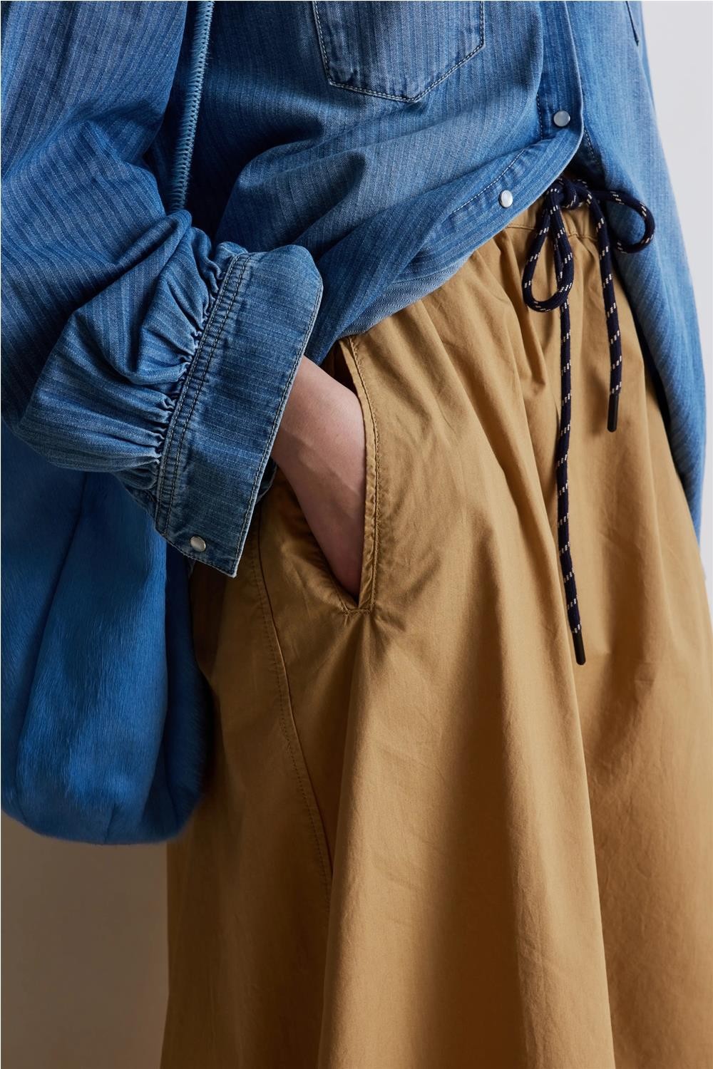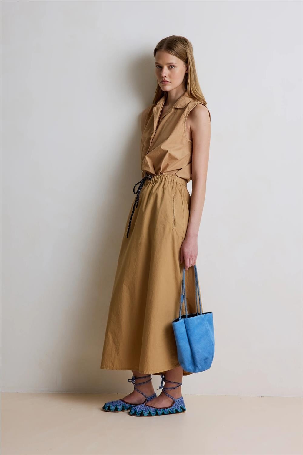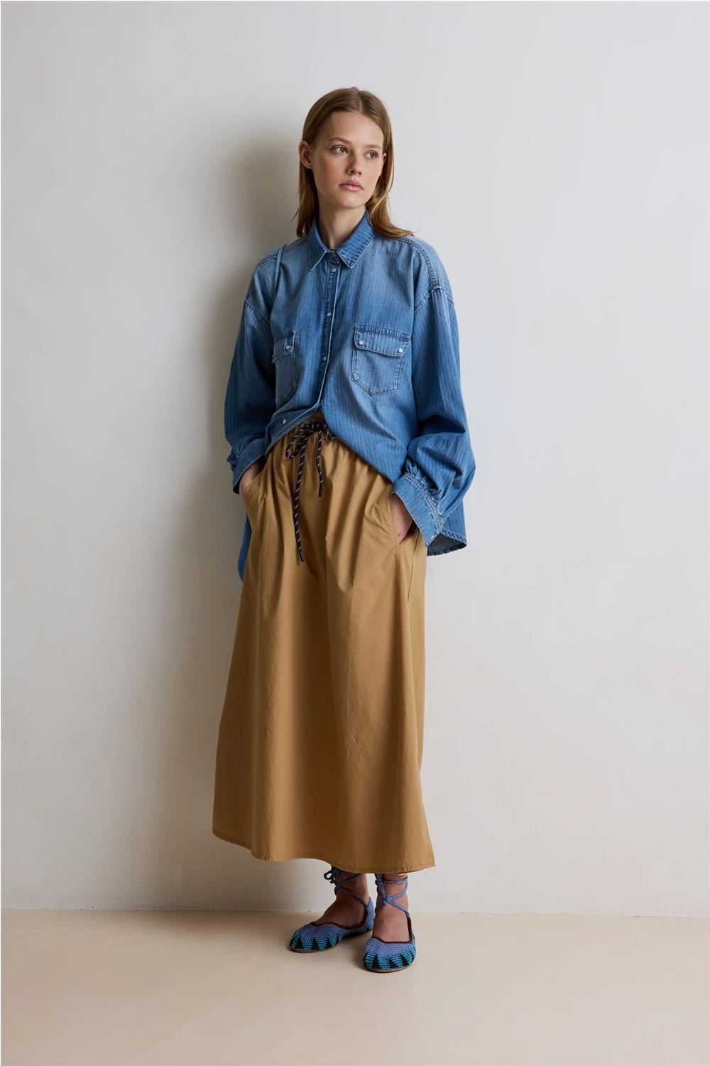 Esta falda larga, confeccionada en un tejido francés de algodón 100%, destaca por su diseño funcional y extremadamente cómodo. Presenta una cintura elástica con dos cordones de fantasía que permiten un ajuste perfecto a la silueta, además de prácticos bolsillos laterales. Gracias a la ligereza de su material y su caída fluida, esta pieza se convierte en una opción sofisticada y versátil para un look femenino y actual en cualquier ocasión. Composición: 100% Algodón.