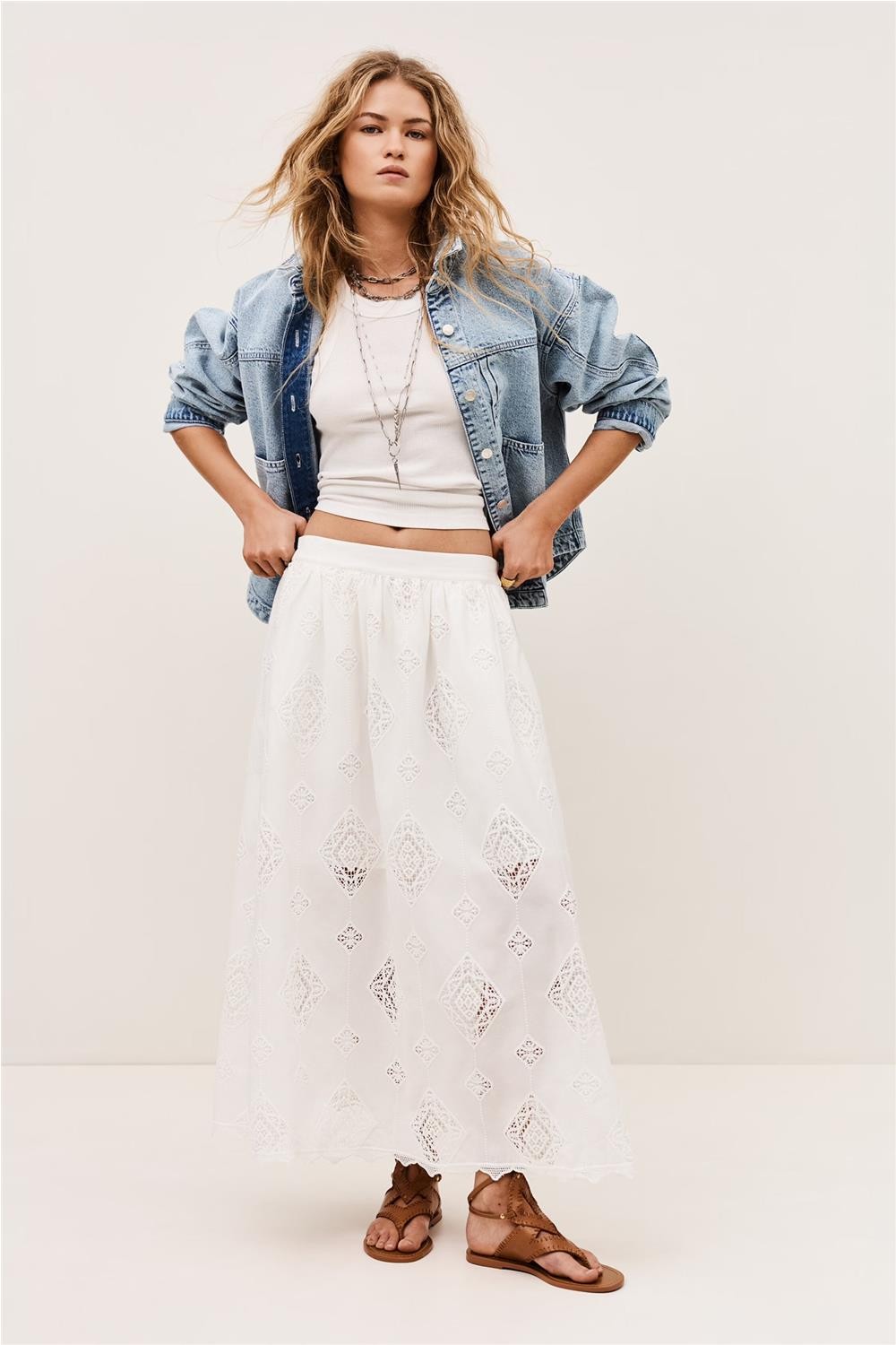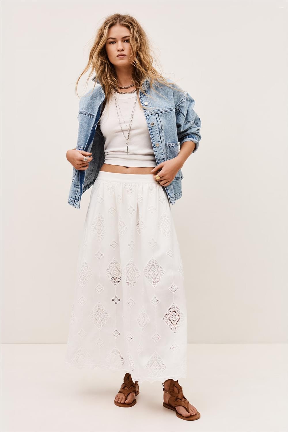 Esta Falda larga, confeccionada en algodón de origen ecológico, destaca por su delicado diseño de bordado inglés y su elegante longitud midaxi. Presenta un corte acampanado con cintura elástica en la parte trasera para un ajuste perfecto y cómodo, además de prácticos bolsillos laterales. Gracias a su forro corto que aporta ligereza y su tejido transpirable, esta pieza se convierte en una opción romántica y sofisticada para cualquier look estival de tendencia. Composición: 100% Algodón.