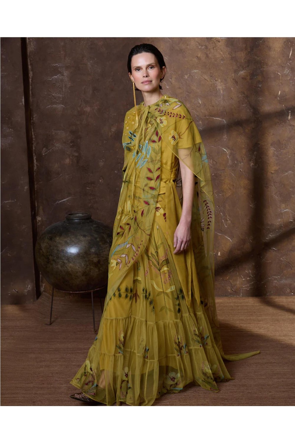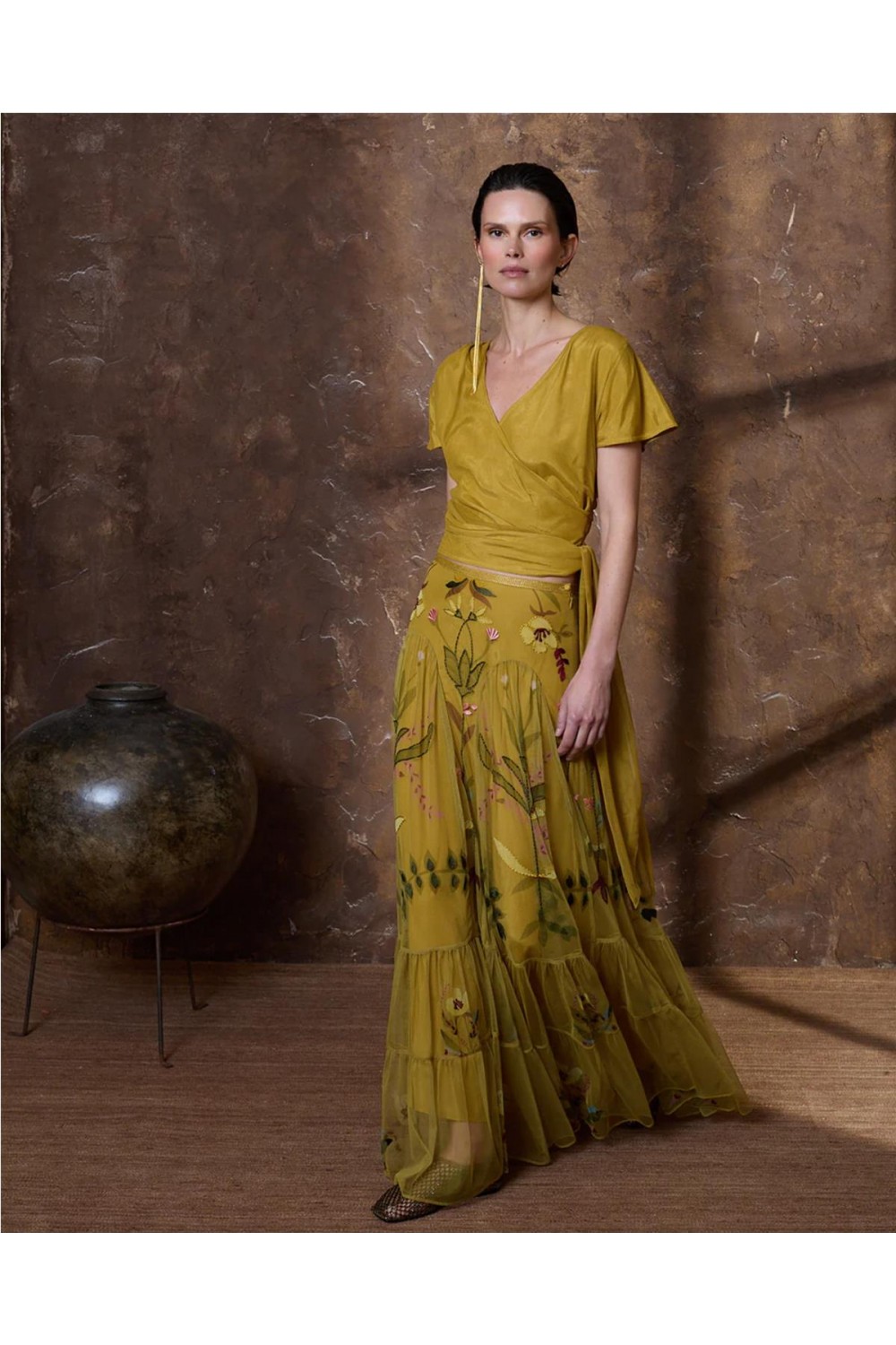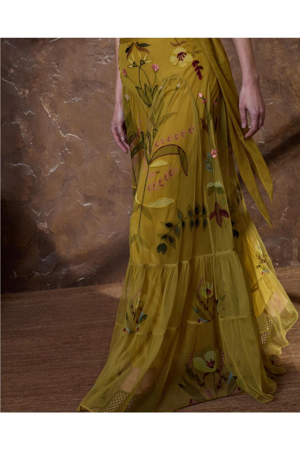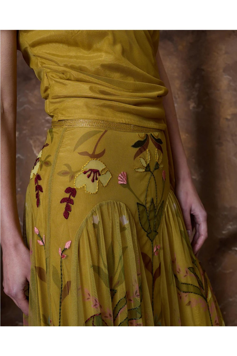 Esta falda larga de tul destaca por sus flores bordadas, haciendo de cada prenda una pieza única de aire artesanal. Presenta una silueta favorecedora ajustada a la cadera, con frunces frontales y cortes en el bajo que aportan movimiento sin añadir volumen. La cinturilla incluye hilo metalizado y cuenta con cierre lateral de cremallera y botón forrado. Es una pieza especial y sofisticada, ideal para quienes buscan un diseño exclusivo con detalles cuidados. Composición: 100% Poliéster.