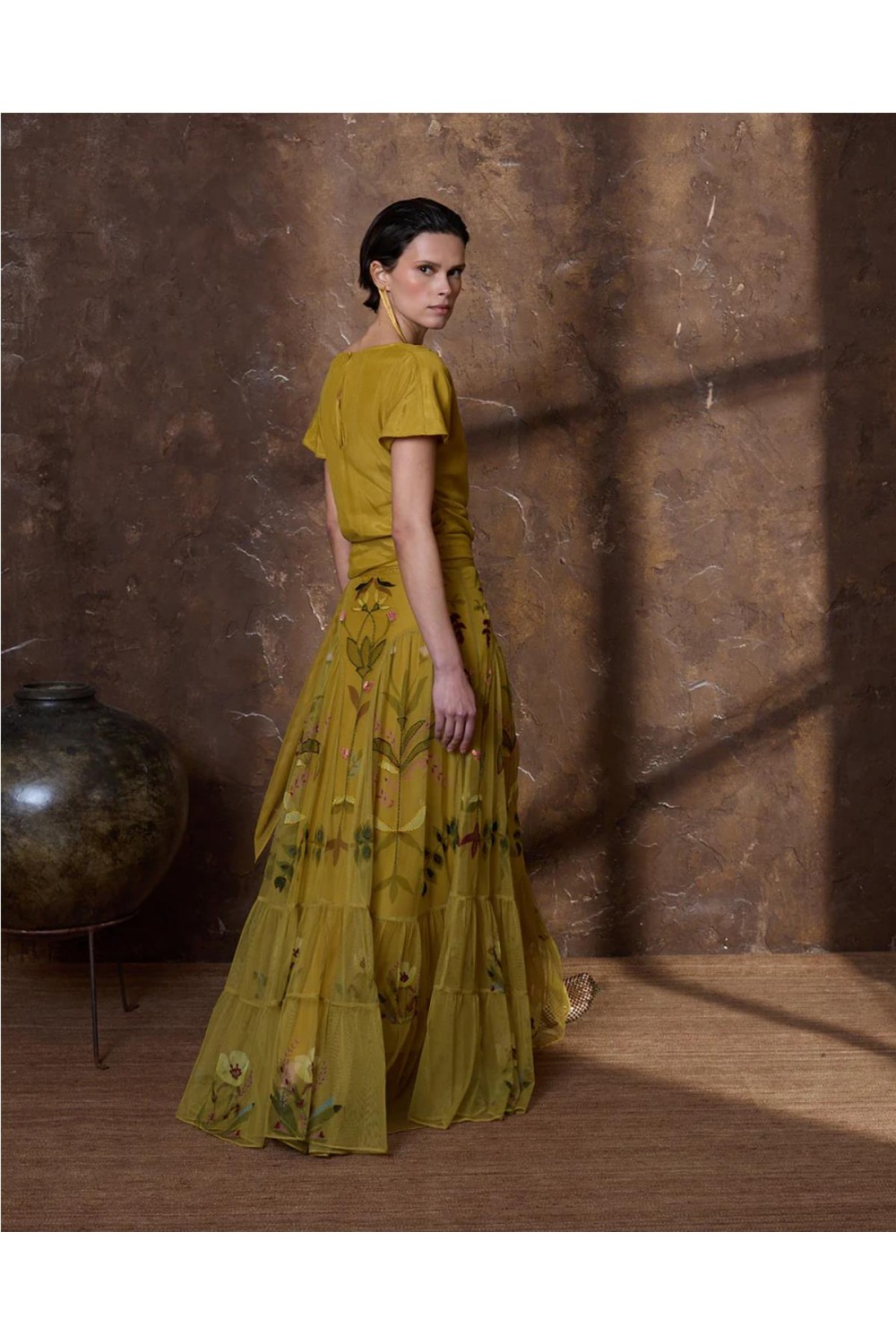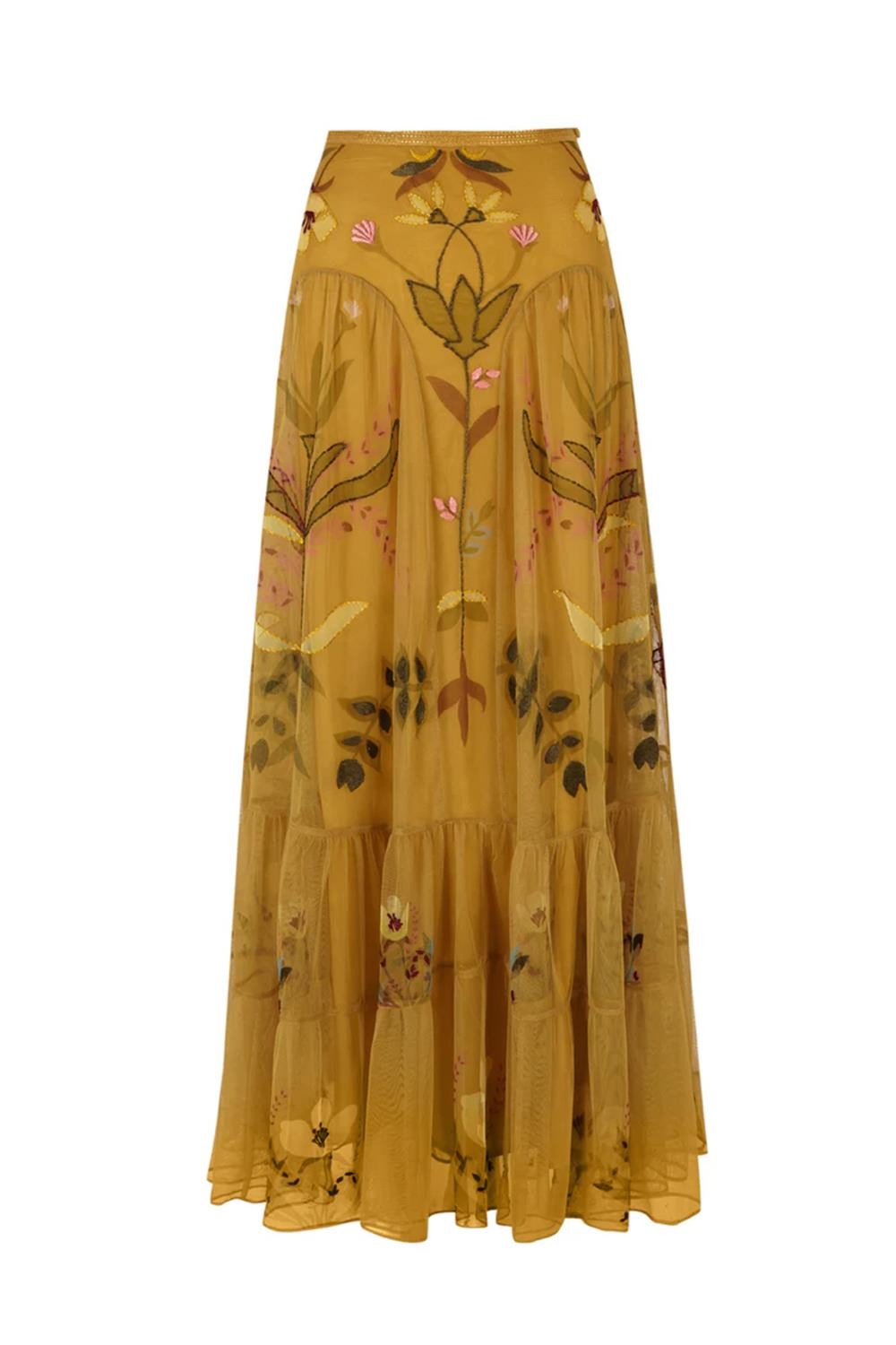 Falda larga de mujer bordada Is Coming flores tul cremallera gris azulado mostaza 648.FAL.6482