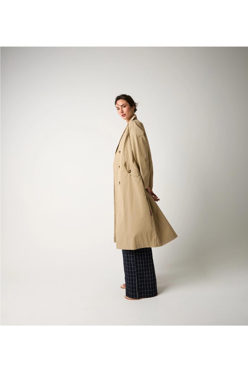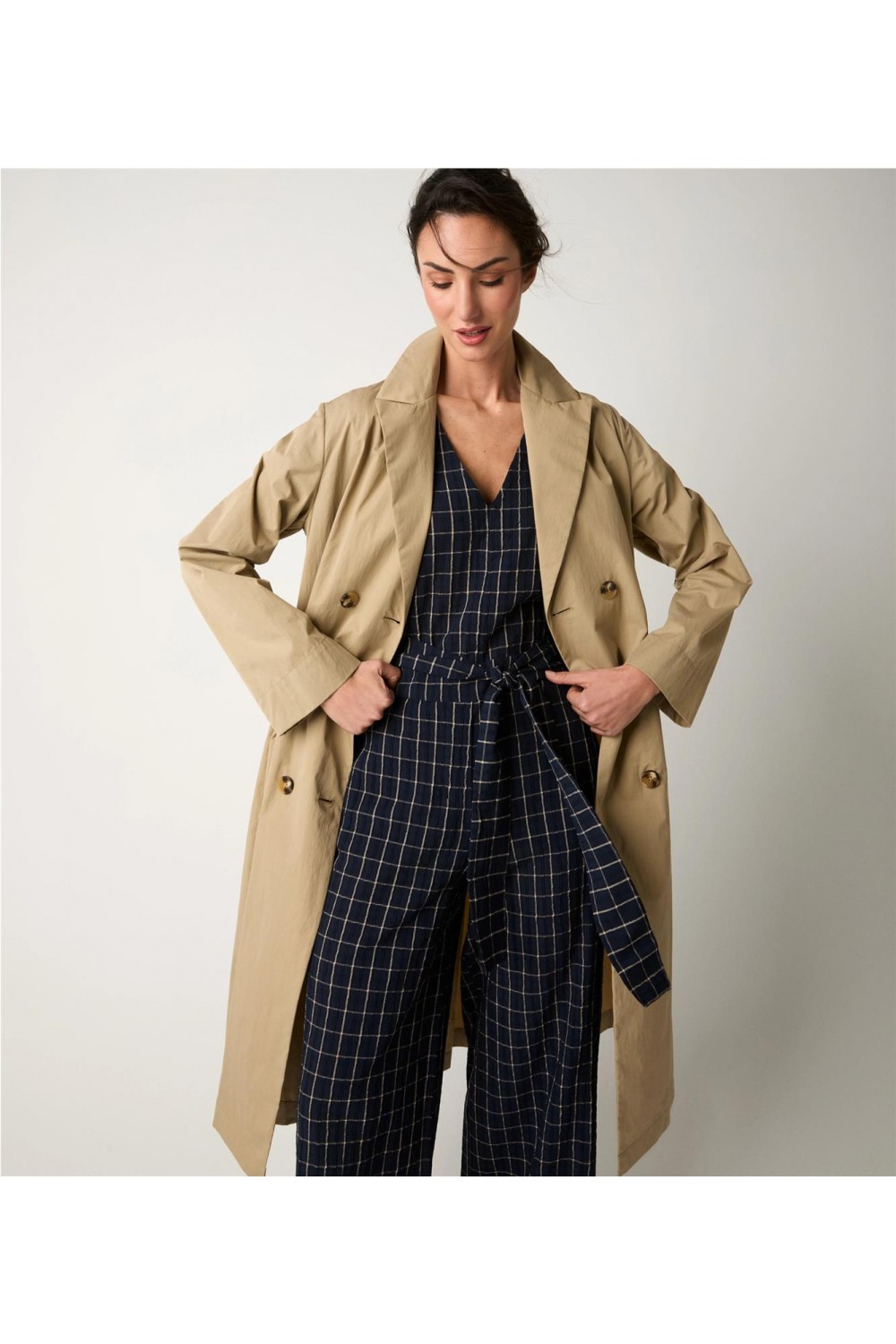 Esta gabardina destaca por su confección en una mezcla de algodón técnico con acabado repelente al agua. Presenta una silueta estructurada de diseño cruzado con cierre de doble botonadura, cuello con solapas clásicas y prácticos bolsillos con tapeta. Es una prenda de elegancia atemporal que combina funcionalidad y estilo, ideal para protegerse con sofisticación en los días de lluvia gracias a su impecable cuidado en los detalles. Composición: 65% Algodón, 35% Poliamida.