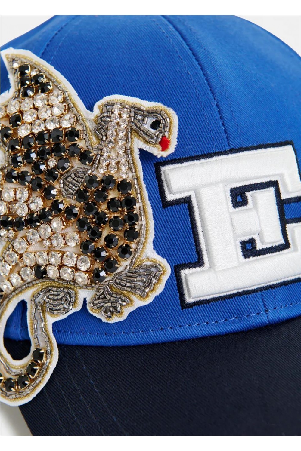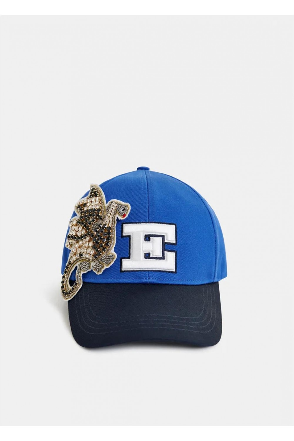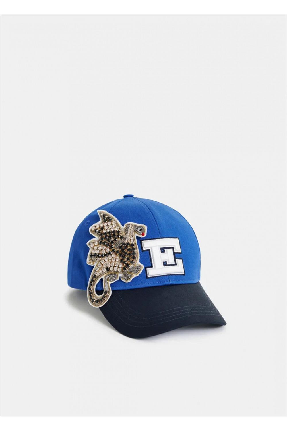 Gorra estilo baseball cap, confeccionada en lona de algodón resistente. Este accesorio destaca por su diseño bicolor y los detalles bordados en el frontal y la parte trasera. Incorpora un parche de un pájaro adornado con brillantes en el frente, y un bordado de gran tamaño con una inicial. Dispone de un cierre de velcro ajustable en la parte posterior para un ajuste cómodo y seguro. Composición: 100% algodón. Bordado: 100% poliéster. Bordado: 60% cristal, 20% poliéster, 20% latón.
