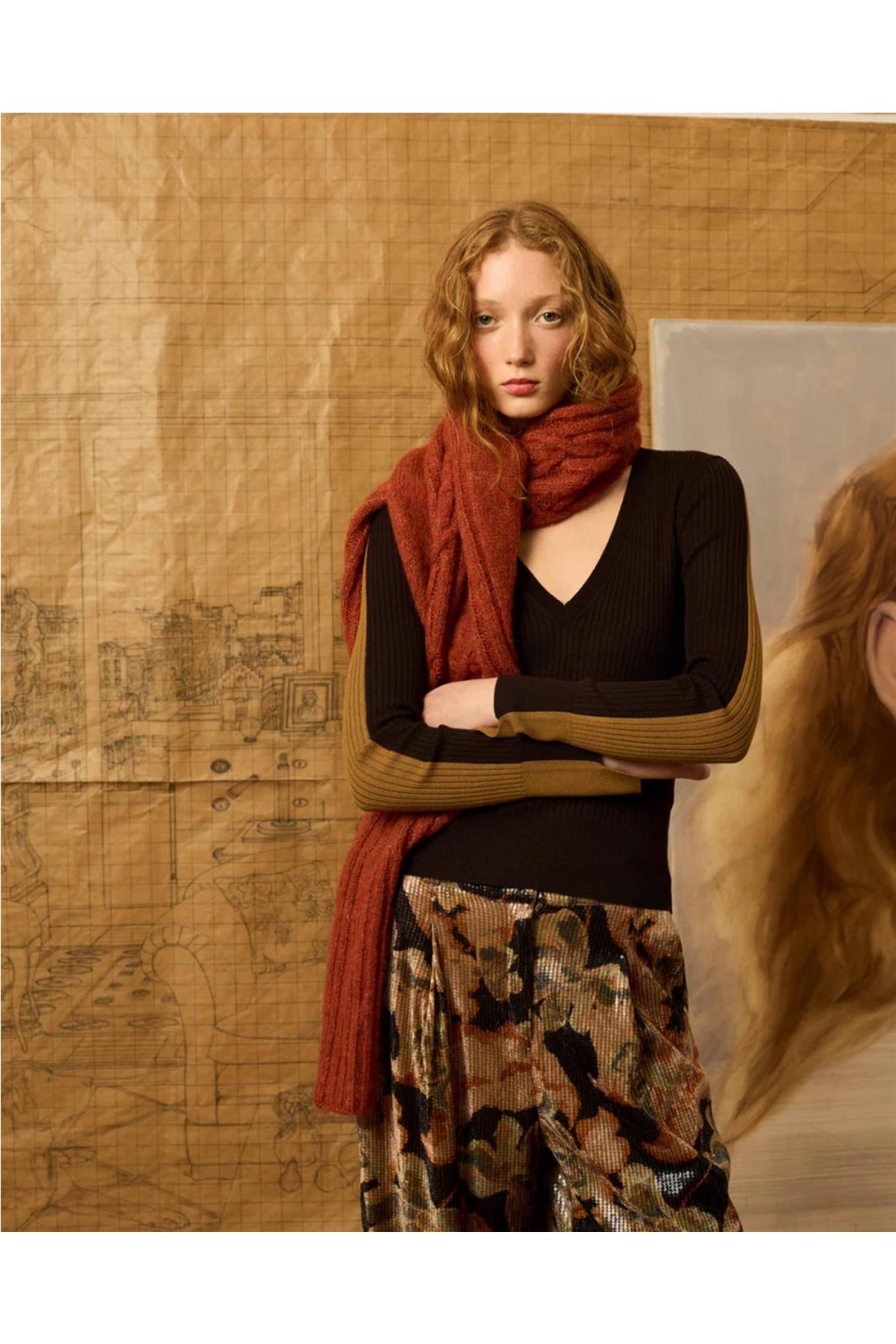 Jersey de punto con escote en pico, entallado y de canalé. Acabado bicolor. Composición: 72% Viscosa, 28% Poliéster.