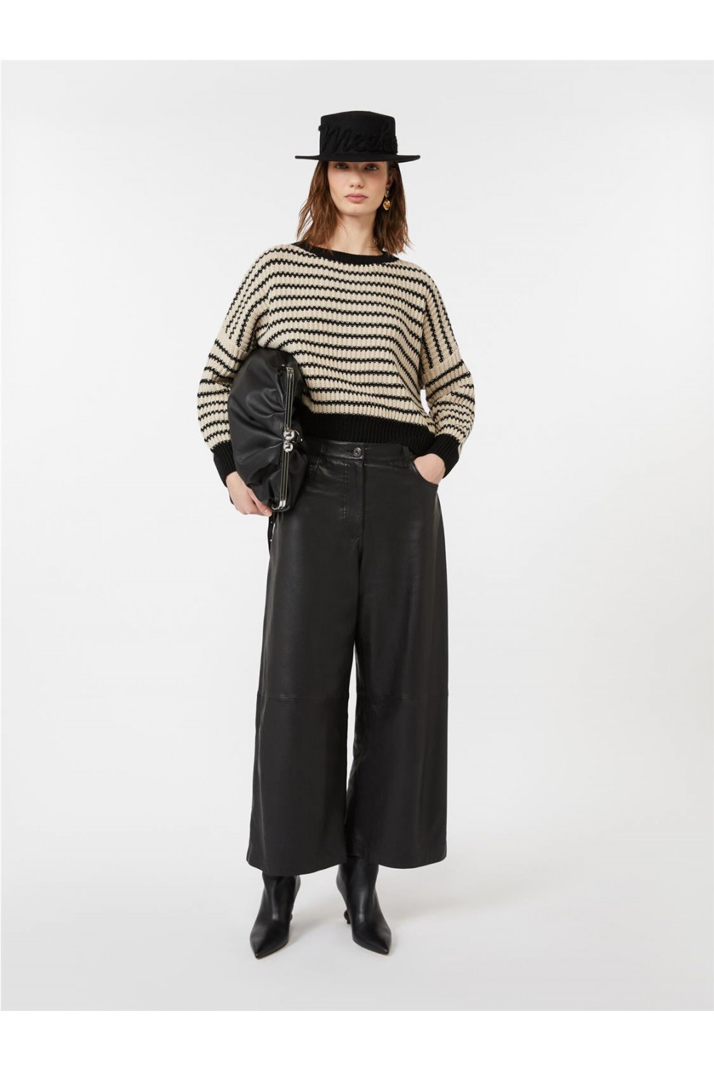 Jersey de punto de corte cropped a la cintura y silueta ancha, ideal para combinar con prendas de talle alto. Confeccionado con hilado de pura lana virgen, destaca por estar elaborado completamente en punto de canalé inglés, aportando una textura rica y un gran volumen. El diseño incluye un cuello redondo clásico y mangas largas con sisa caída, realzando su estilo contemporáneo y cómodo. Composición: 100% lana virgen.