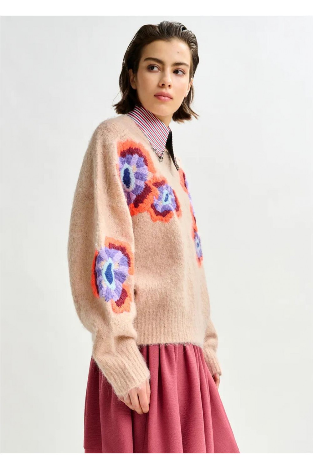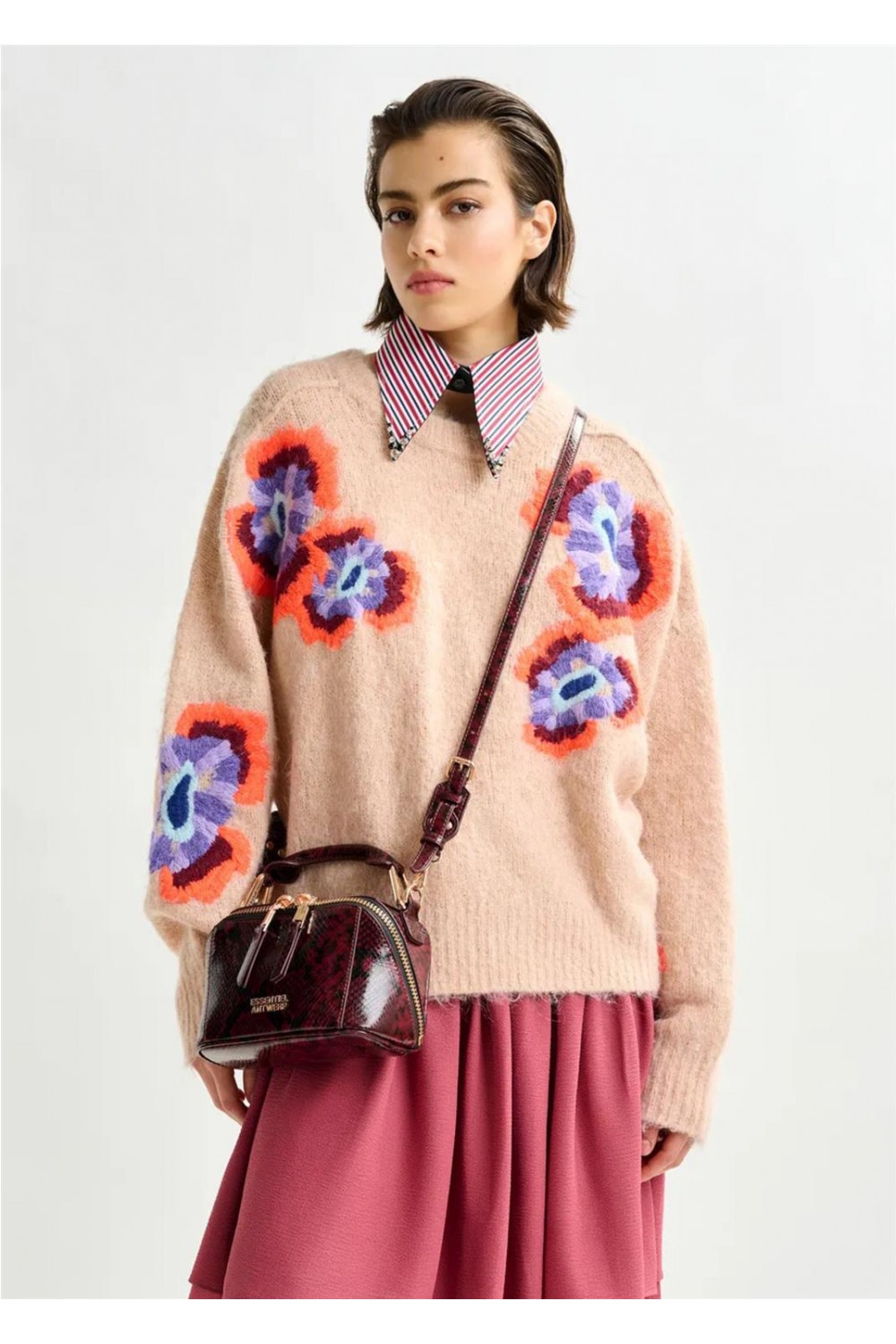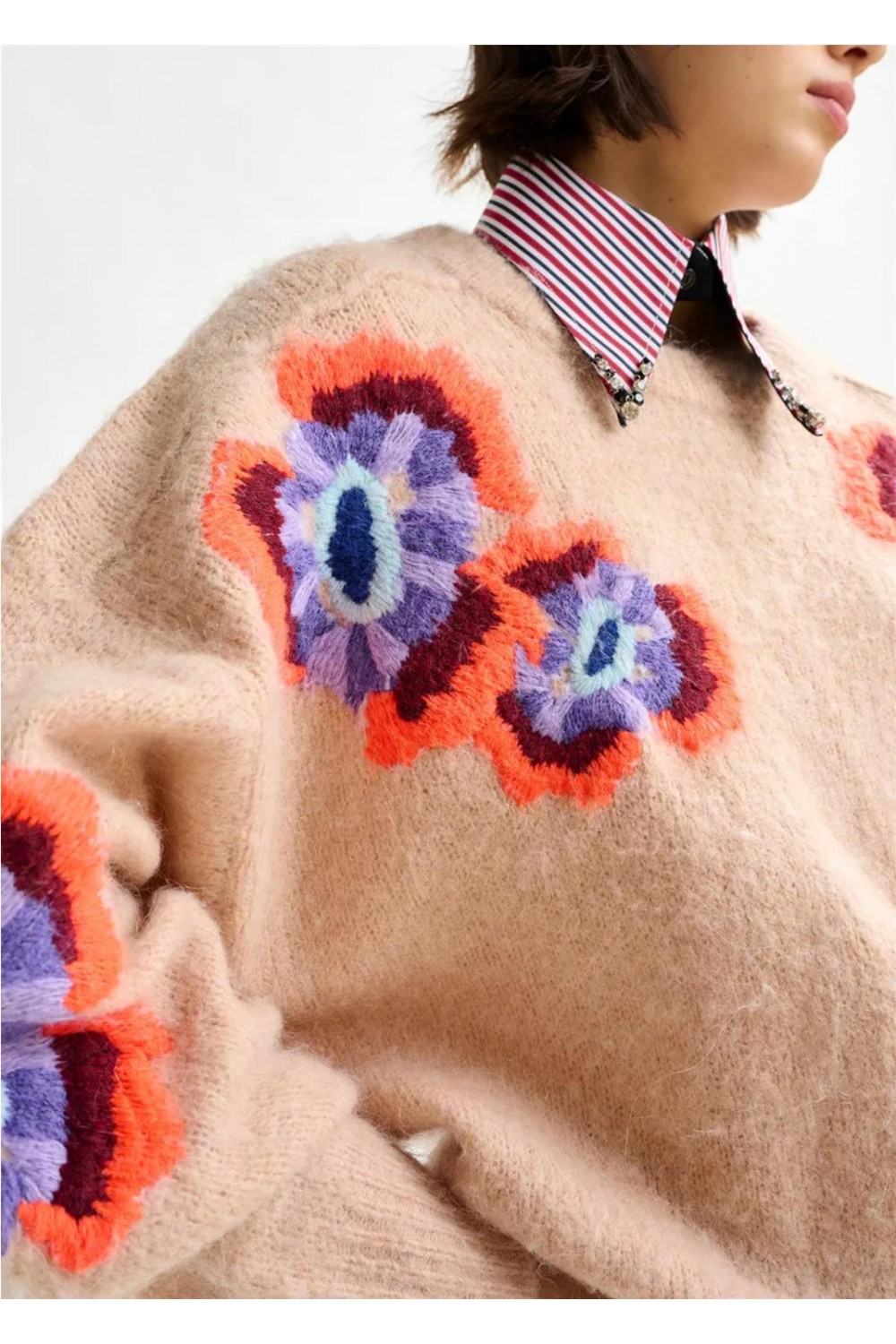 Jersey de punto estilo jacquard, hilado con una mezcla de mohair y lana cepillada, lo que le confiere una textura suave. El diseño de flores por toda la prenda y su ajuste relajado, con hombros caídos y un corte cuadrado, lo convierten en una pieza destacada ideal para combinar en capas durante el clima frío. Está rematado con puños y bajo acanalados. Composición: 49% acrílico, 17% poliamida, 16% mohair, 16% lana, 2% elastano. Bordado: 57% acrílico, 29% poliamida, 7% viscosa, 7% lana.
