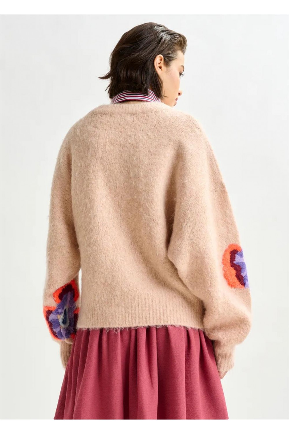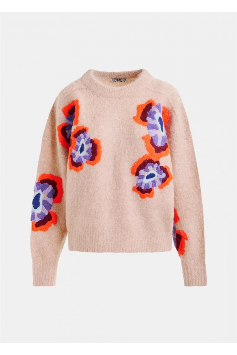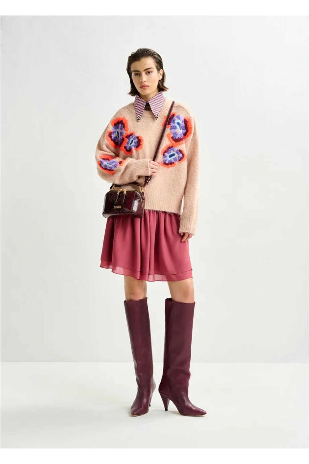 Jersey de punto estilo jacquard, hilado con una mezcla de mohair y lana cepillada, lo que le confiere una textura suave. El diseño de flores por toda la prenda y su ajuste relajado, con hombros caídos y un corte cuadrado, lo convierten en una pieza destacada ideal para combinar en capas durante el clima frío. Está rematado con puños y bajo acanalados. Composición: 49% acrílico, 17% poliamida, 16% mohair, 16% lana, 2% elastano. Bordado: 57% acrílico, 29% poliamida, 7% viscosa, 7% lana.