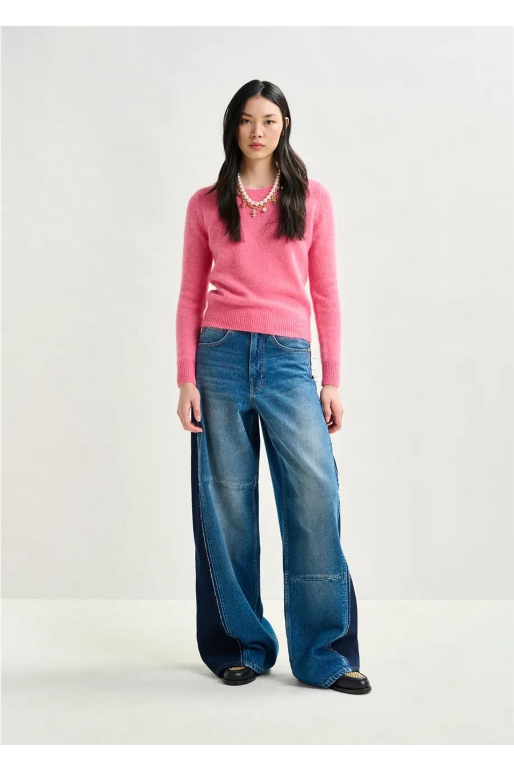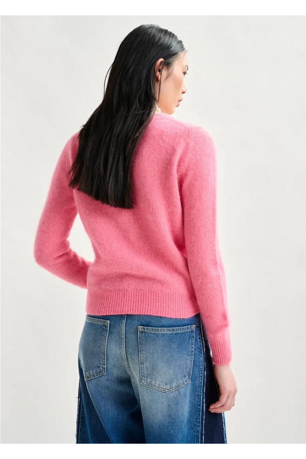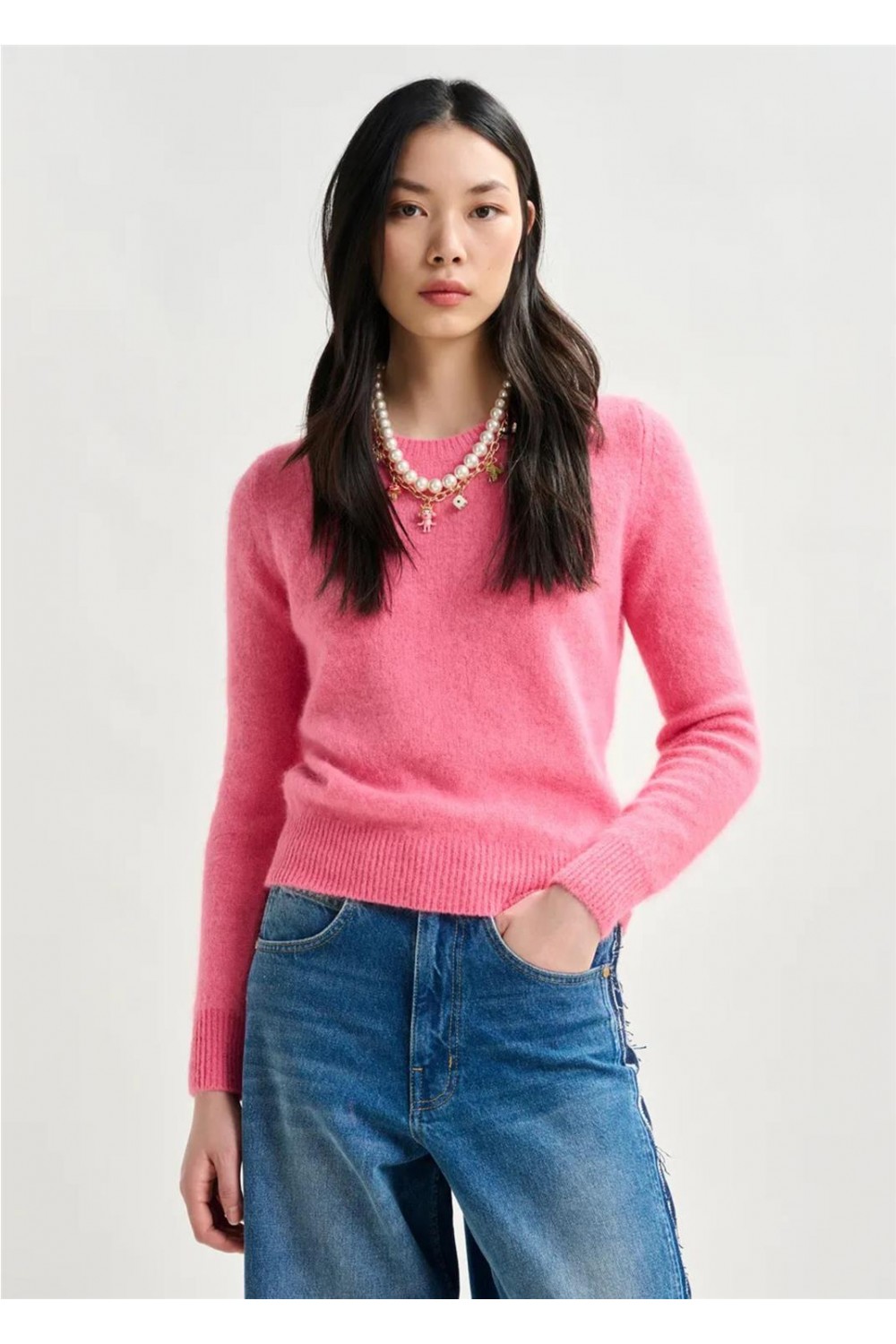 Jersey de punto fino, fabricado en Italia con una suave mezcla de lana de angora. Su silueta es relajada y está rematado con puños y bajo acanalados, convirtiéndolo en un diseño clásico y versátil con infinitas posibilidades de estilo. Es un punto de peso medio, ideal para cualquier ocasión. Composición: 70% lana de angora, 20% poliamida, 10% lana.