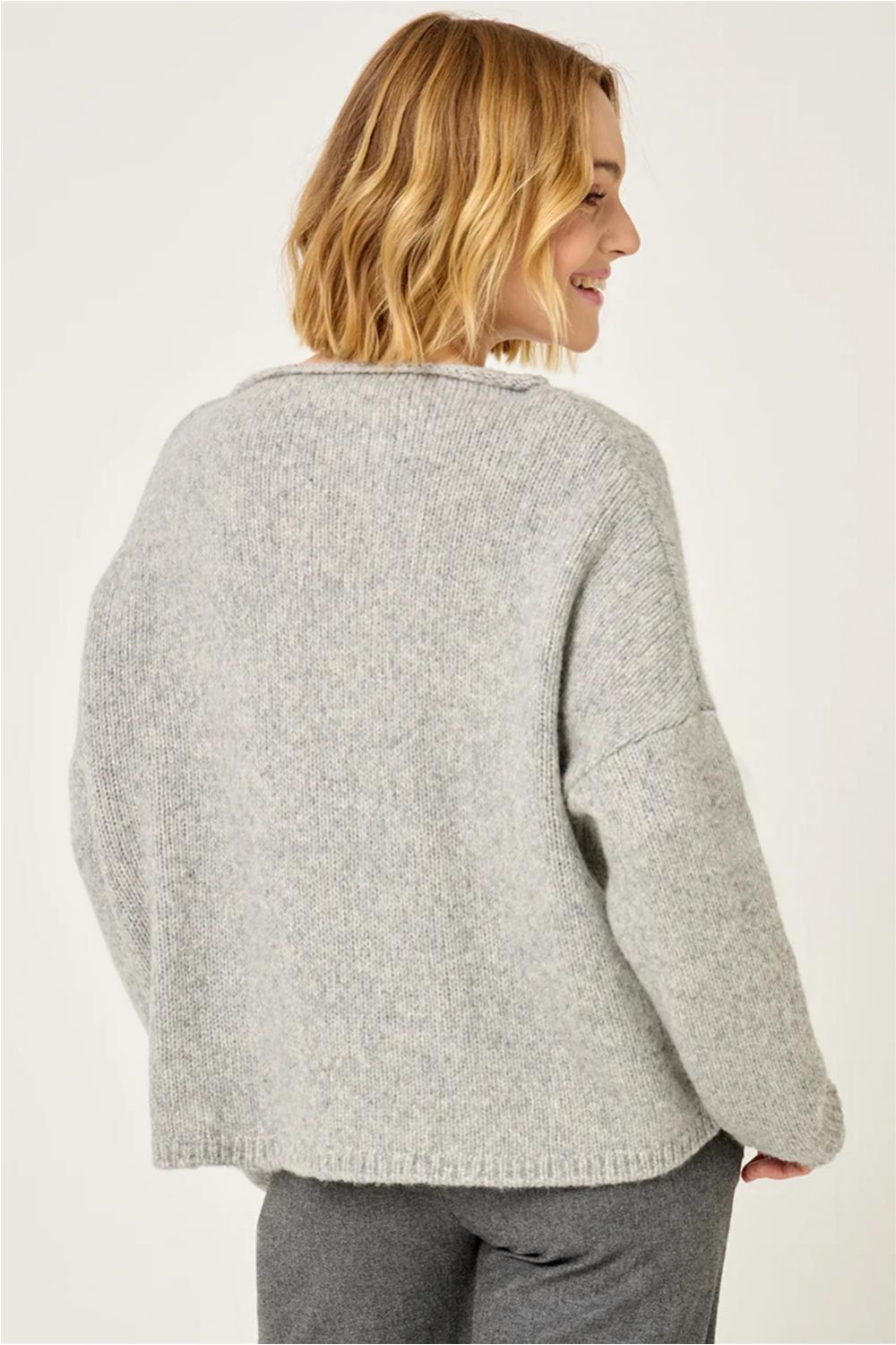 Jersey de punto liso con un corte recto y mangas largas, perfecto para un look cómodo y actual. Presenta un clásico escote redondo y sisa recta, e incorpora dos discretos bolsillos delanteros que añaden funcionalidad y estilo. Composición: 68% Lana, 17% CO2, 15% Nylon.