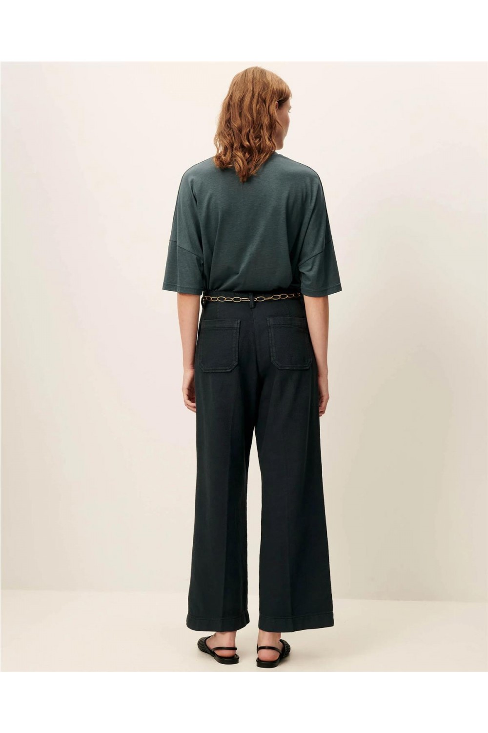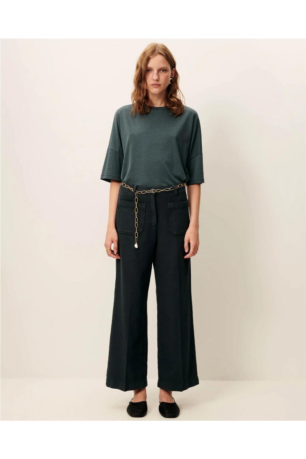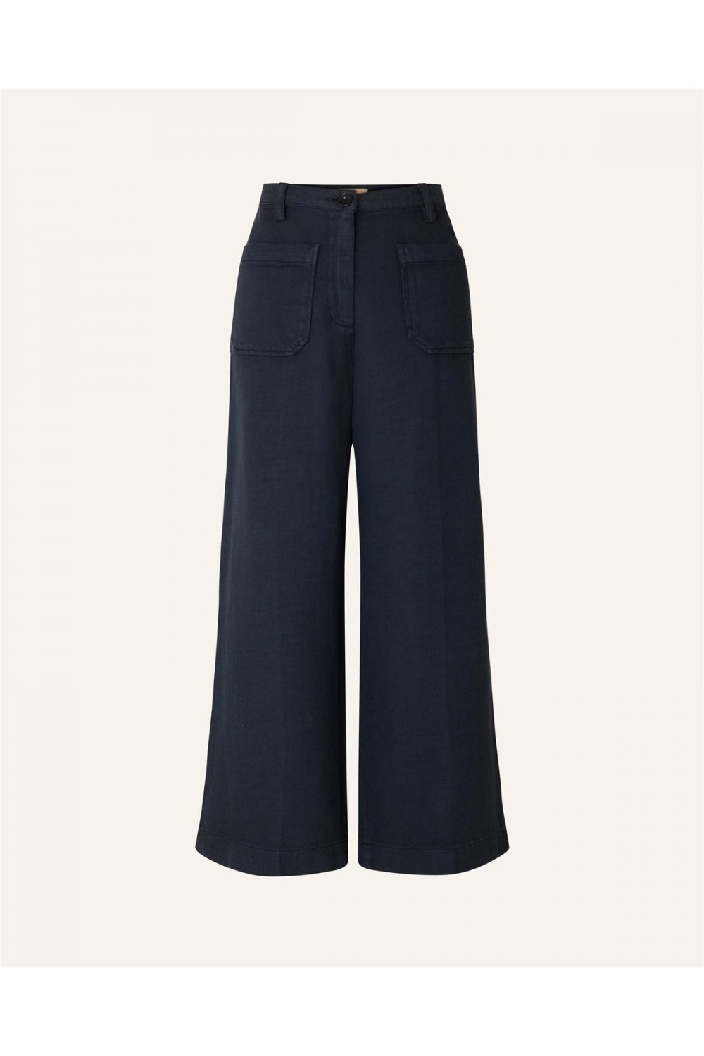 Este pantalón de loneta capri de corte recto está confeccionado en sarga de tricotina de algodón orgánico con certificado GOTS. Presenta un diseño de talle alto con cierre de botón y cremallera oculta, destacando por sus elegantes pliegues marcados a lo largo de la pernera. Incluye bolsillos de parche delanteros y traseros con doble pespunte, que le aportan un aire moderno y sofisticado. Es una prenda cómoda y sostenible, perfecta para completar cualquier look diario. Composición: 100% Algodón.
