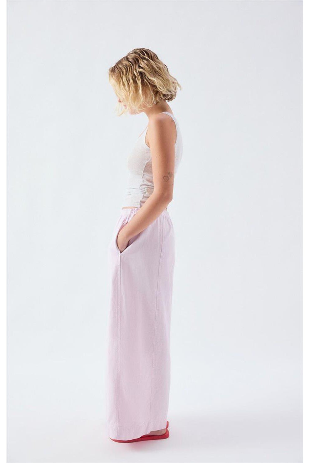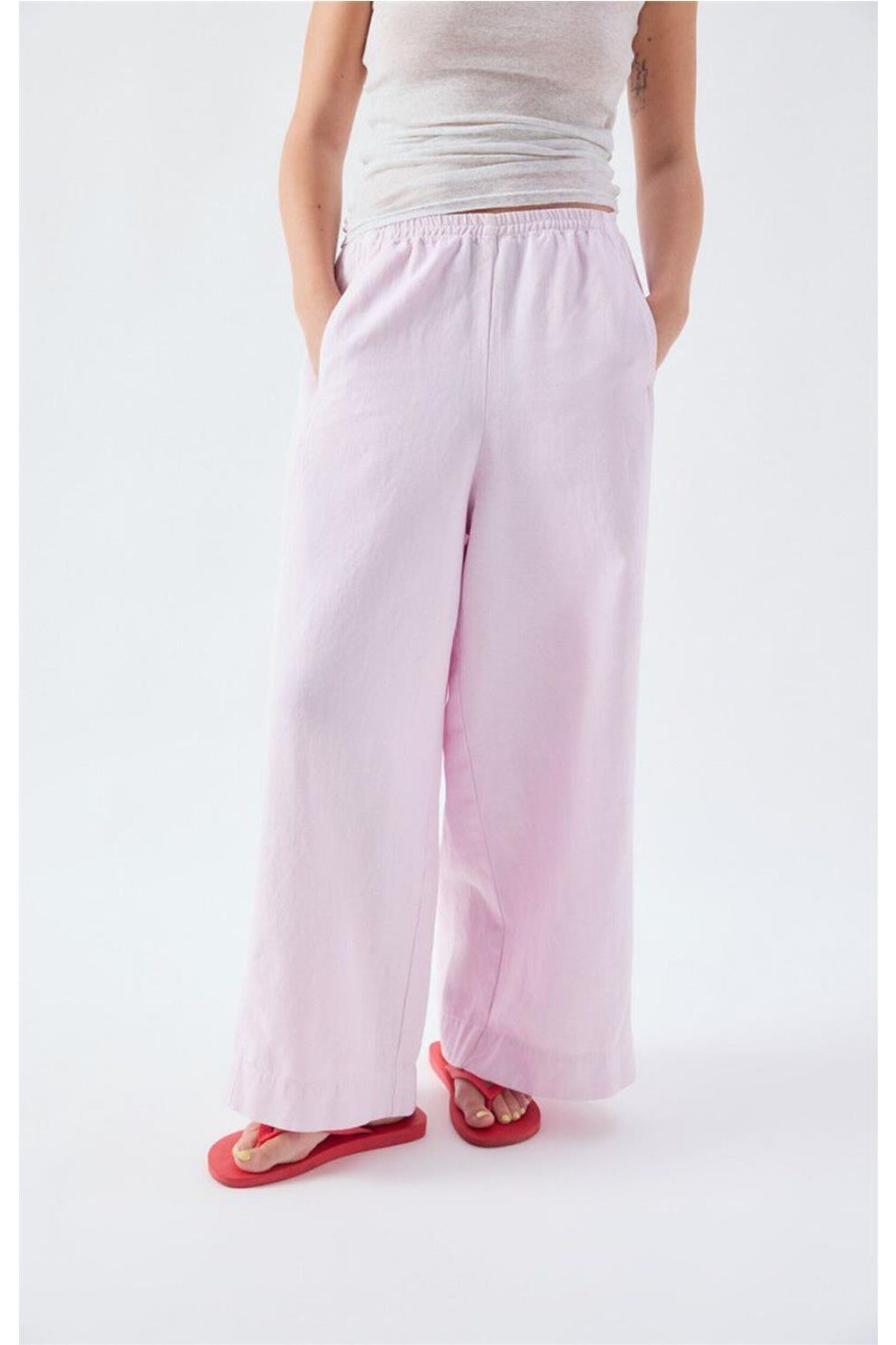 Este pantalón de loneta de corte ancho y largo 7/8 moderniza el estilo de trabajo con un enfoque urbano. Su tejido de sarga firme y densa proporciona una caída estructurada y gran resistencia. La cintura elástica garantiza un ajuste cómodo, mientras que los bolsillos laterales añaden funcionalidad. Con un patrón holgado y actual, es una prenda ideal para lograr un conjunto relajado y con carácter que se adapta a cualquier plan diario. Composición: 80% algodón, 20% lino.