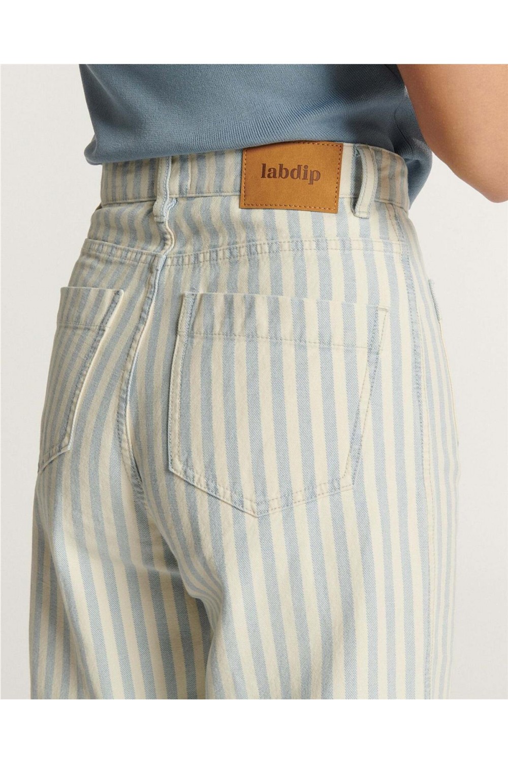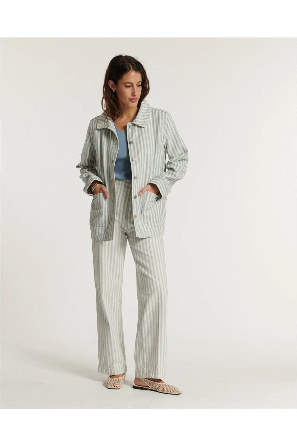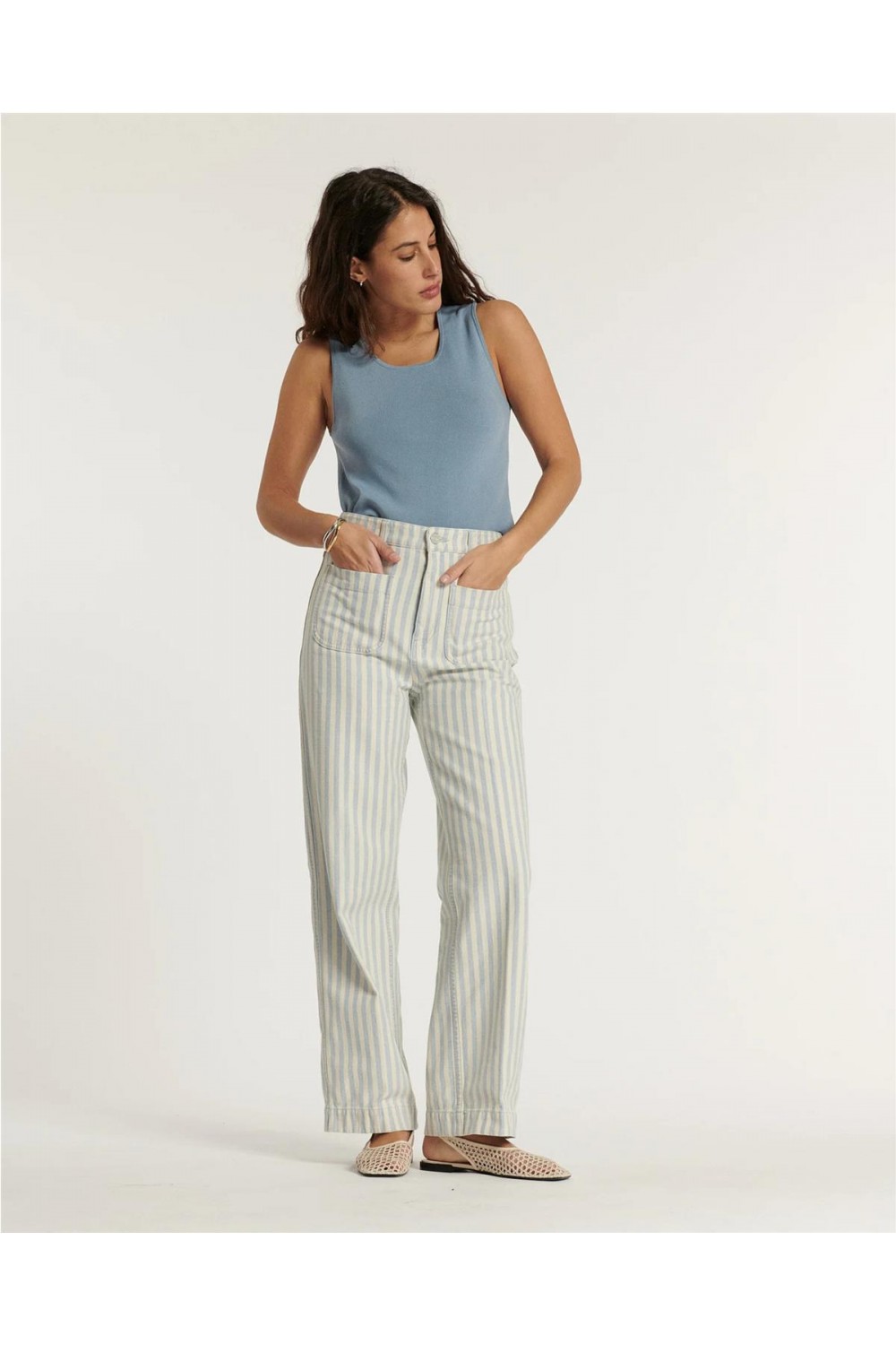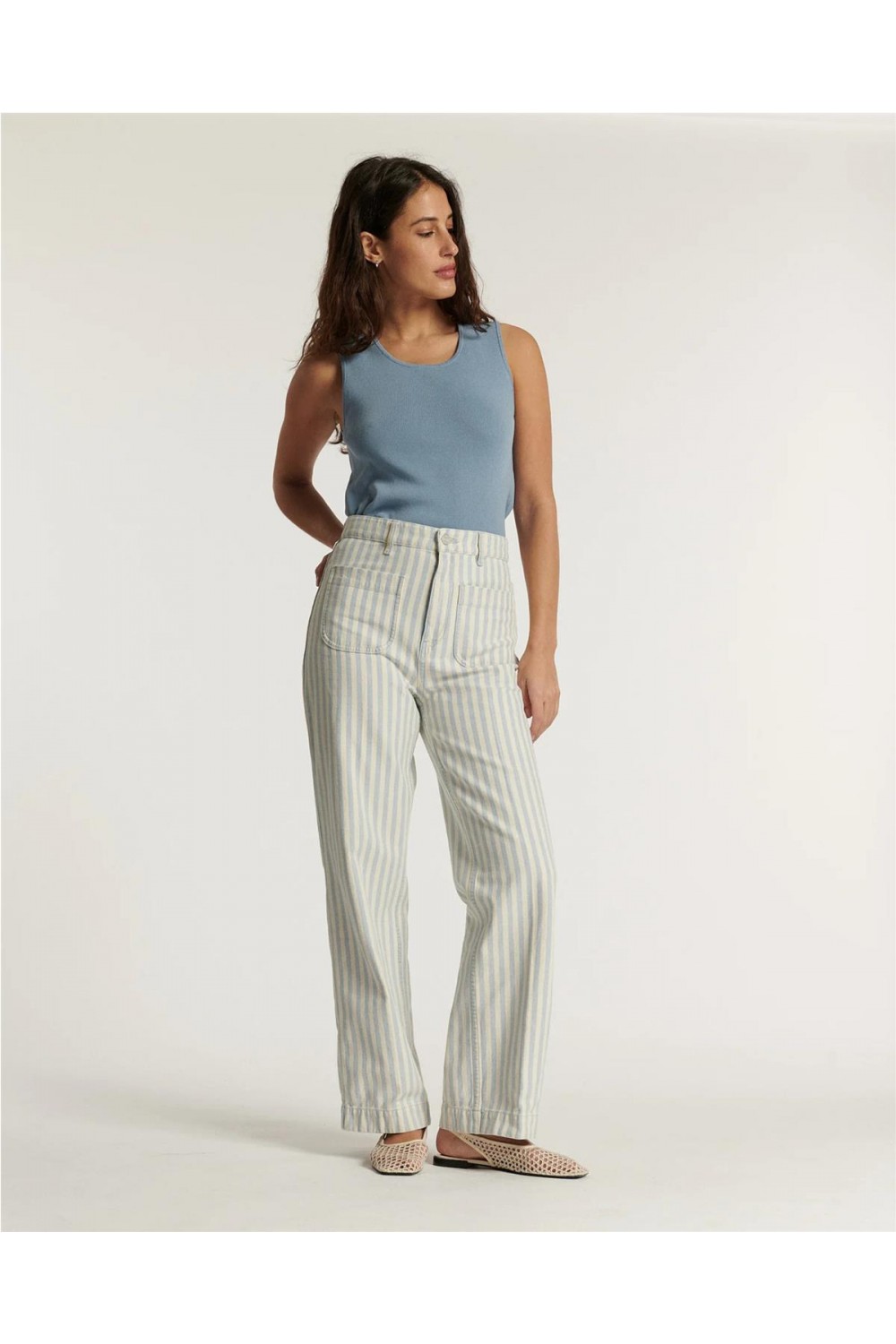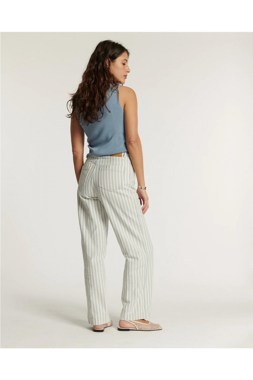 Este pantalón de loneta de talle alto destaca por su aire retro inspiración años 70 y su favorecedora pernera ancha que alarga la silueta. Confeccionado en algodón, presenta finas franjas gráficas en tono azul índigo suavizado. El diseño incluye bolsillos de parche delanteros y traseros, cierre de cremallera y un largo al tobillo, logrando un equilibrio perfecto entre un estilo desenfadado y una estructura sofisticada de inspiración marinera. Composición: 100% Algodón.