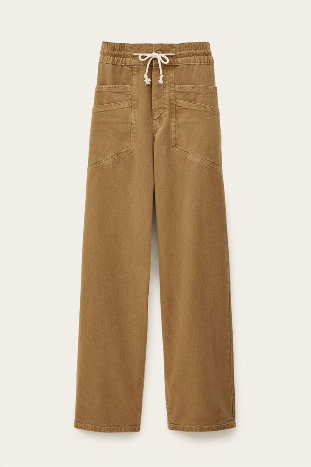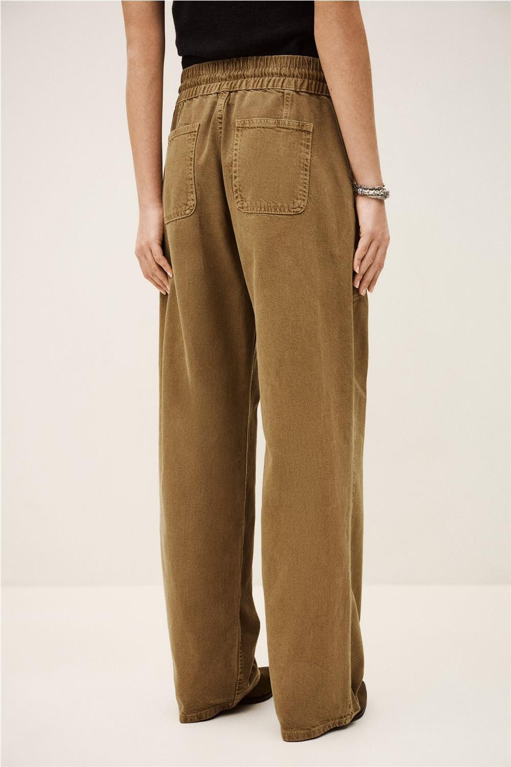 Este pantalón de loneta, confeccionado en una mezcla de algodón orgánico y lino, destaca por su diseño de talle alto con cintura elástica para un ajuste perfecto. Presenta una bragueta con botón, un práctico cordón para atar y amplios bolsillos de parche delanteros que aportan un aire funcional y moderno. Gracias a su tejido natural y transpirable, esta pieza se convierte en un básico esencial y sostenible para completar looks cotidianos con estilo y comodidad. Composición: 90% Algodón, 10% Lino