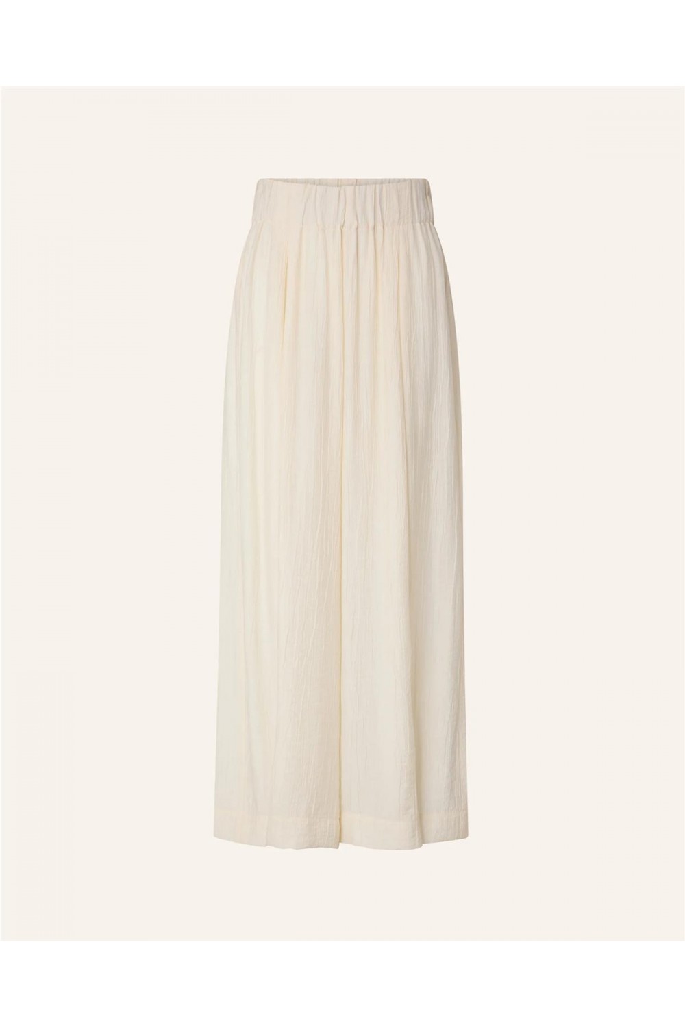 Este pantalón de vestir capri amplio destaca por su tejido de crespón milrayas flexible en viscosa ECOVERO™ y poliamida reciclada. Su diseño de talle alto elástico garantiza comodidad, mientras que los pliegues inclinados bajo la cintura y los bolsillos en las costuras laterales le confieren una silueta fluida y relajada. Es una prenda ligera y ecorresponsable, ideal para un estilo sofisticado y consciente. Composición: 83% Viscosa, 17% Poliamida.